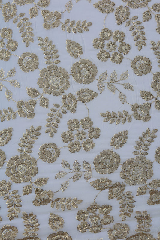 White Floral Embroidered Fabric with Gold Sequin Detailing