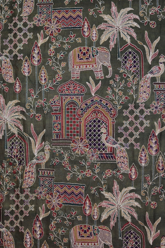 Green Majestic Meadow Viscose Chinon Embroidered Fabric