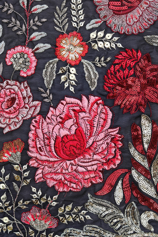 Black Majestic Meadow Viscose Chinon Embroidered Fabric