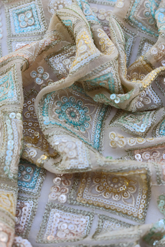 Pastel Multi-Color Square Embroidered Sequin Fabric