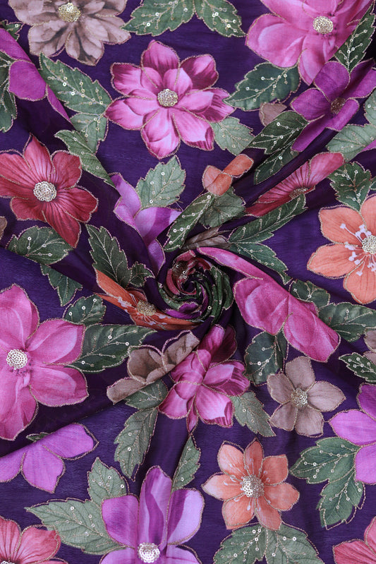Bold Bloom Sequin Embroidered Purple Chinon Fabric