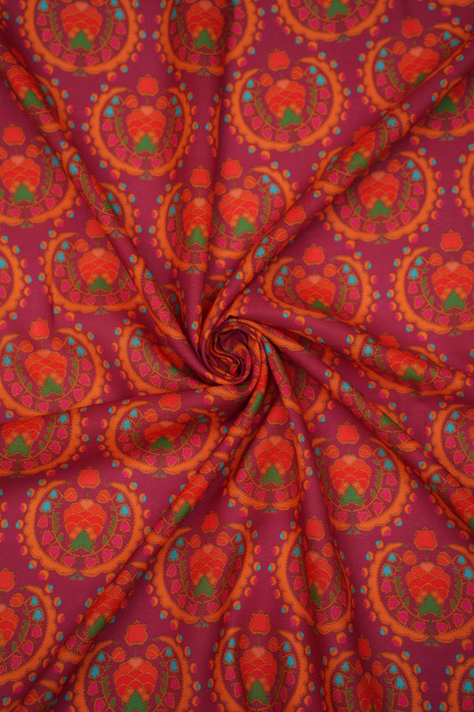 Coral Chrysanthemum Pink Linen Floral Printed Fabric