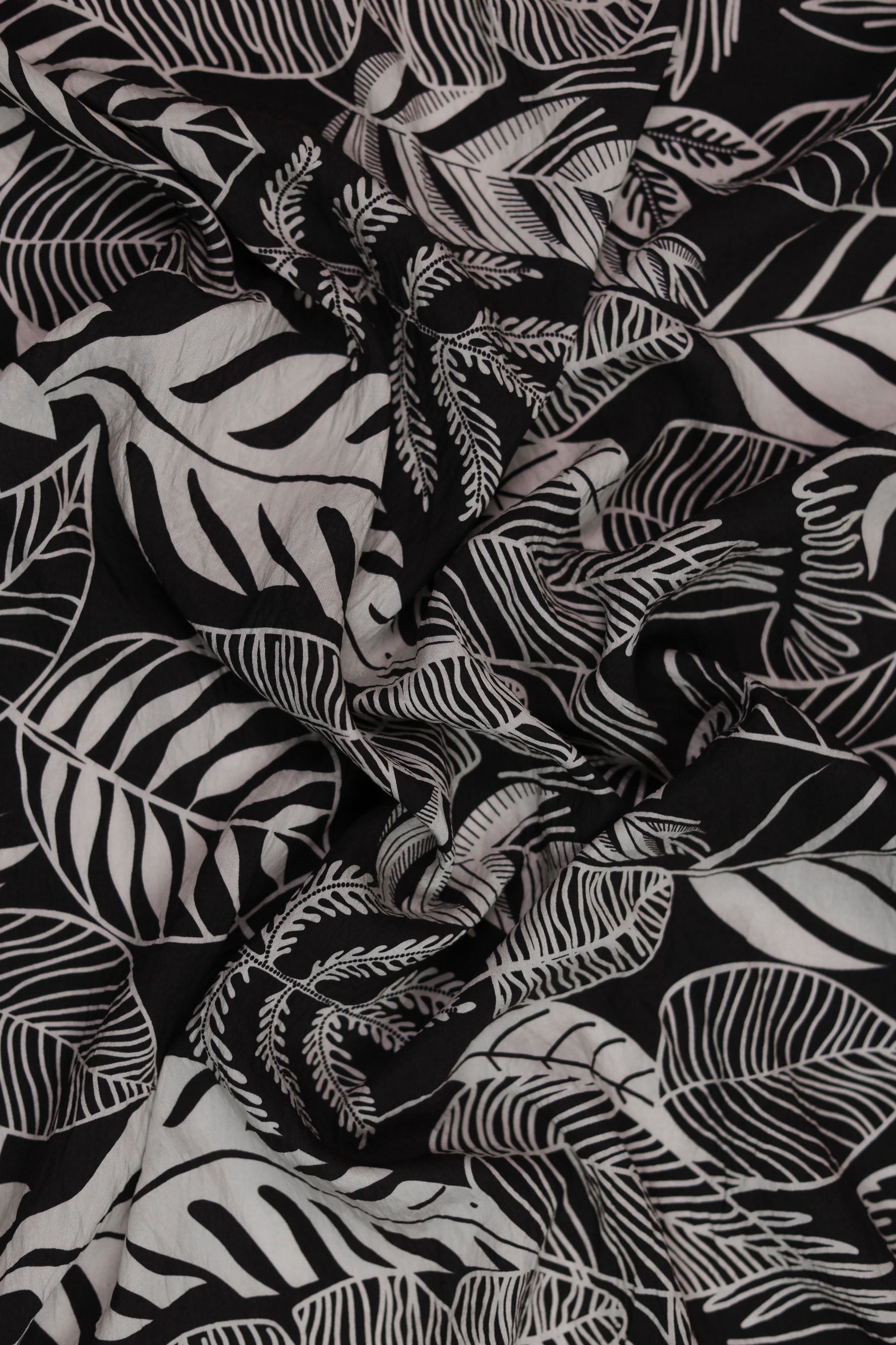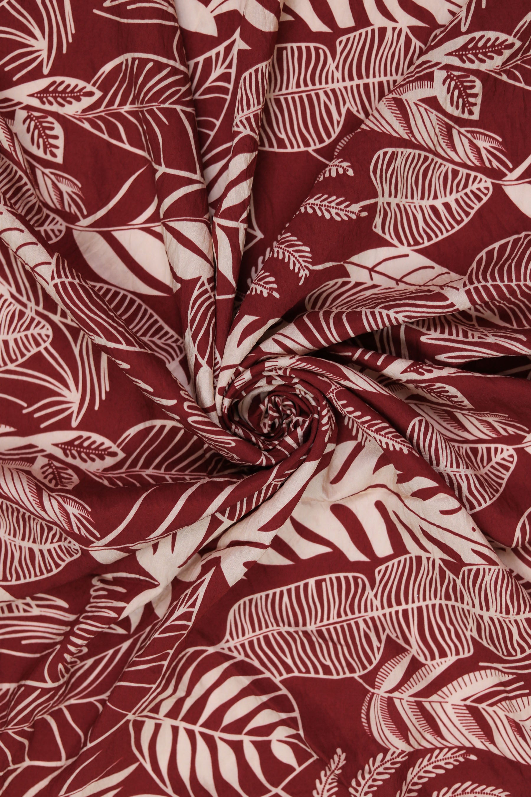 This fabric features a deferent color base with bold, cream tropical leaf motifs, creating a fresh, earthy yet exotic appeal. It’s perfect for those who love nature-inspired prints with a touch of modernity. The luxurious blend of 85% pure viscose and 15% nylon gives it an ultra-soft hand feel, excellent breathability, and a graceful fall. Its subtle sheen and natural flow make it an excellent choice for contemporary and ethnic styles alike.