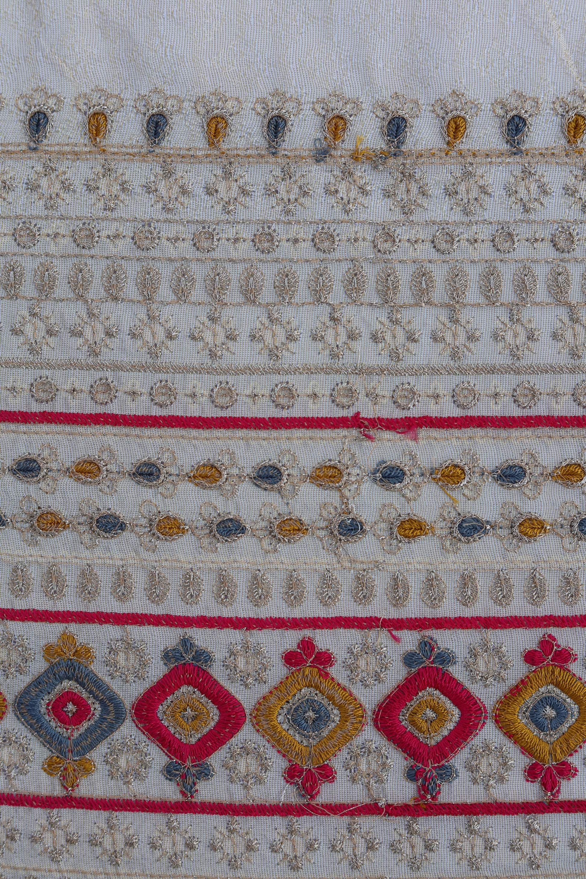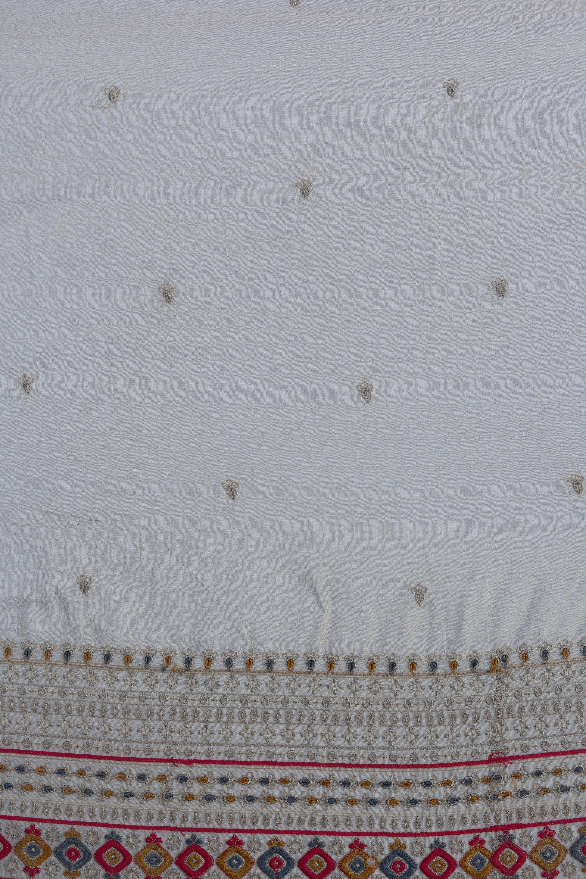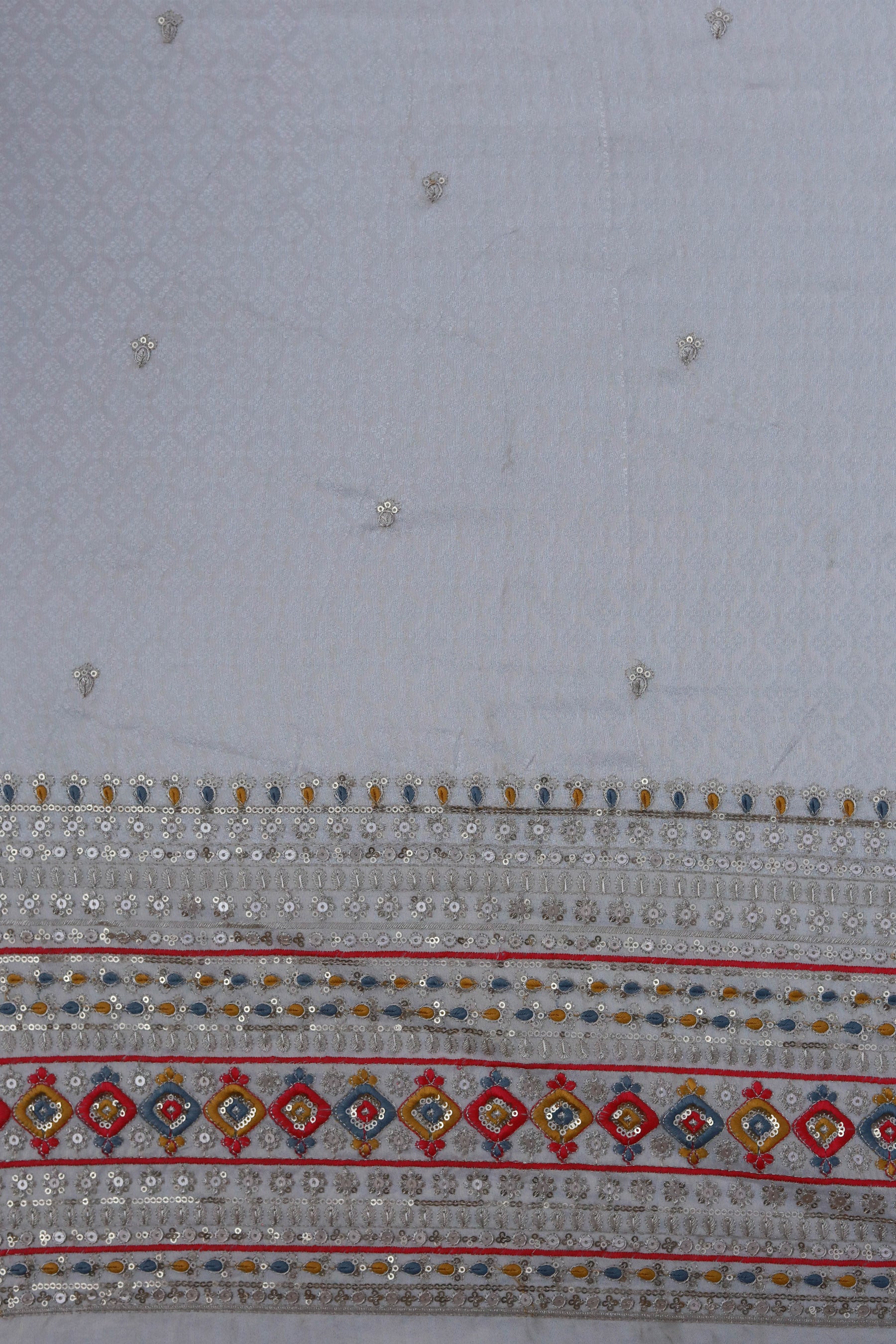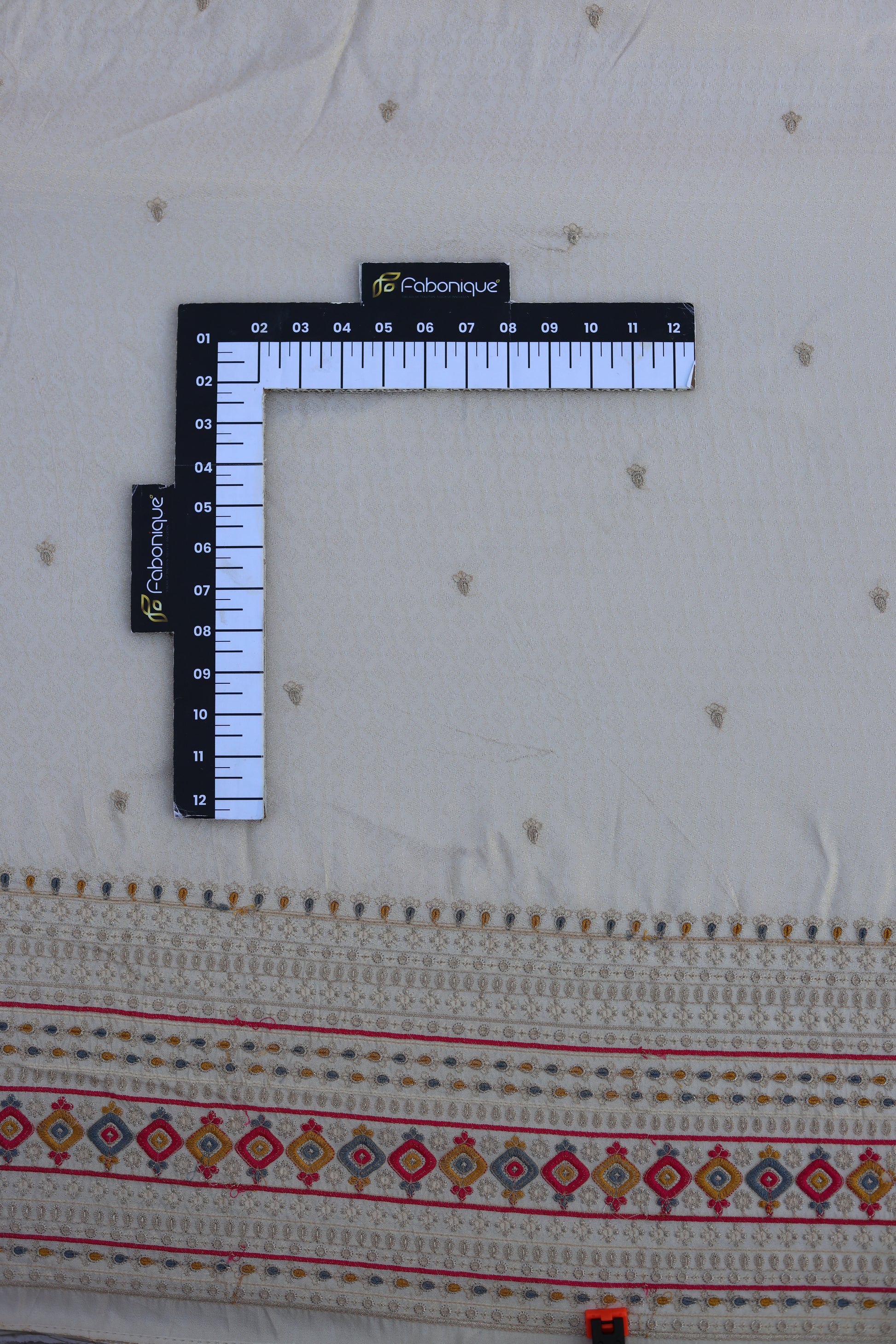 Elevate your designs with this luxurious brocade fabric featuring an intricate diamond motif base. Highlighted with a vibrant multicolor embroidered border adorned with mirror work, sequins, and vivid thread detailing in shades of pink, yellow, and blue. This fabric is a perfect choice for creating striking festive outfits or home decor pieces with a touch of tradition and elegance