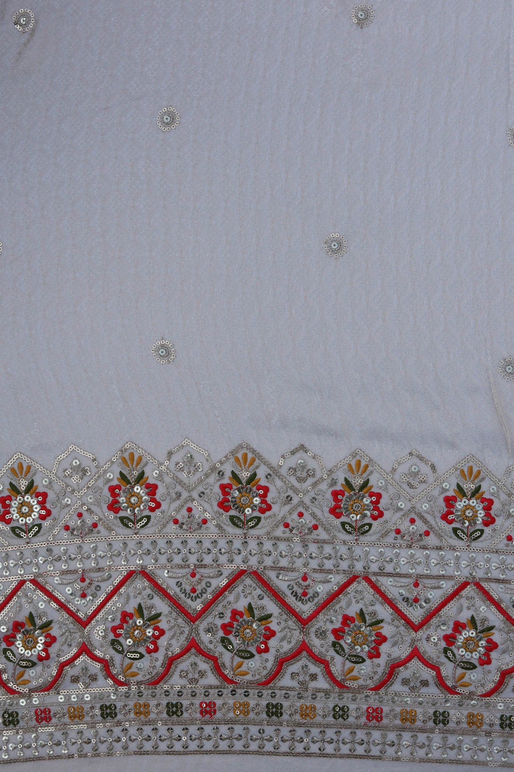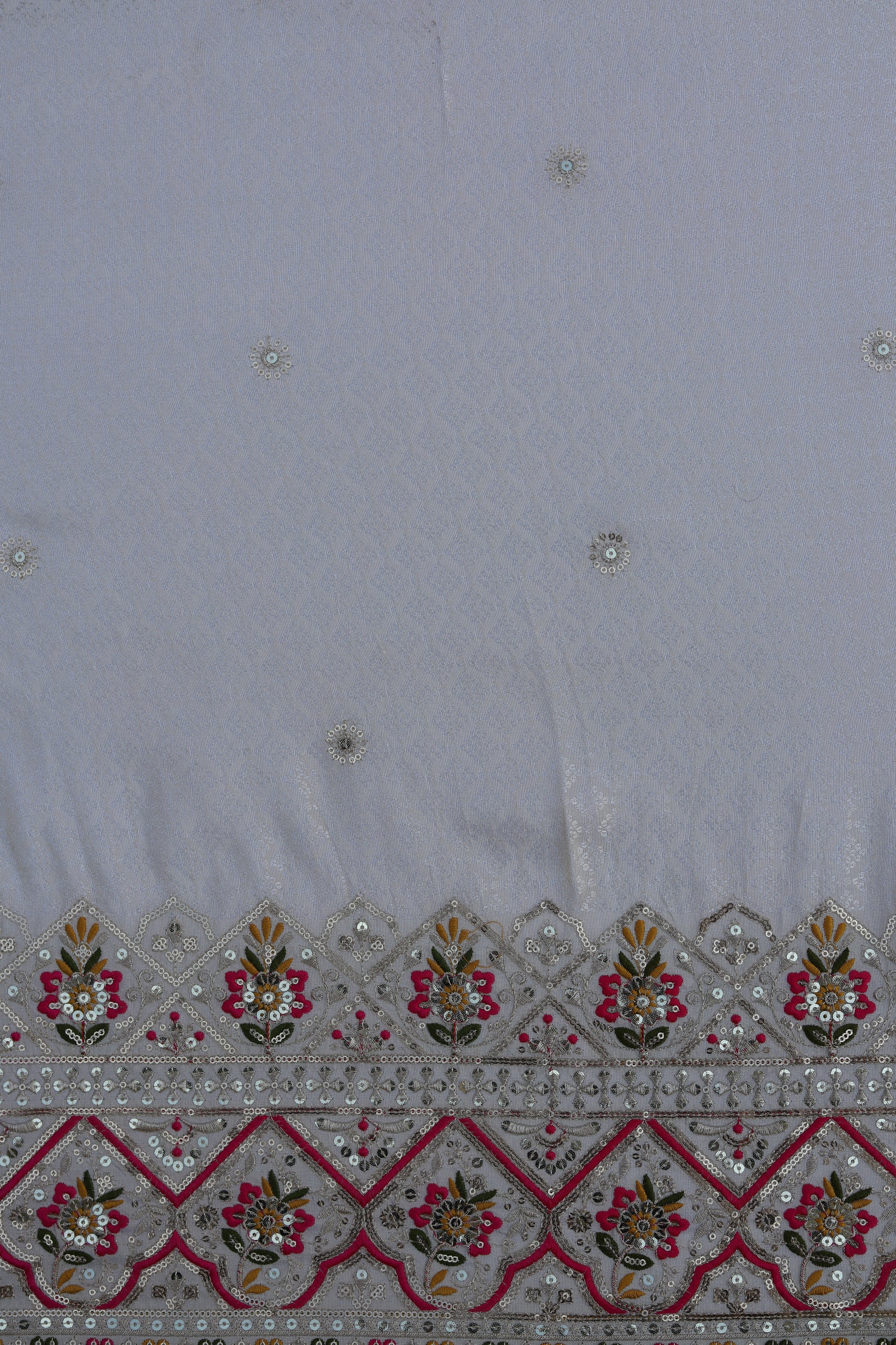 This exquisite fabric boasts a delicate brocade base with a subtle geometric pattern throughout. The standout feature is the vibrant embroidered border adorned with bold floral motifs in bright pink, yellow, and green, further accentuated by shimmering sequins. The combination of intricate embroidery and a lustrous base makes this fabric ideal for creating statement garments and luxurious home décor.