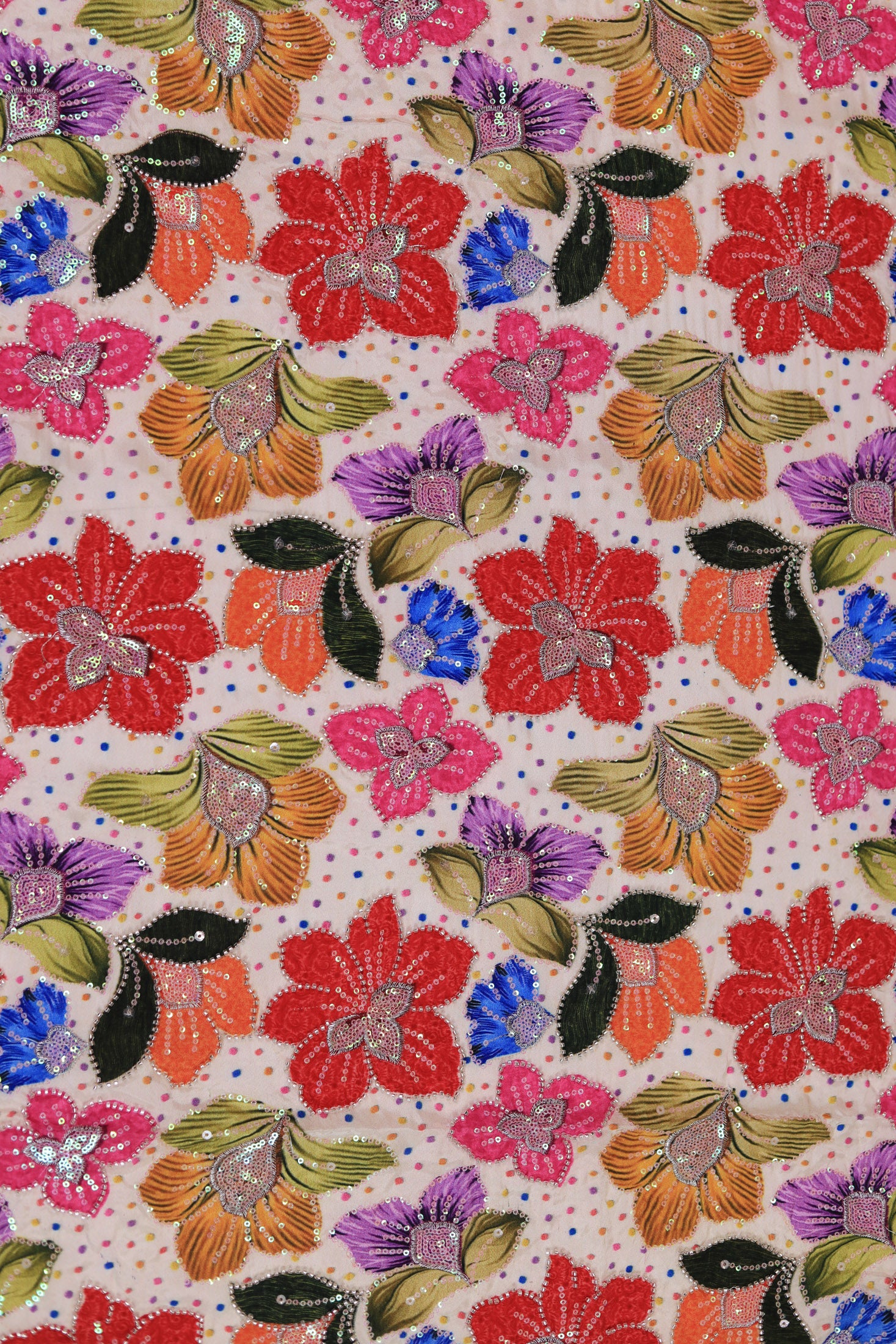 "This vibrant fabric is crafted on a soft beige crepe base, celebrated for its lightweight texture, elegant drape, and smooth finish. It showcases bold and lively floral motifs in shades of red, orange, yellow, purple, green, and blue, beautifully accented with intricate embroidery and shimmering sequin work.