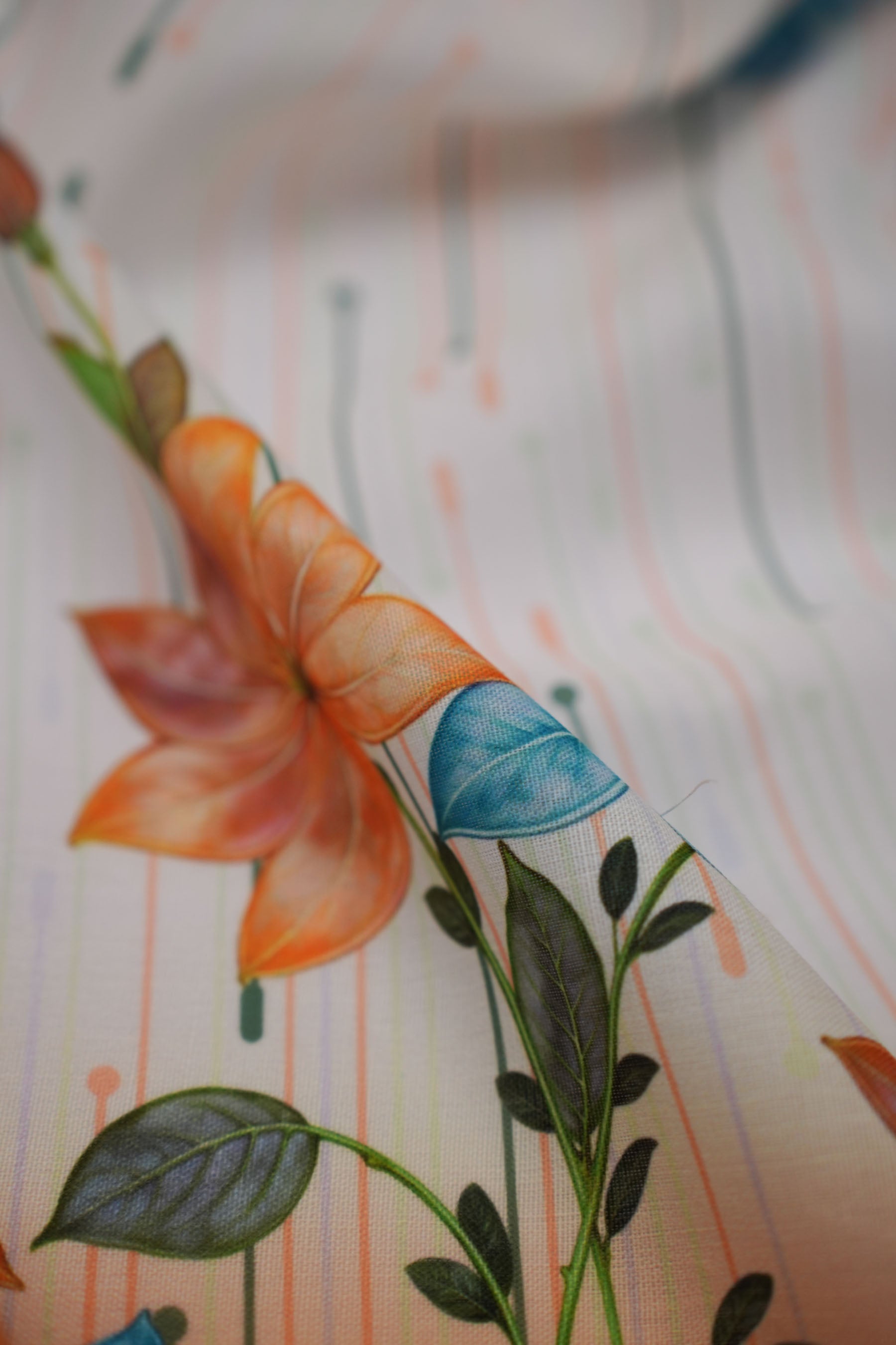 This printed linen fabric features a light ivory-to-pink gradient base with a delicate rainfall effect created by pastel vertical lines ending in droplets. The lower section is decorated with large, hand-painted style flowers in coral pink, crimson red, and aqua blue with leafy accents, arranged in a way that mimics a blooming garden after rain.