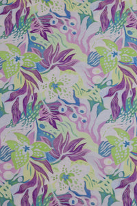 This fabric features a vibrant floral print in shades of purple, green, blue, and white,