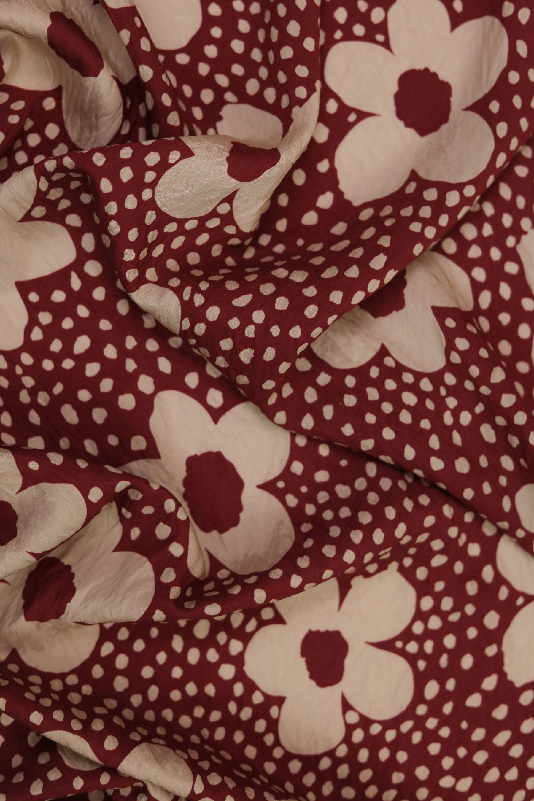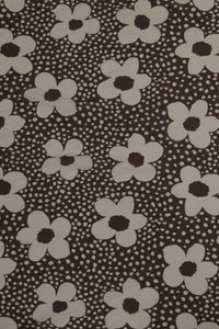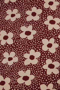 This fabric features a rich deferent color base adorned with oversized cream floral motifs and playful scattered dots, creating a bold yet elegant appeal. The combination of earthy neutrals with deep berry tones gives it a chic and contemporary vibe. Crafted with 85% pure viscose and 15% nylon, this fabric offers a buttery soft touch, excellent drape, and a subtle natural sheen, making it ideal for anytime wear.