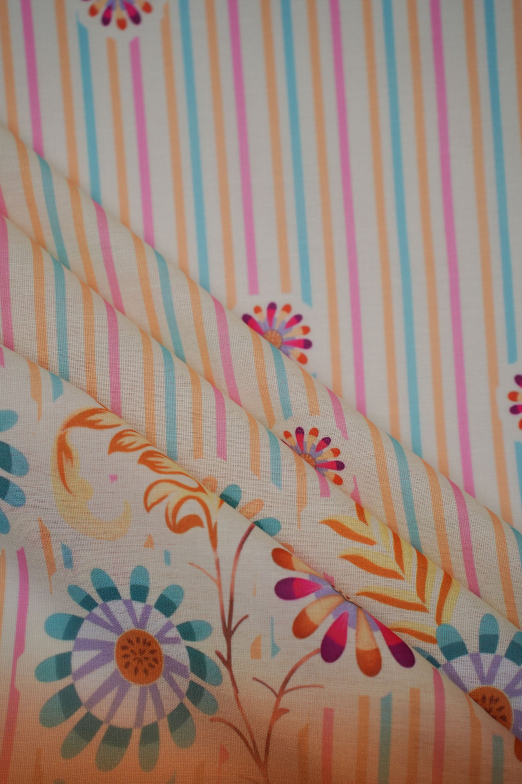 This printed linen fabric combines playful vertical pastel stripes (peach, aqua, yellow, lavender, and pink) with cheerful floral motifs. The lower part features larger, multicolored daisy-like flowers with bold petals in turquoise, magenta, orange, and purple, surrounded by golden leafy details. Scattered smaller flowers rise upward, blending harmoniously with the striped background.