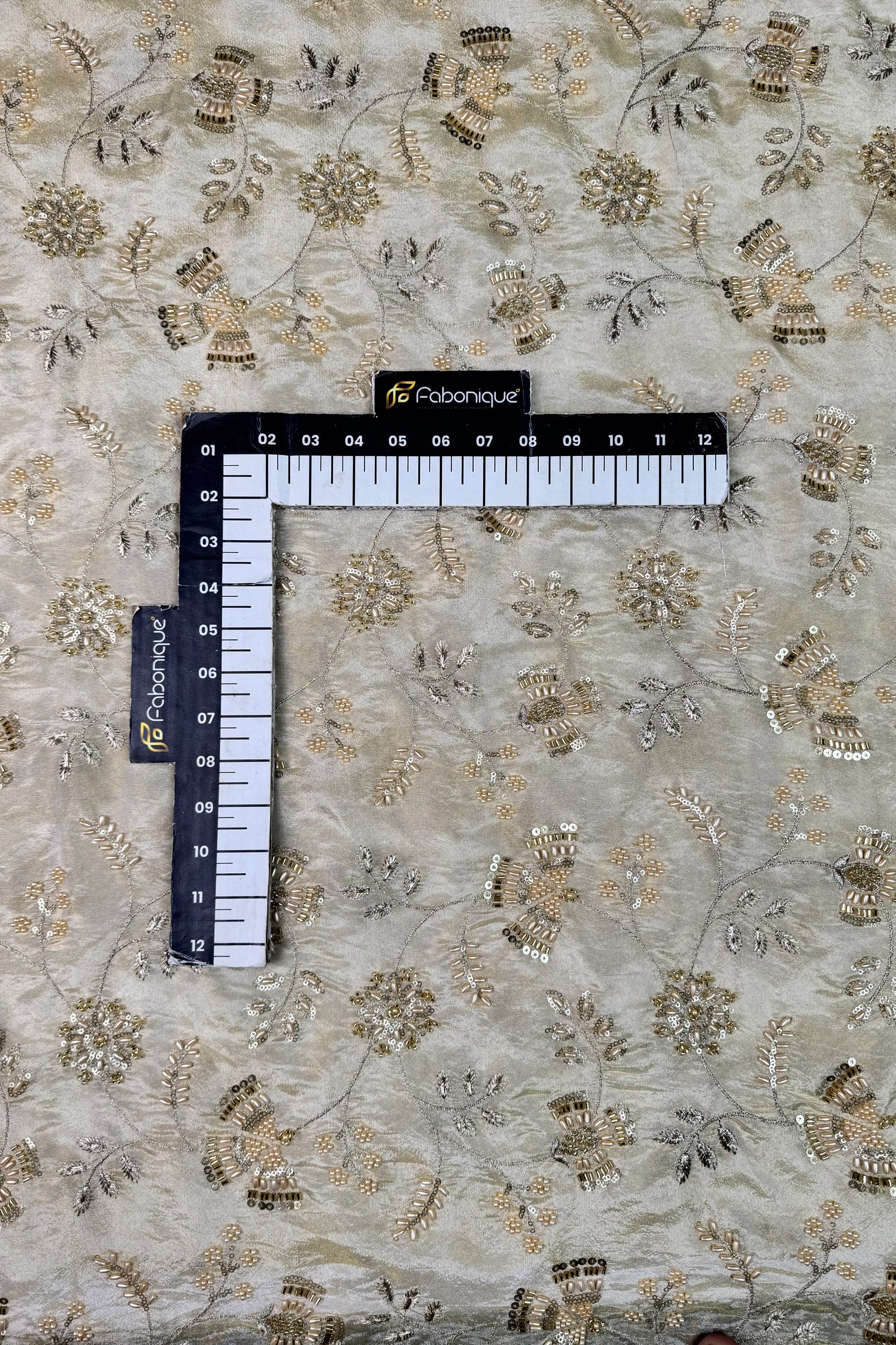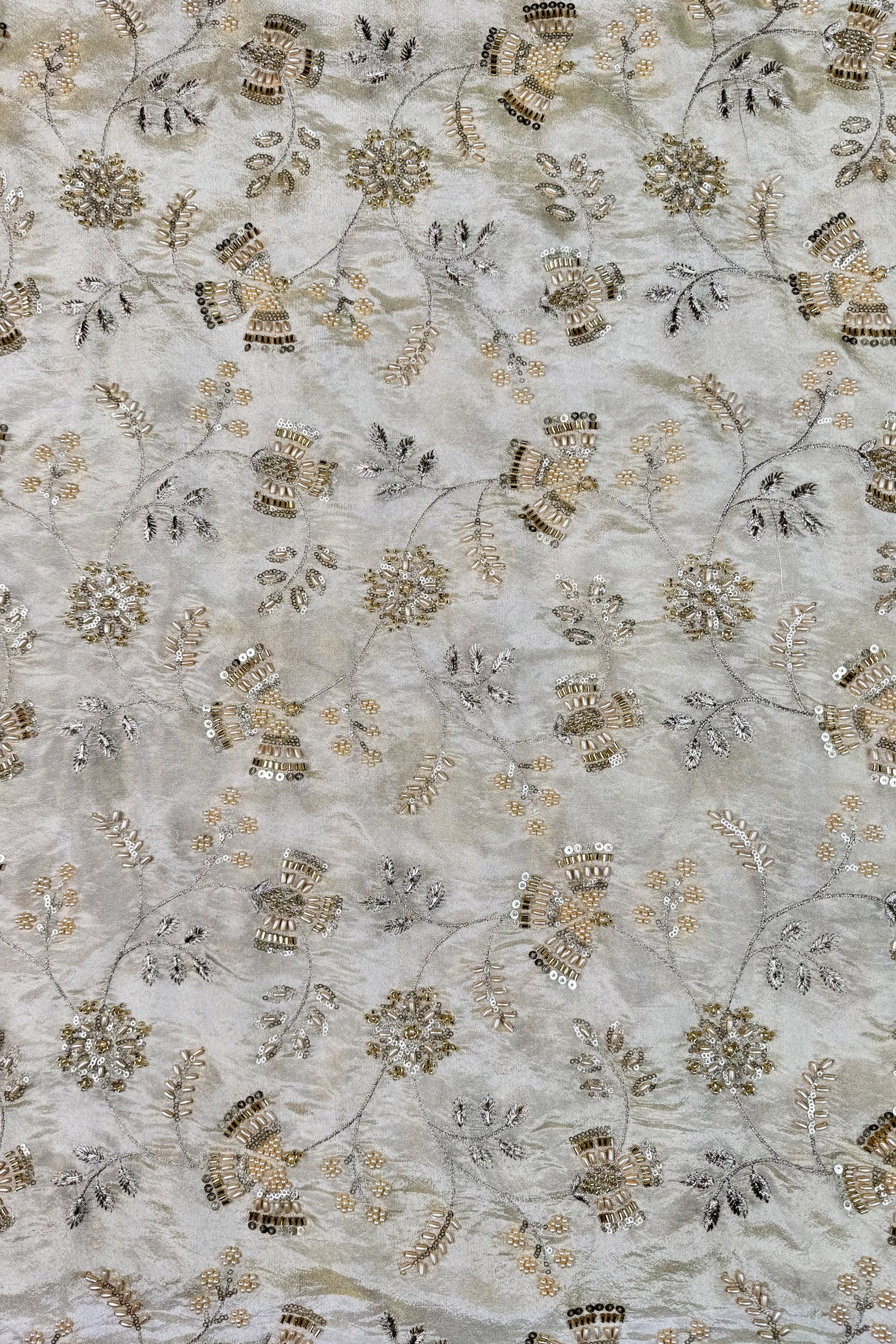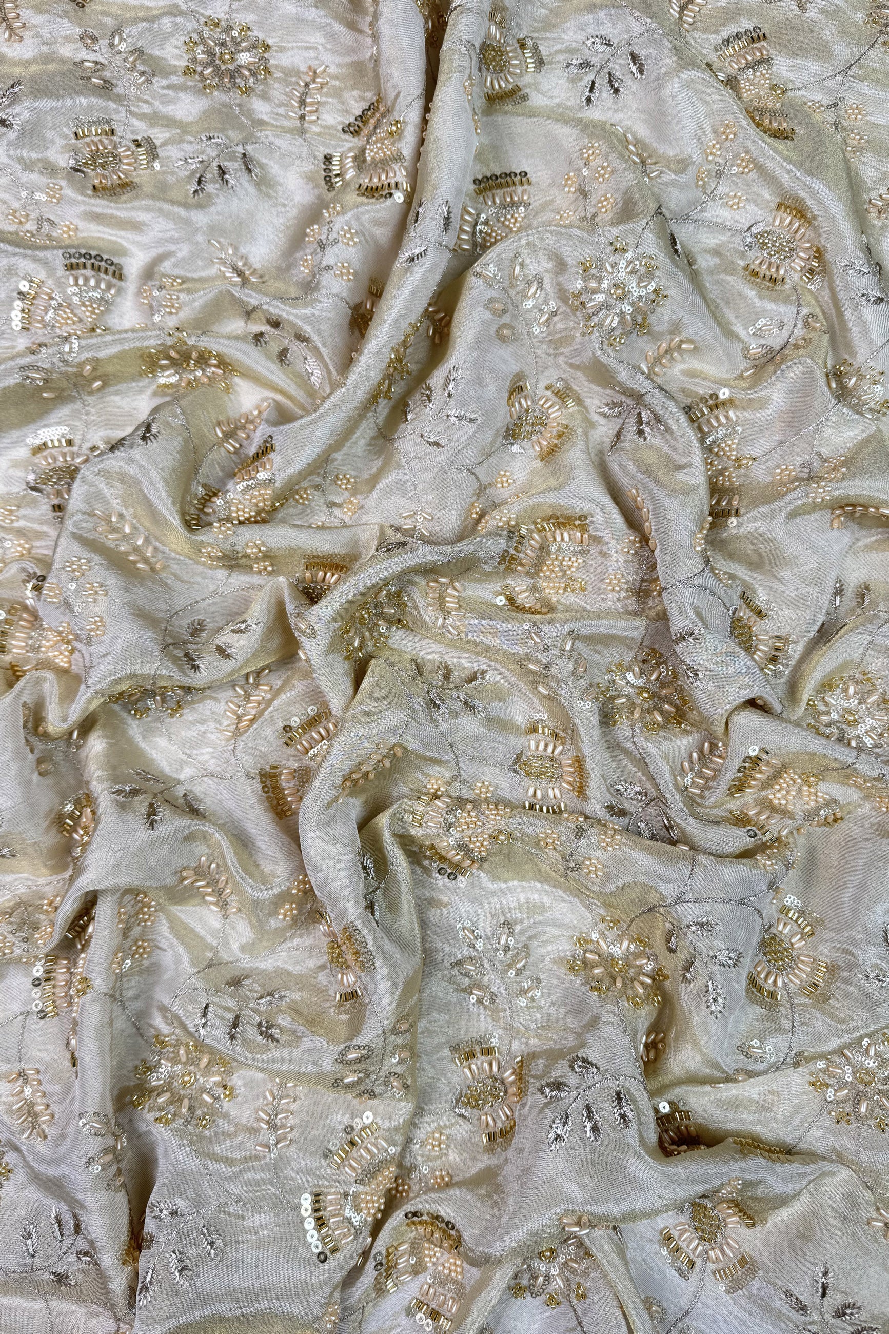 This luxurious fabric is crafted on a champagne gold tissue base, known for its crisp texture and soft metallic sheen that radiates sophistication. It features delicate floral and vine motifs embroidered with fine zari threads, accented with shimmering sequins, tube beads, and pearl-like embellishments in matching champagne and ivory tones. The embroidery is thoughtfully scattered, creating an elegant balance of light shimmer and intricate detailing.