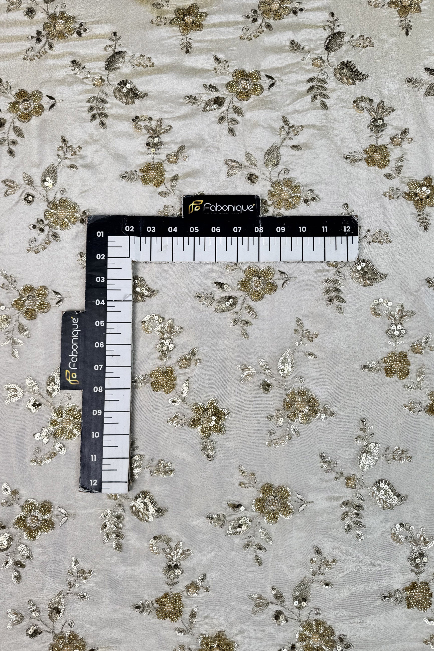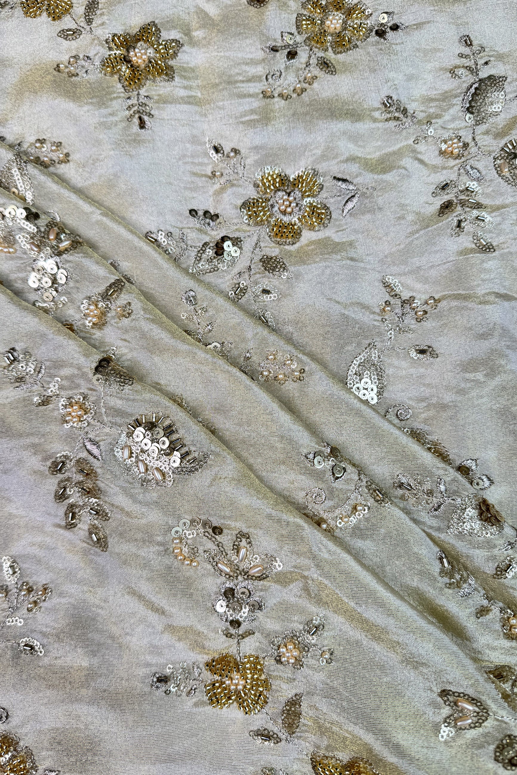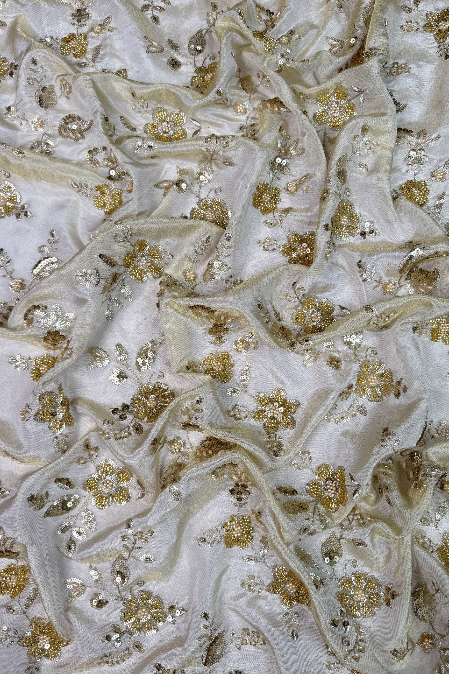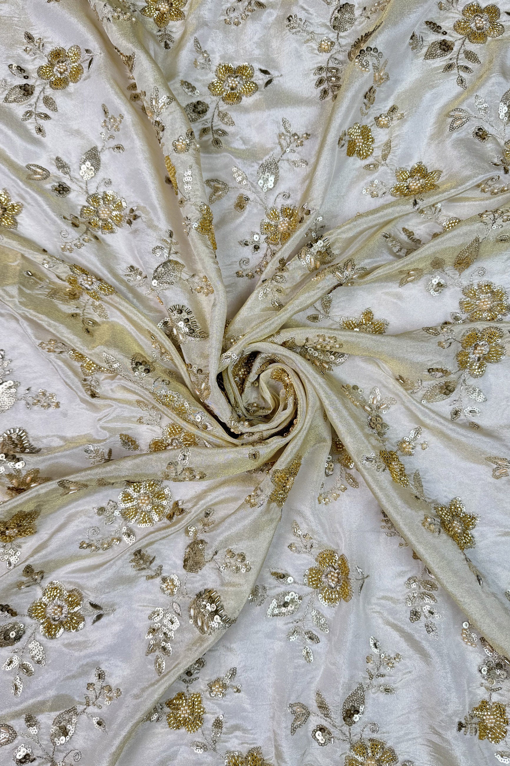 Champagne Gold Floral Hand-Embroidered Tissue Fabric with Sequins & Beads