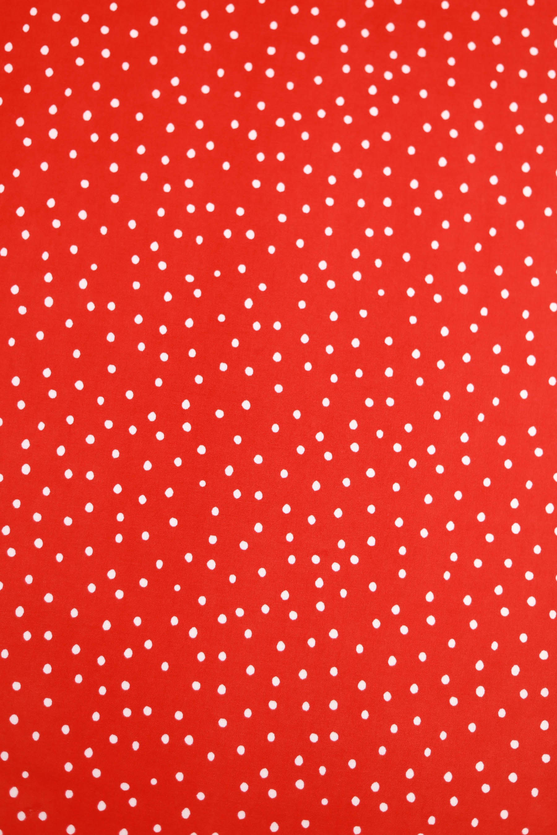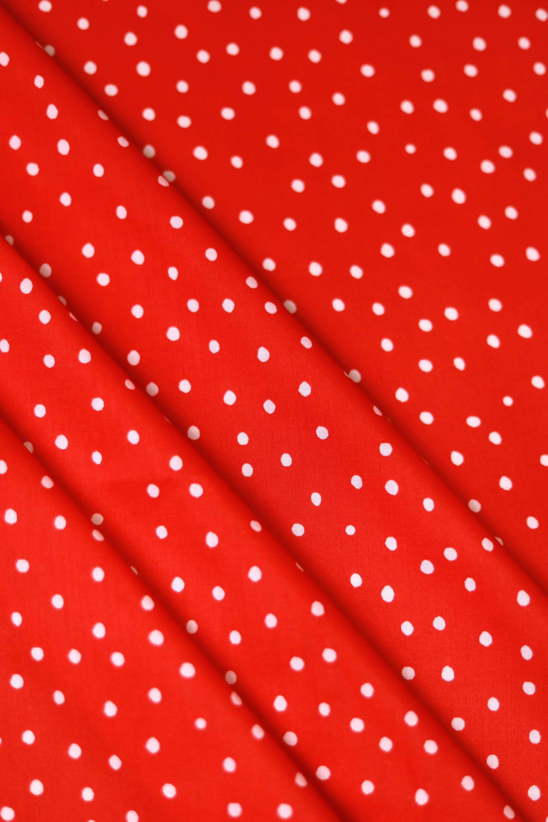 This muslin fabric features a classic polka dot print with tiny white dots scattered across a bright red base. The playful yet timeless pattern brings a retro-chic charm, reminiscent of vintage summer fashion.