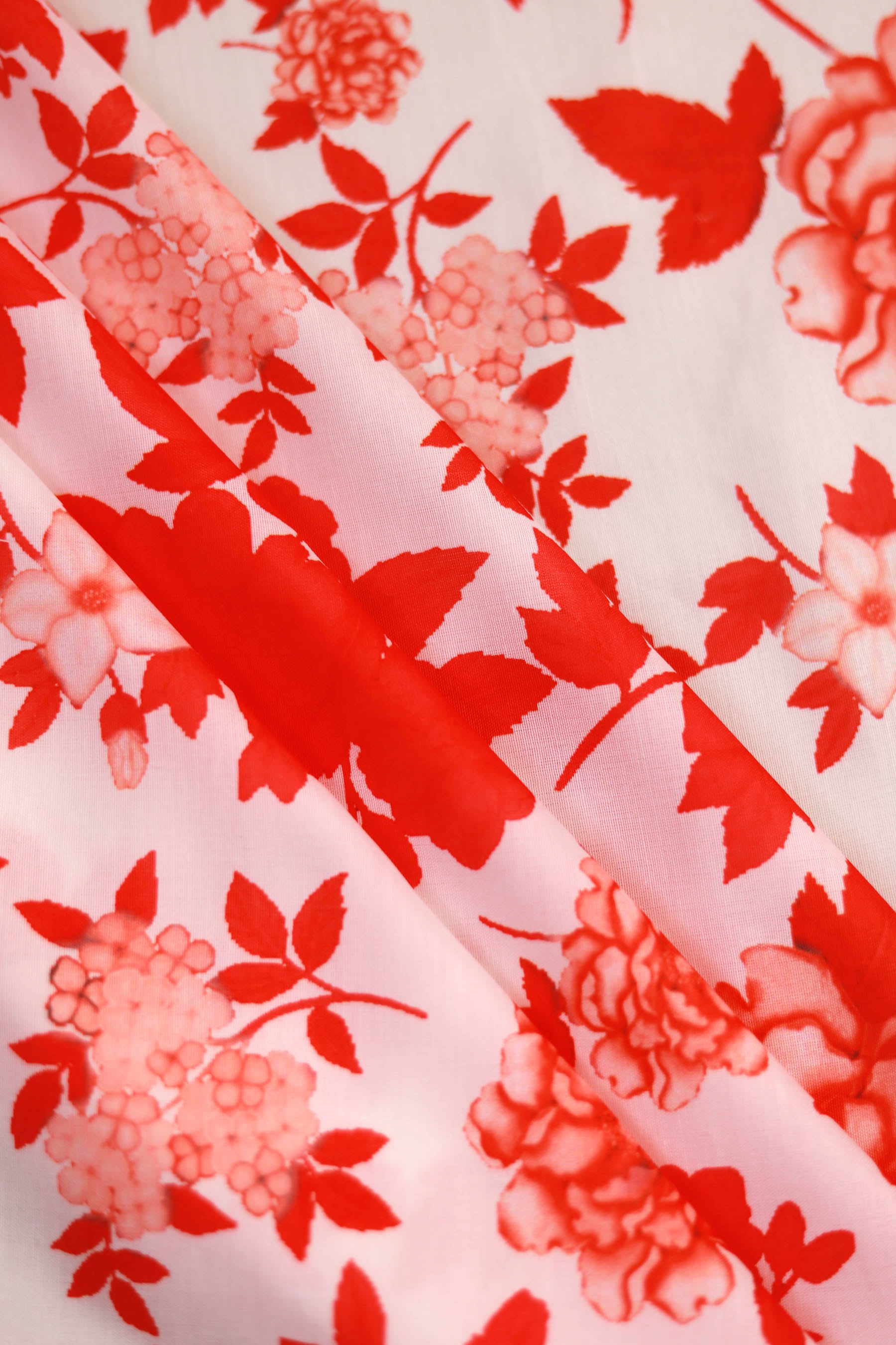 This is a printed muslin fabric featuring bright scarlet-red floral motifs along with leafy silhouettes set against a soft white base. The flowers are a mix of roses, blossoms, and clustered petals, giving it a vibrant yet delicate appeal. The bold contrast of red against white adds freshness and elegance, making it both eye-catching and versatile.