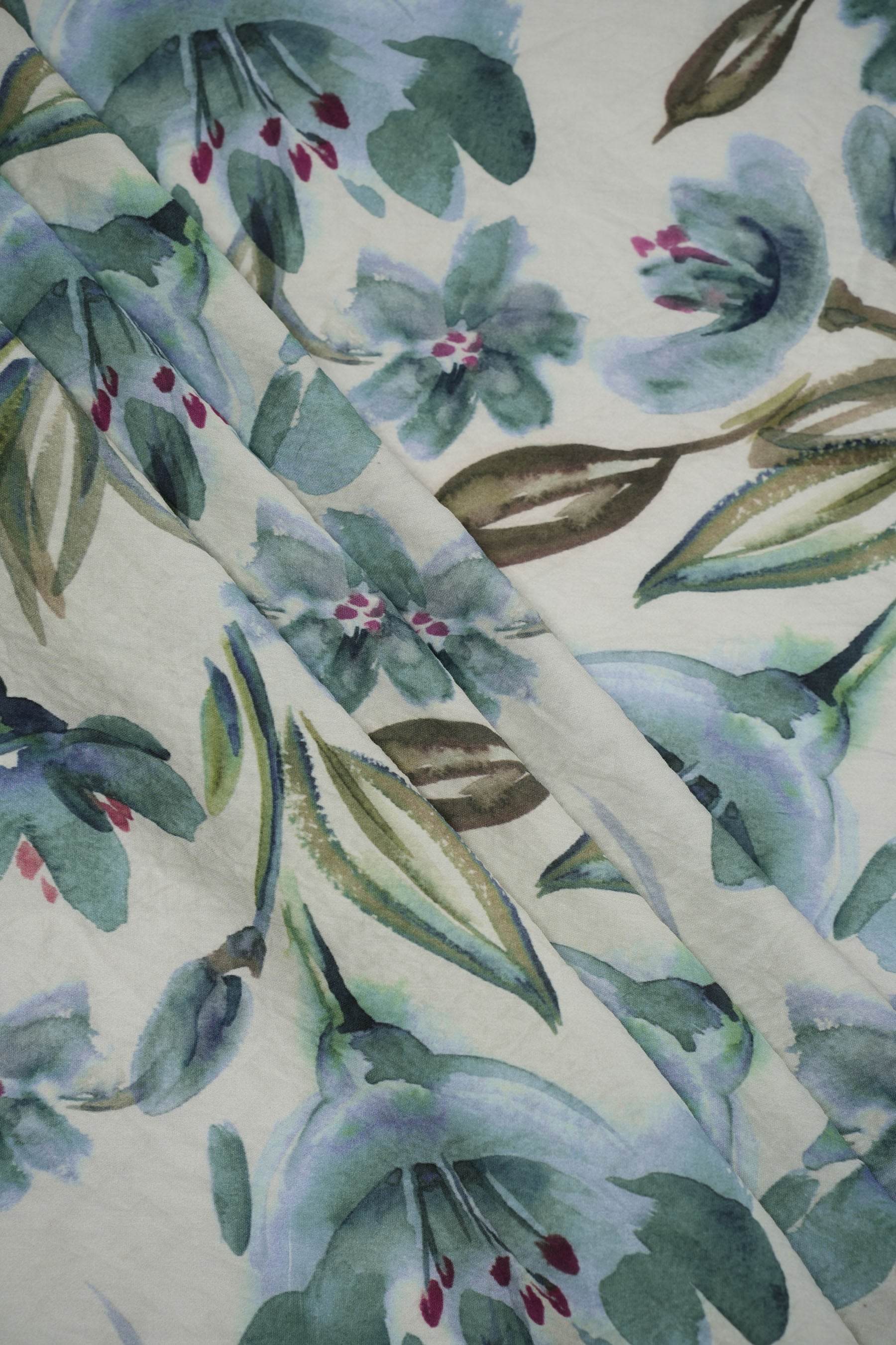 This fabric features a serene ivory base adorned with watercolor-style floral motifs in soft wine, plum, and sage green hues. The delicate design evokes a sense of elegance and romance, making it a perfect choice for creating both western and ethnic wear. Crafted from 85% pure viscose and 15% nylon, the fabric is exceptionally soft to touch, breathable, and drapes beautifully, offering comfort and sophistication for all occasions.