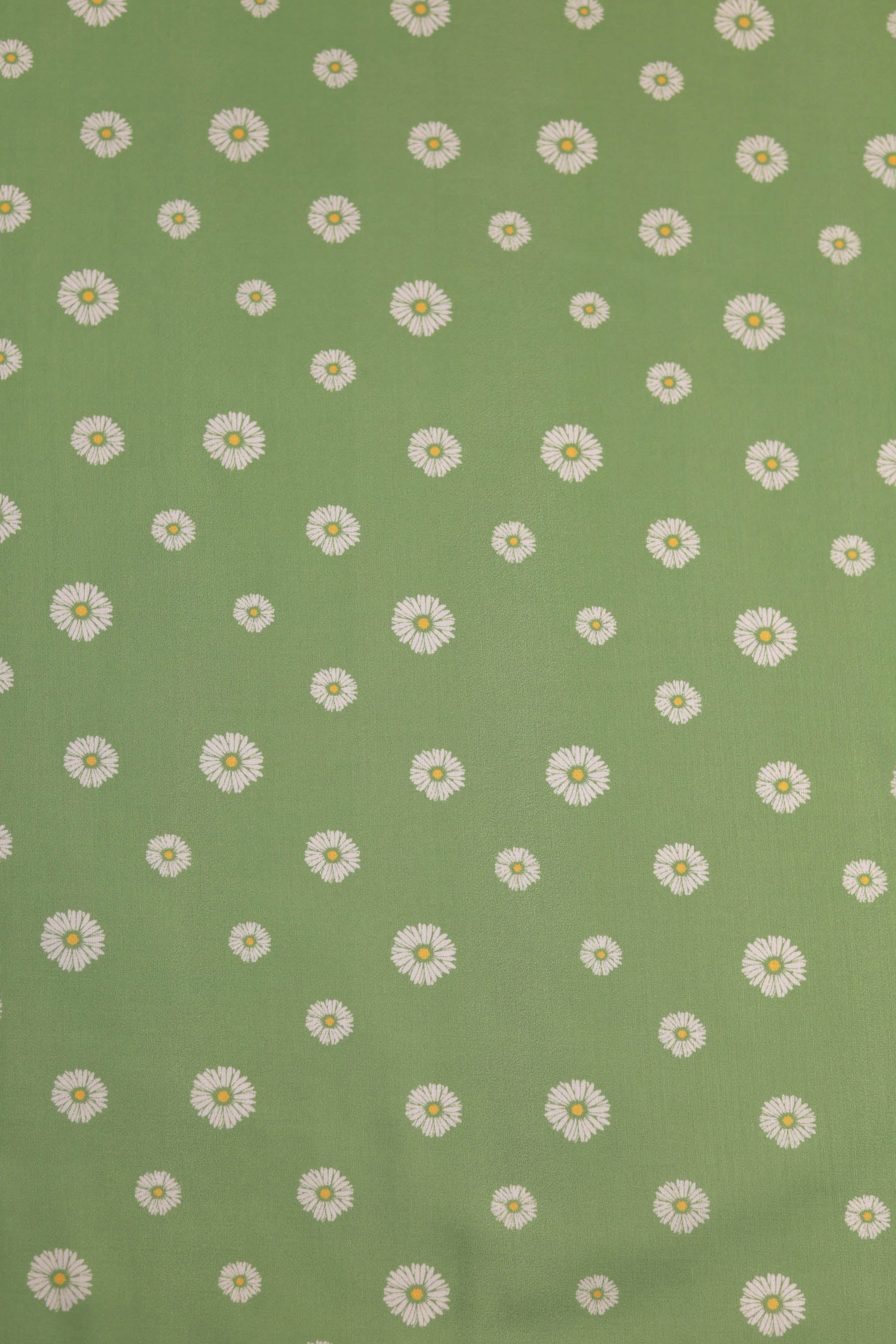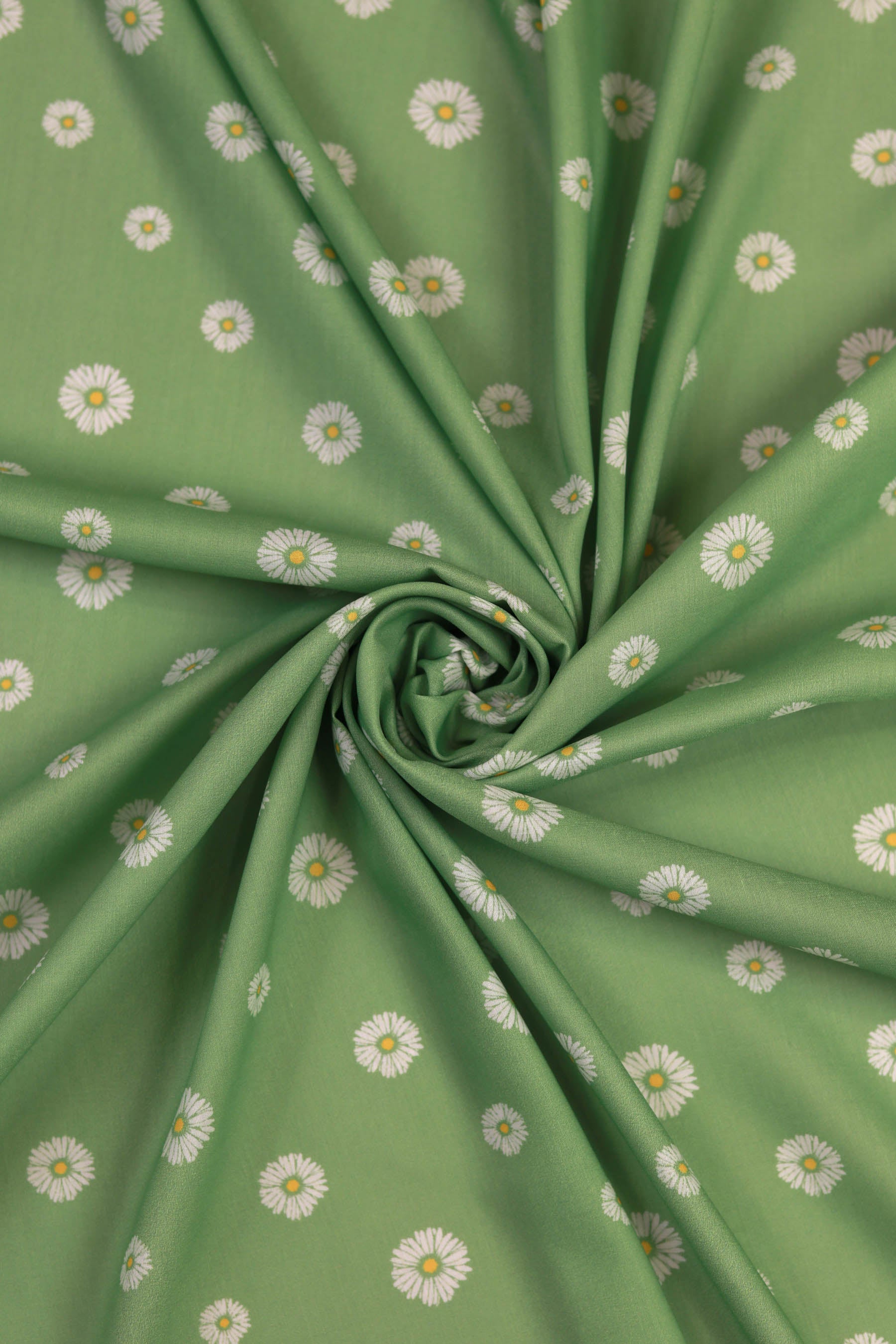 This muslin fabric features a soft sage green base adorned with scattered white daisies with golden-yellow centers. The minimal, evenly spaced floral motifs bring a calm, soothing, and youthful vibe, reminiscent of spring meadows.