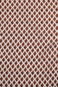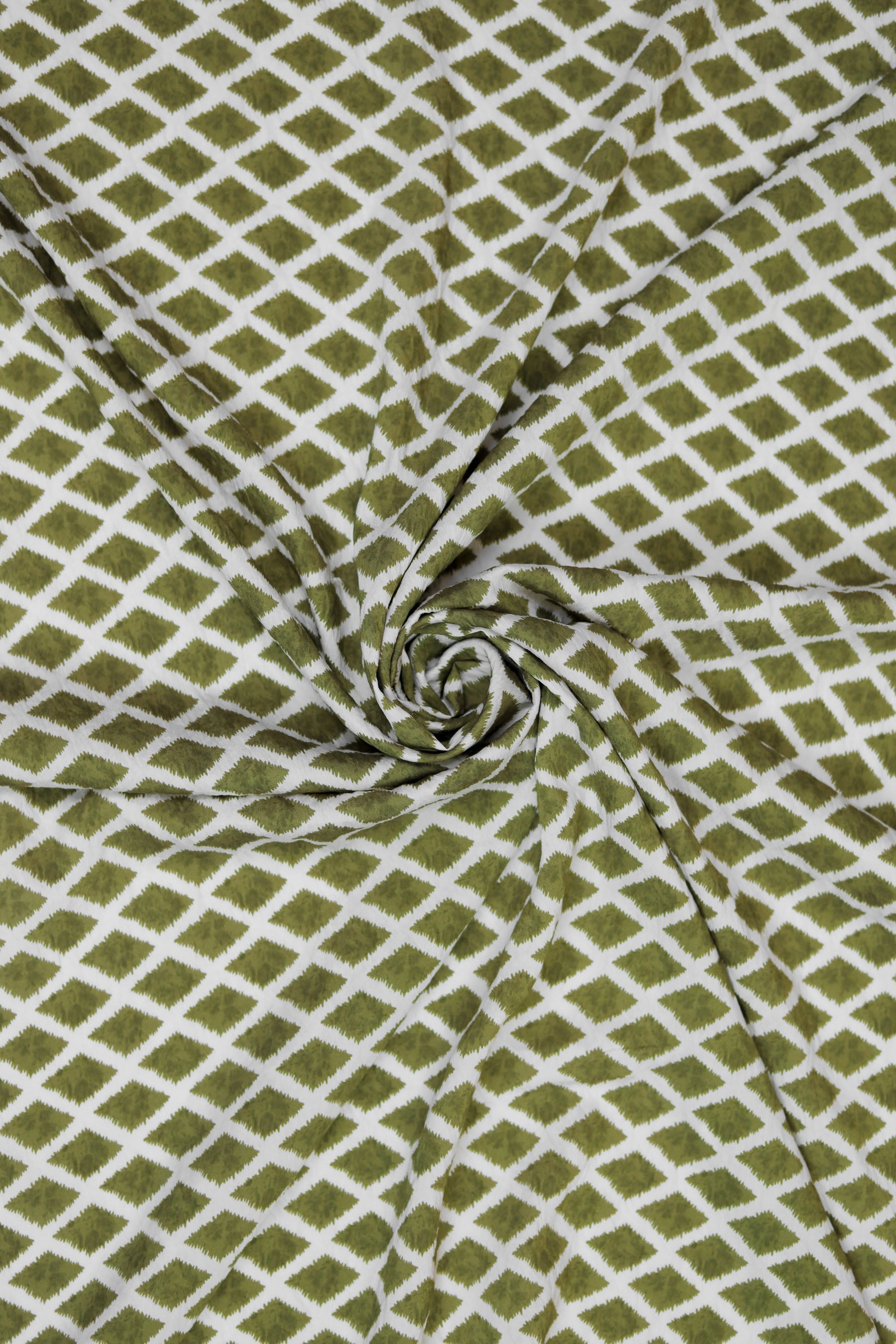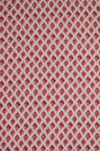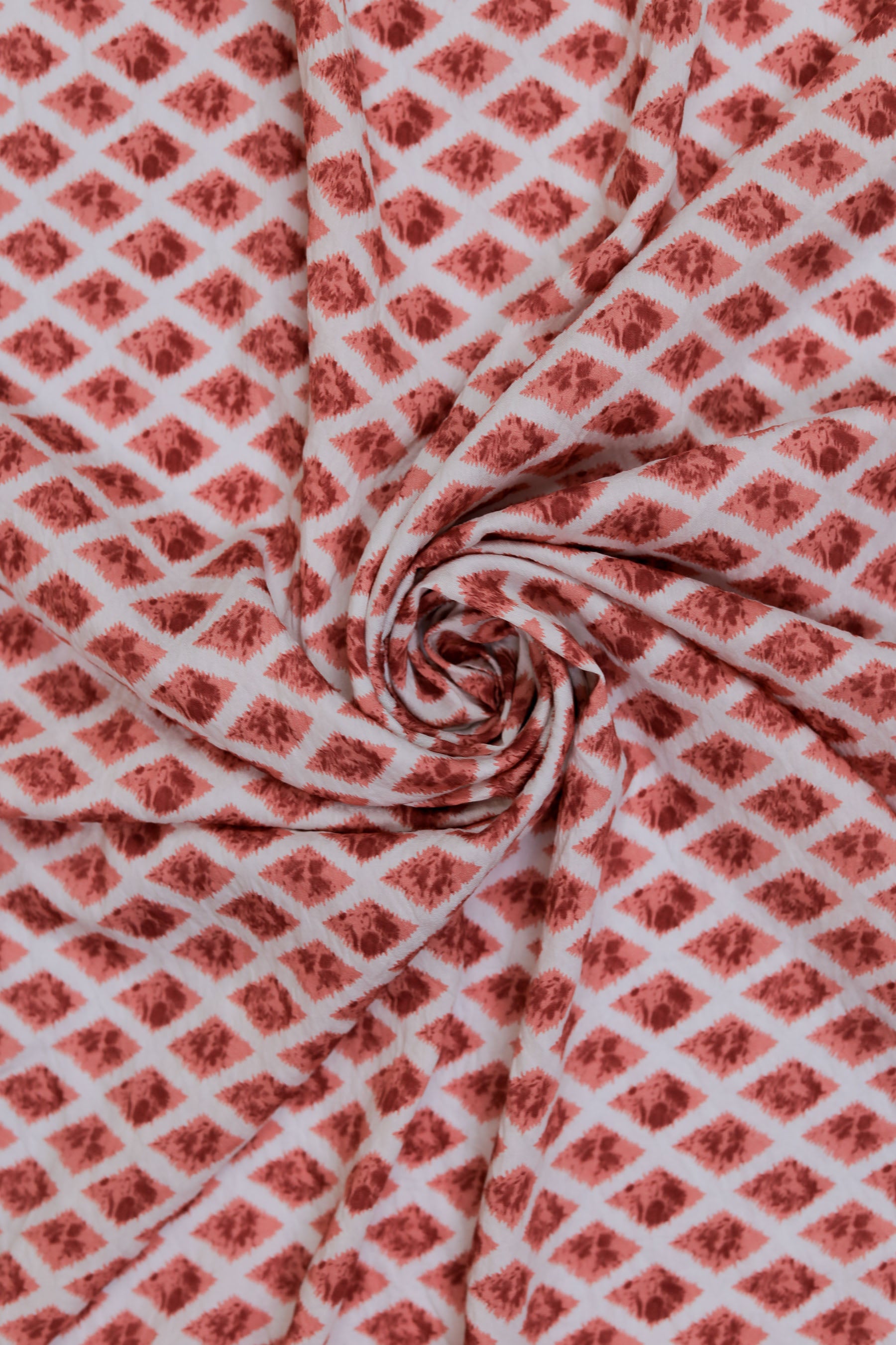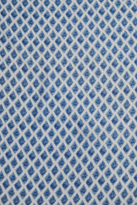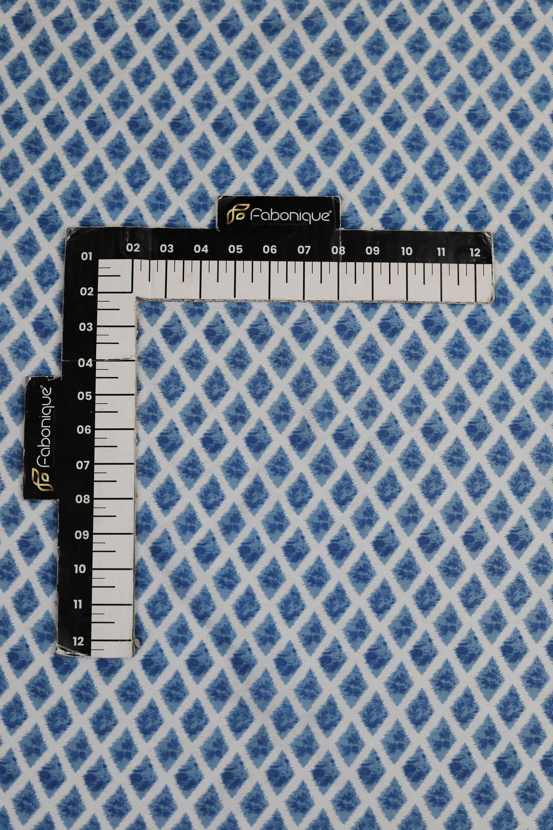 This fabric features a striking diamond ikat-inspired pattern in shades of deep indigo and ocean blue over a soft ivory-white base. The repetitive geometric design gives it a timeless and sophisticated look, making it suitable for both ethnic and contemporary wear. With its 85% pure viscose and 15% nylon blend, the fabric feels lightweight and airy yet maintains a lovely structure and fall.Its natural sheen and smooth touch make it a versatile choice for creating stylish outfits that flow beautifully with every movement.