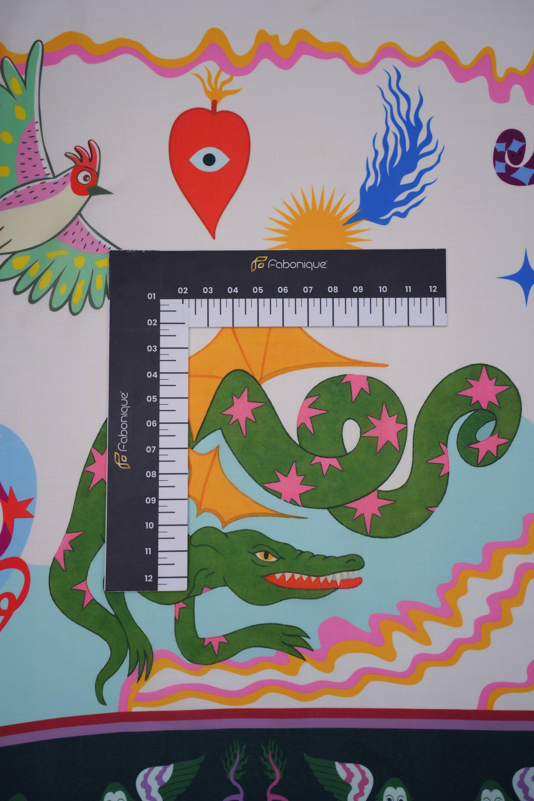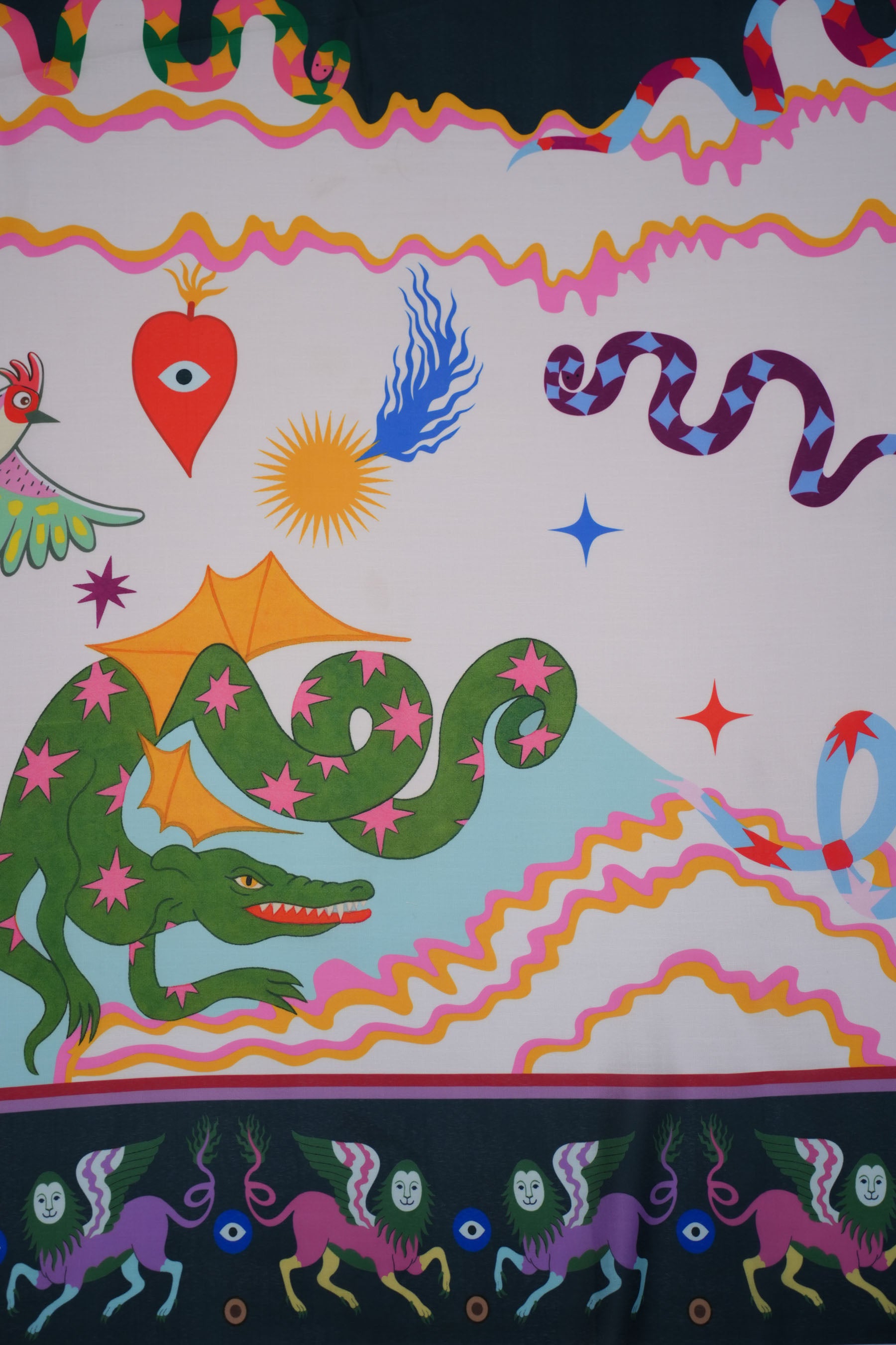 This printed linen fabric is a fantastical, surrealist artwork brought to life on cloth. The centerpiece is a green dragon-like creature with star motifs, accompanied by colorful serpents, mystical birds, cosmic suns, eyes, and abstract waves. The design features a playful, psychedelic palette of vivid pinks, purples, greens, yellows, blues, and reds outlined boldly for dramatic impact.