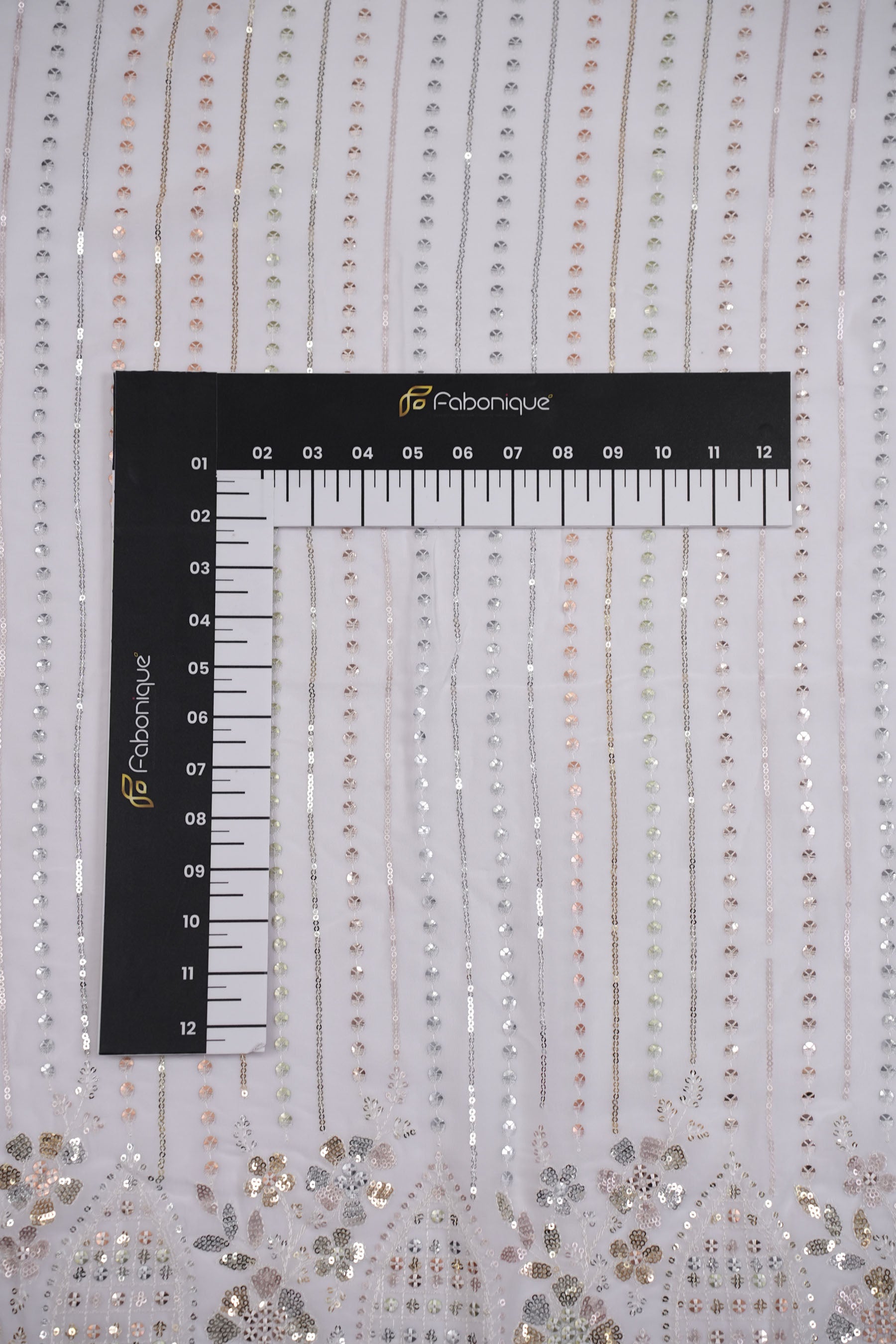 From the floral border, vertical sequin-beaded lines flow downward, creating a raindrop-like cascade effect. This dual design—dense ornate embroidery above and linear embellishment below—gives the fabric a regal, structured look while maintaining elegance.