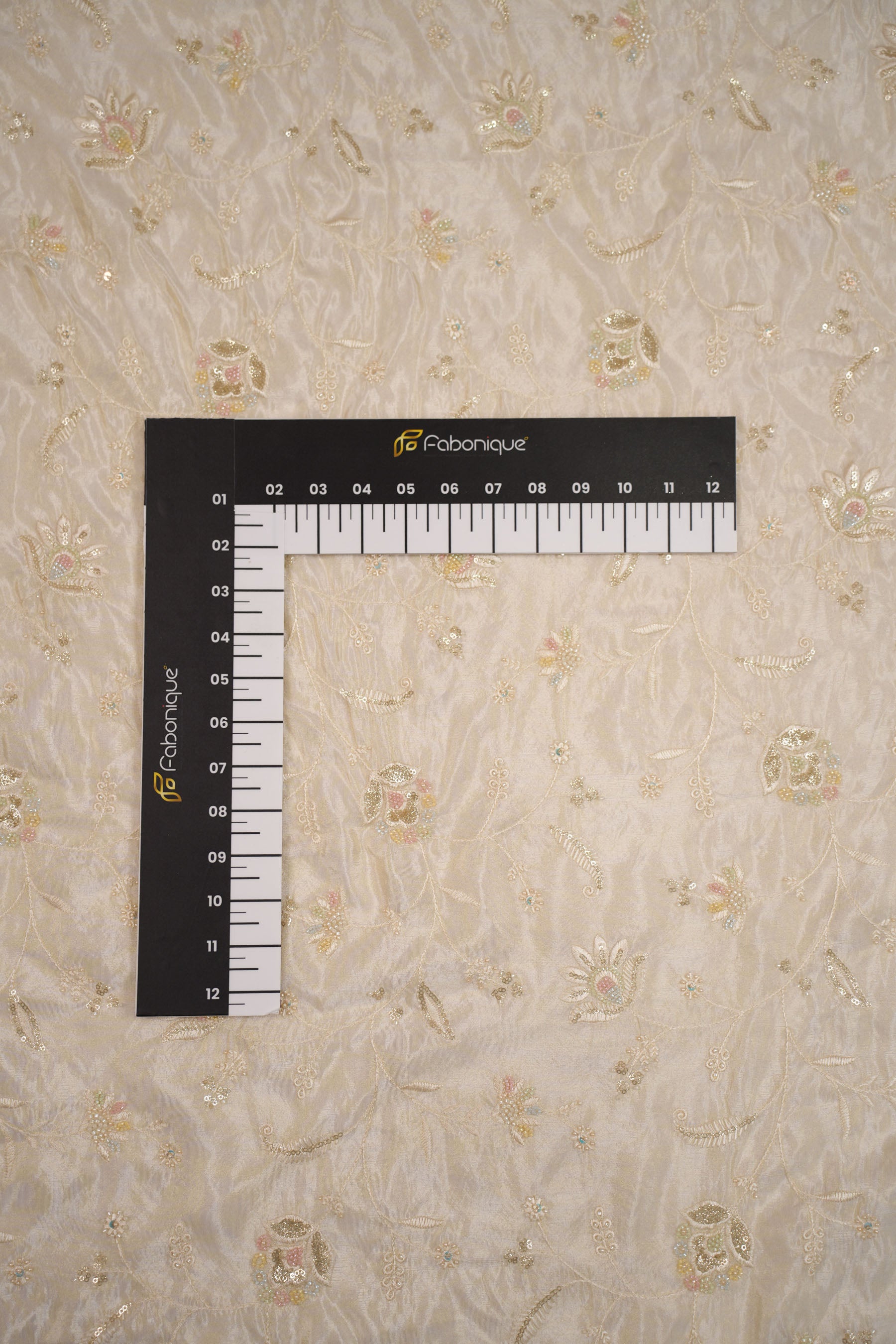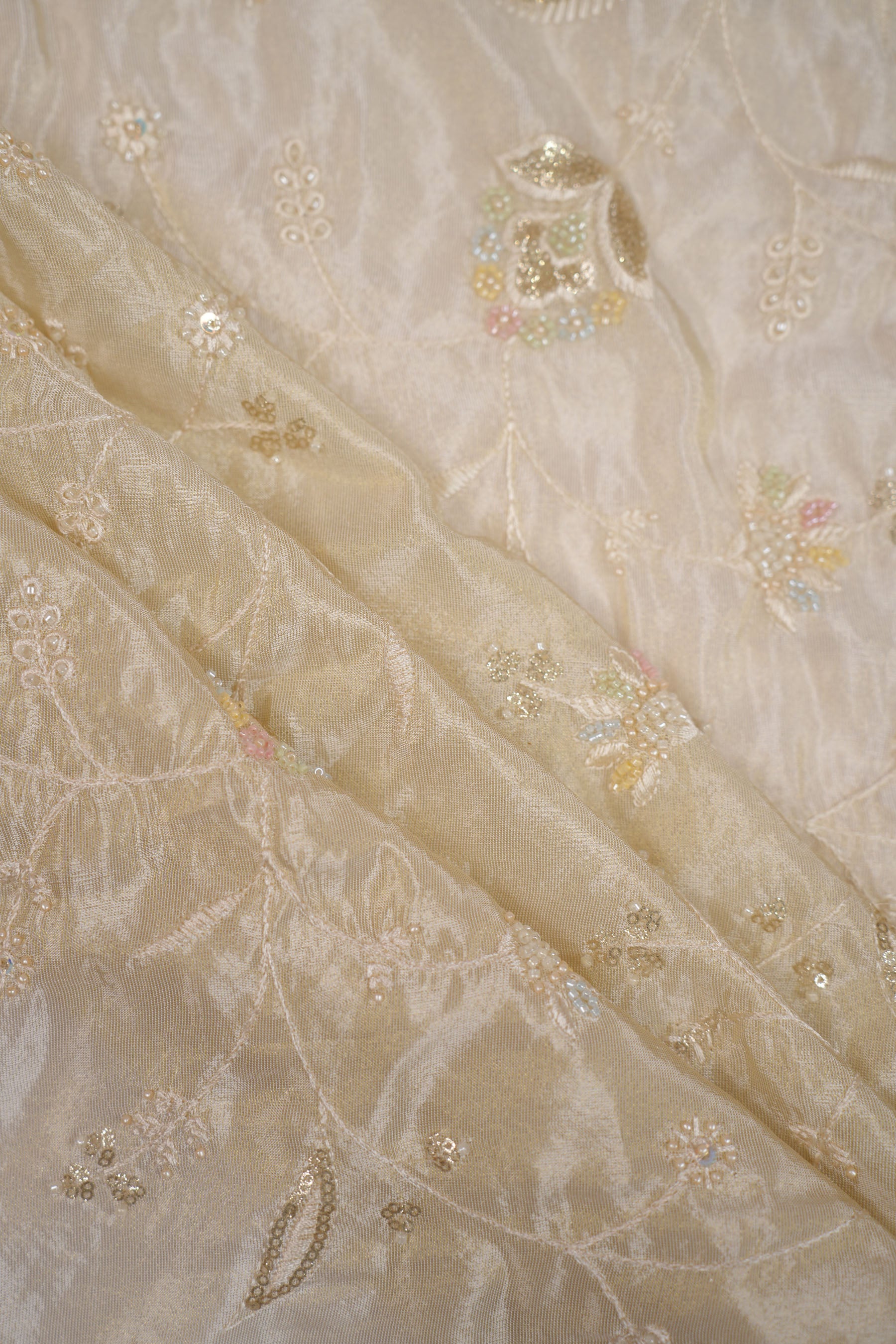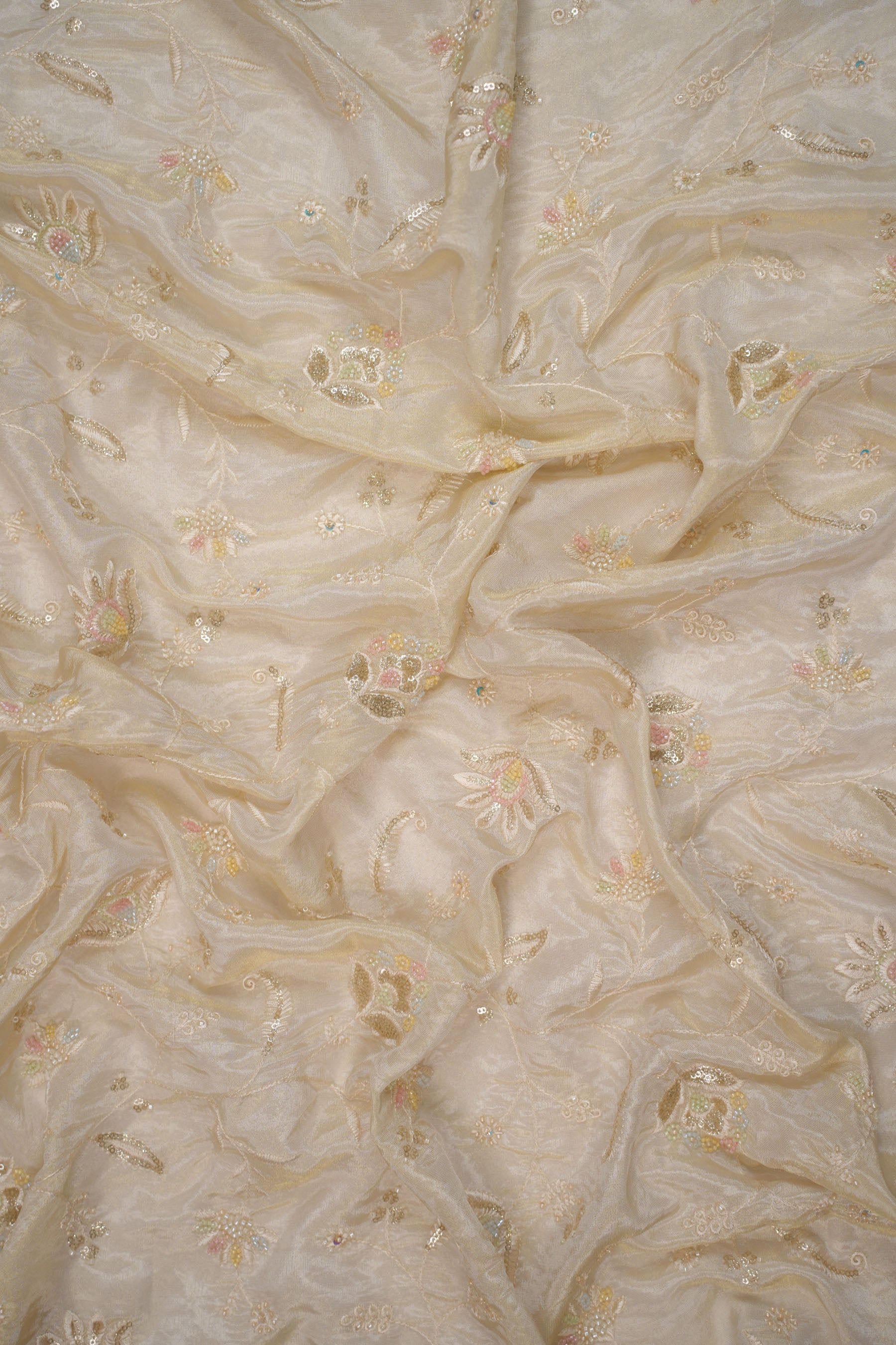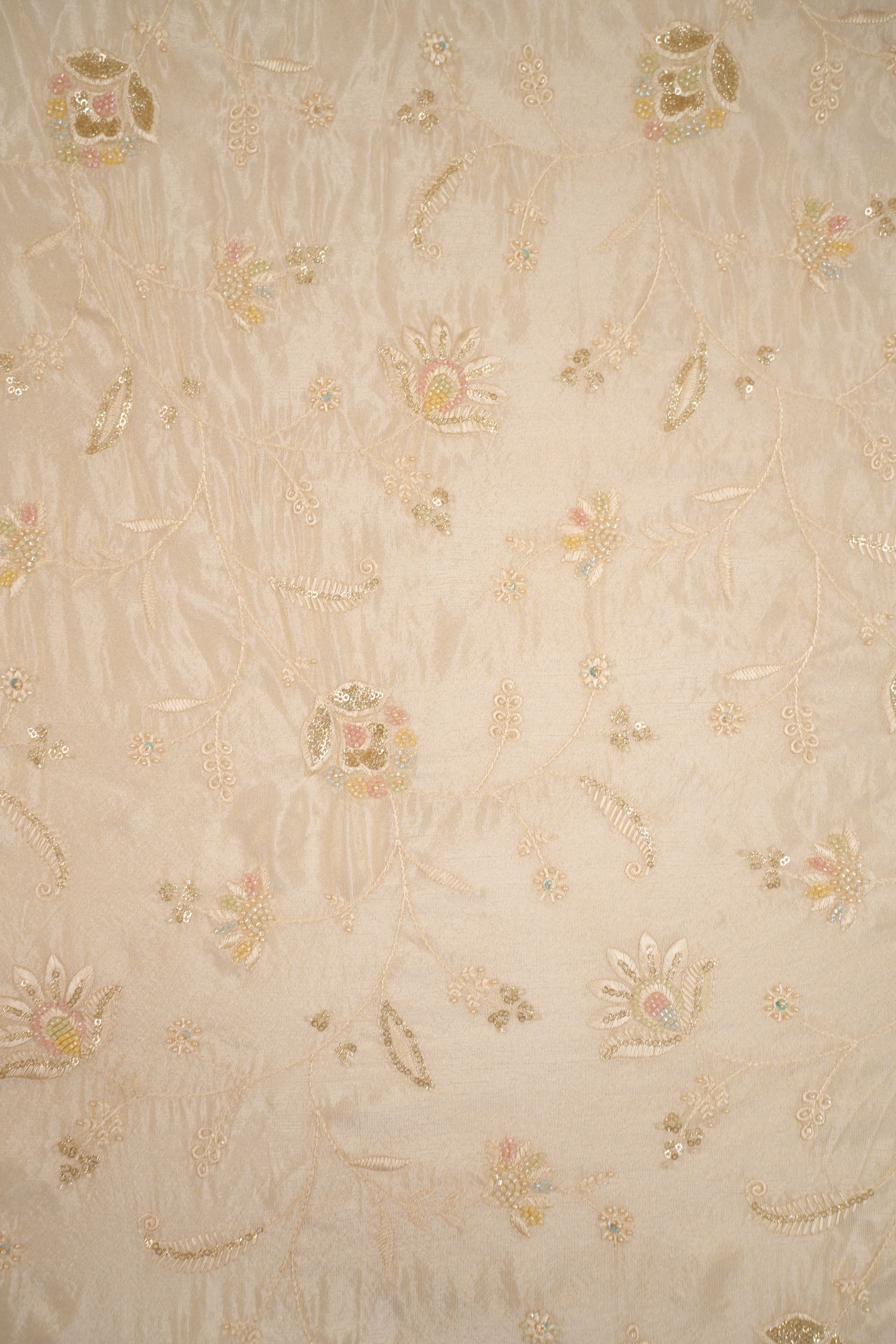 The embroidery is both subtle and elegant—light pastels against the muted golden base create a romantic and sophisticated aura. The scattered sequins add a soft shimmer that catches light without being overpowering, making it perfect for graceful and refined looks.