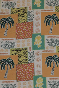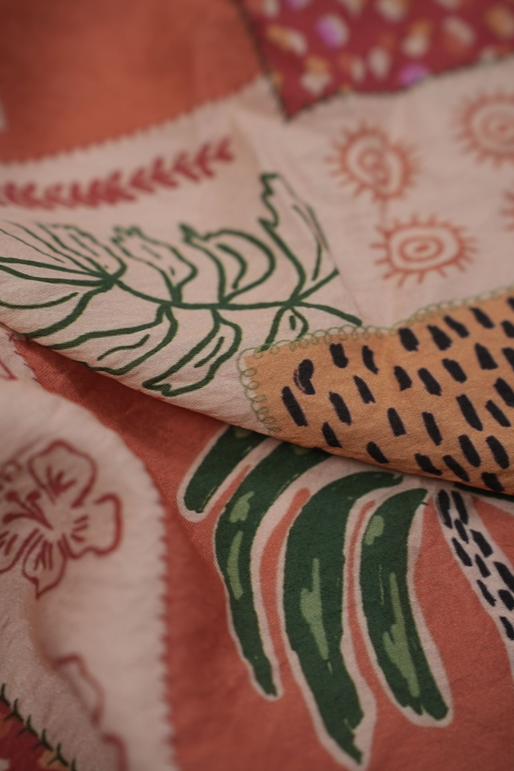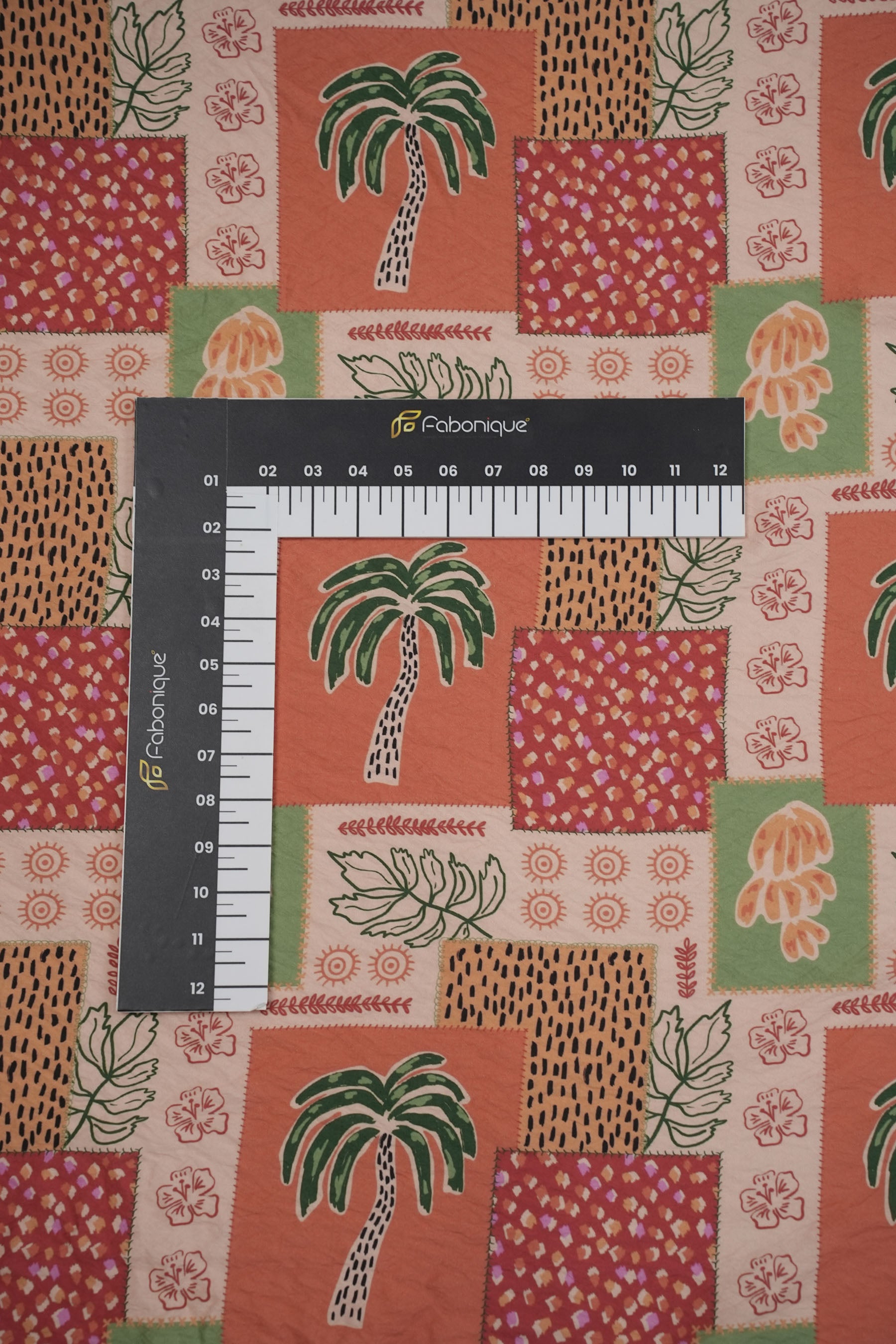 This fabric features a lively patchwork design with bold squares of tropical motifs, florals, and abstract textures in shades of coral red, fresh green, sunny orange, and warm neutrals. The artistic blend of colors and patterns gives it a bohemian yet sophisticated vibe. Made with a premium composition of 85% pure viscose and 15% nylon, it offers an exceptionally soft hand feel, beautiful drape, and a breathable texture perfect for all seasons.