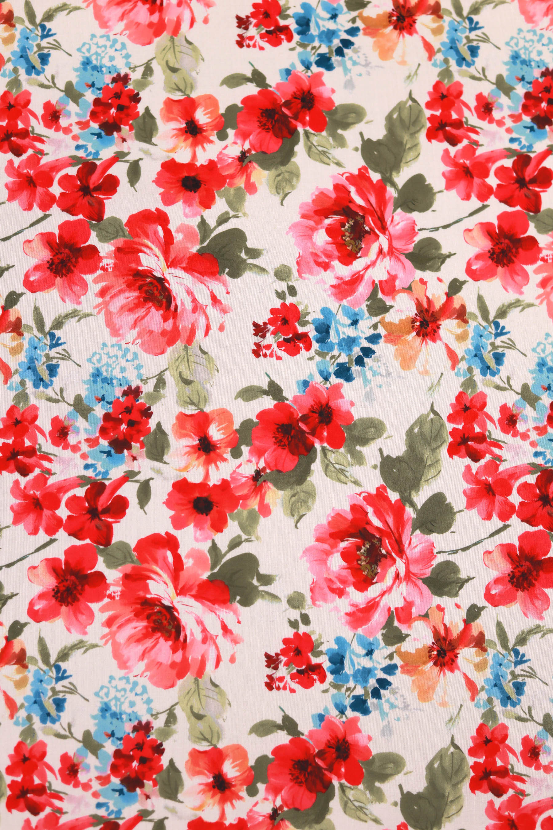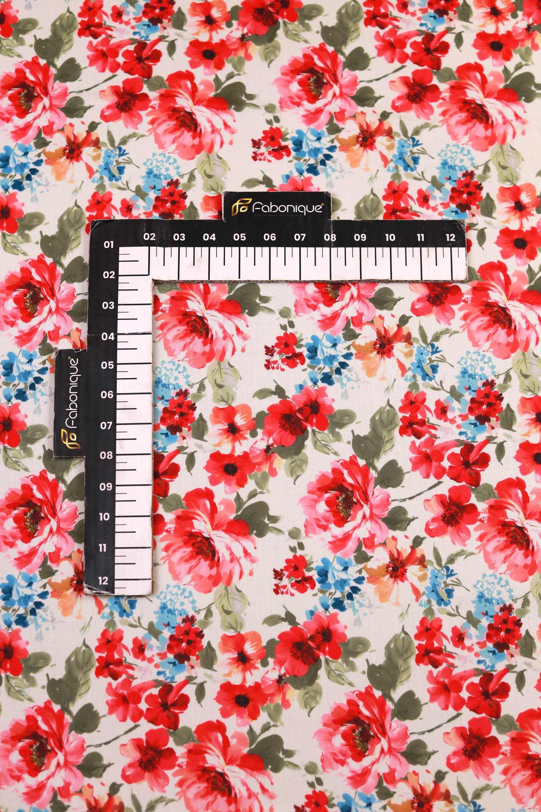 This muslin fabric features a vibrant bouquet of florals in shades of crimson red, coral pink, orange, and sky blue, softened with muted green leaves on a light base. The flowers are painted in a watercolor-inspired style, giving the fabric a romantic, artistic, and airy appearance.