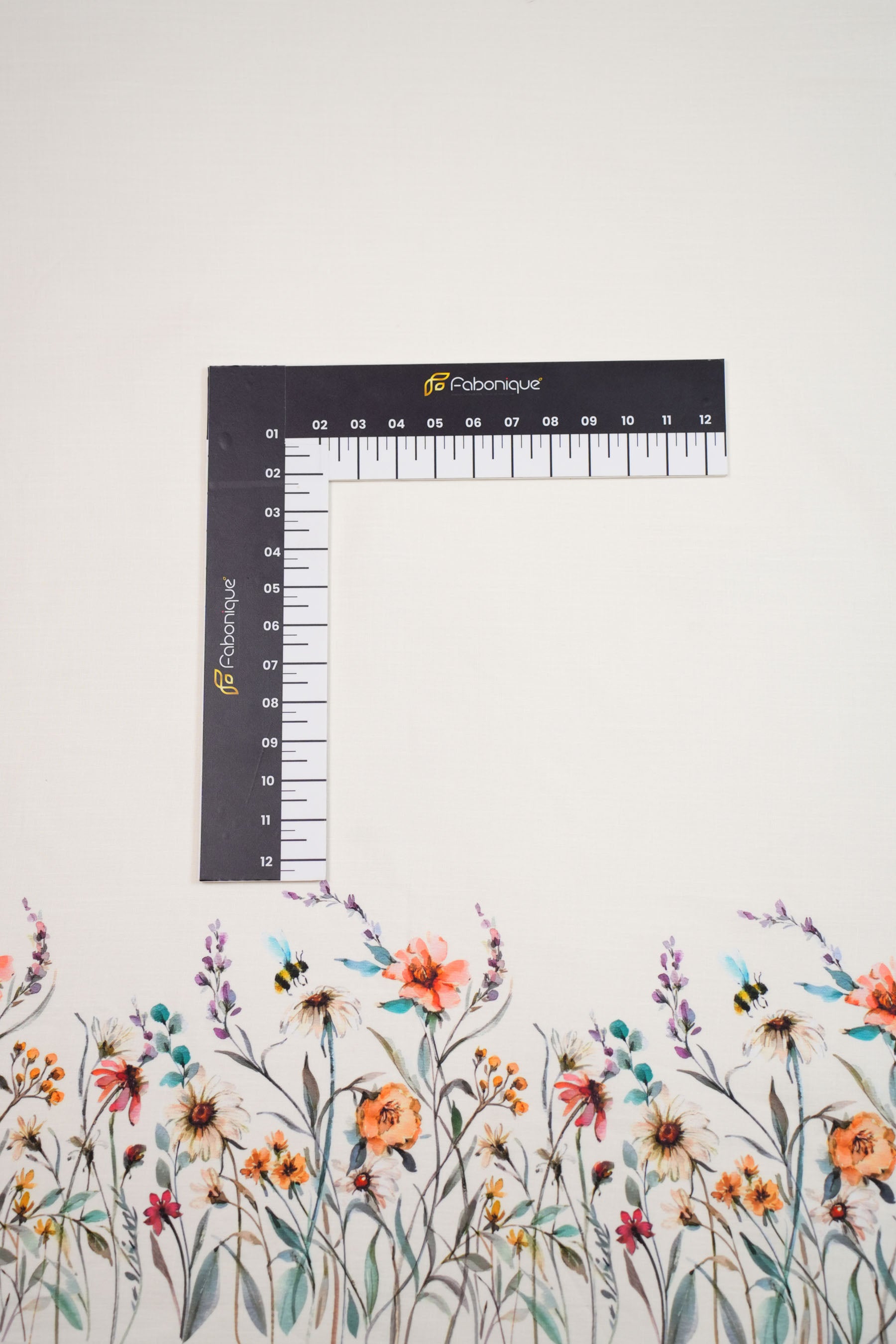 This fabric is a lightweight linen with a soft ivory base, decorated with watercolor-style floral prints in tones of peach, coral, yellow, purple, and green. The design also features flying bees, which bring a lively and nature-inspired charm.