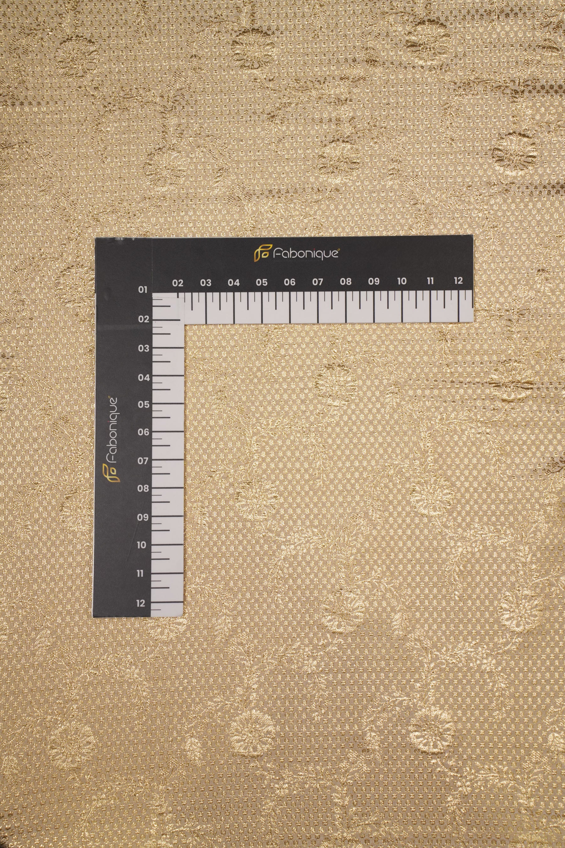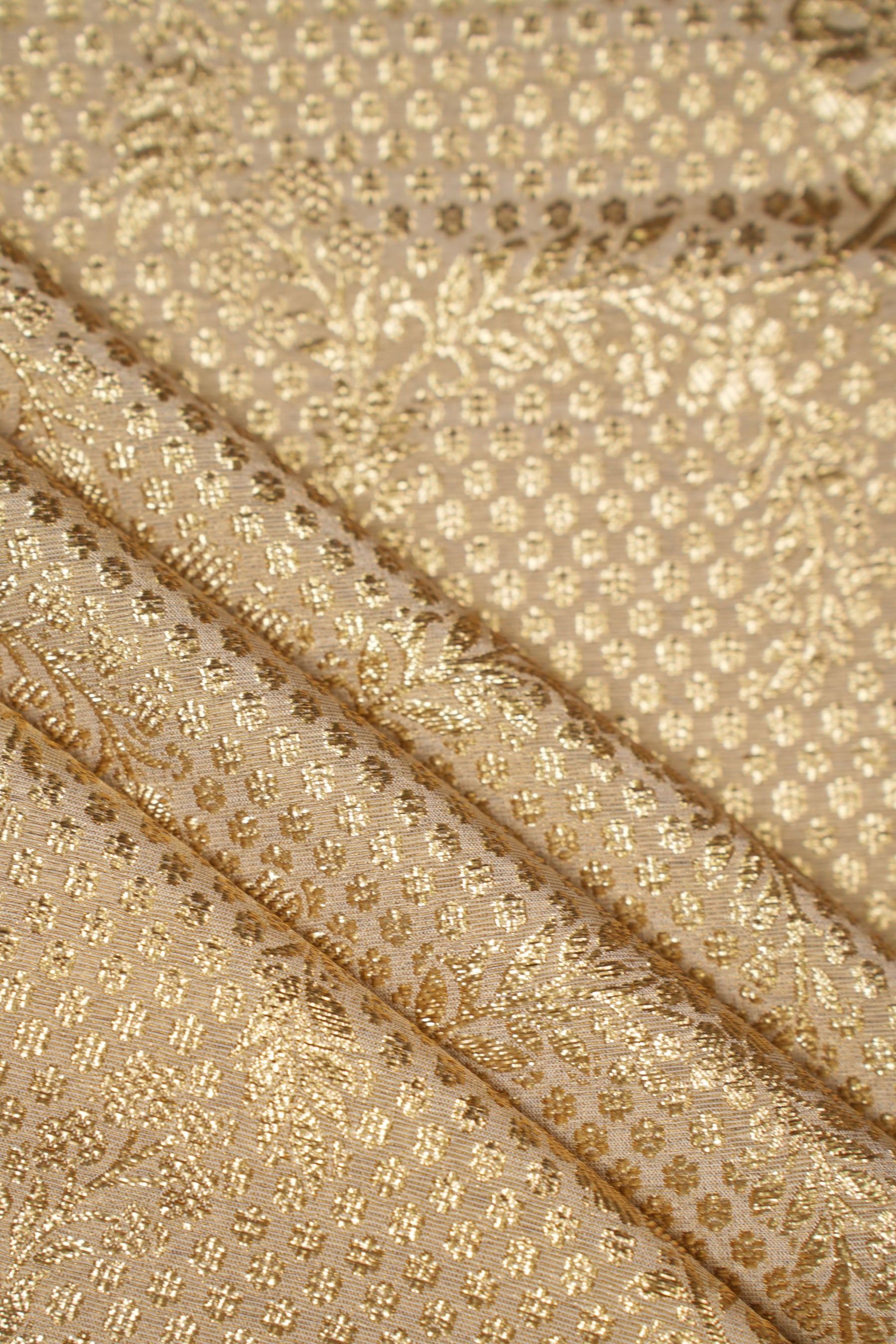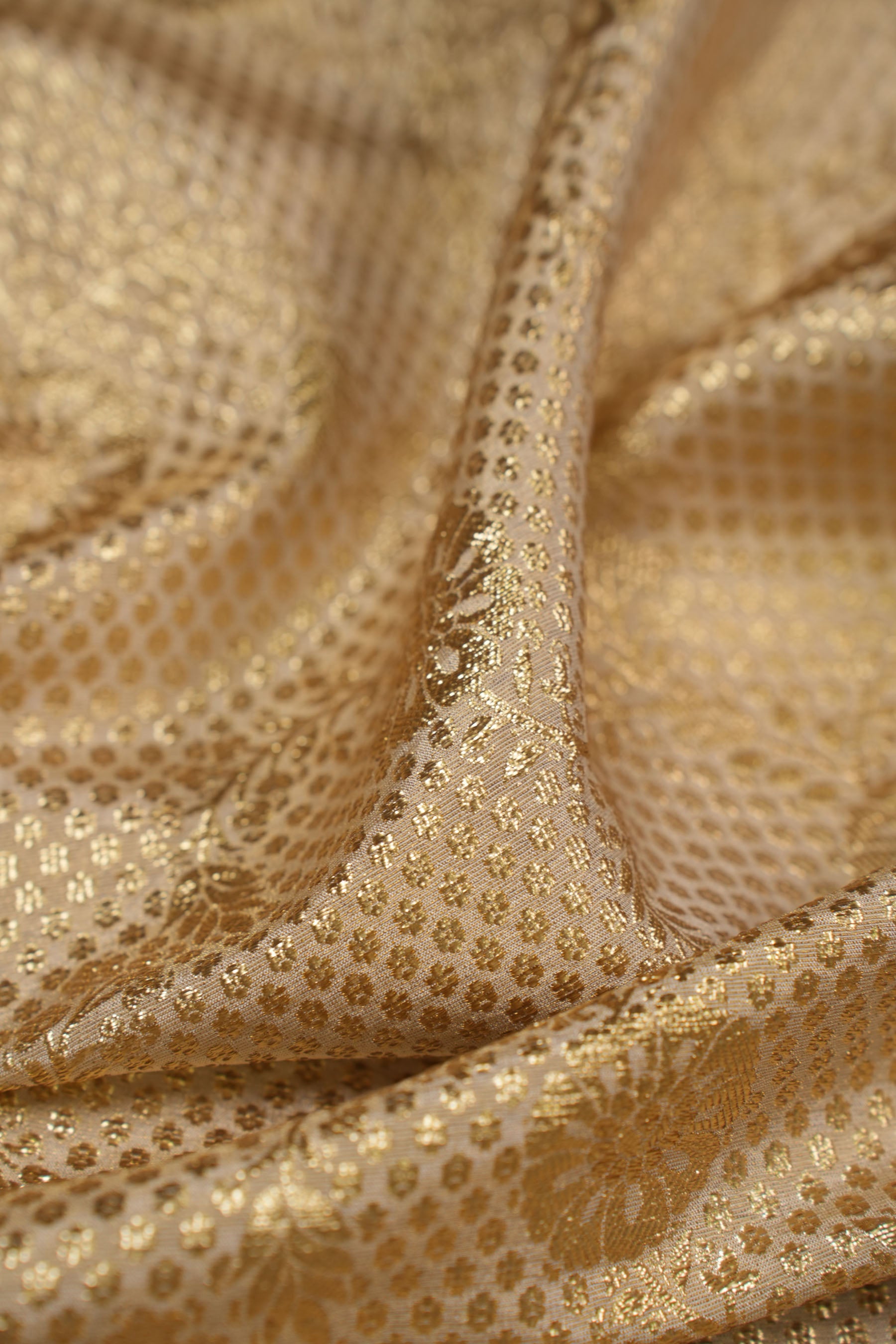 - This fabric is a premium gold jacquard featuring a delicate blend of micro geometric dots forming the background, overlaid with elegant textured floral motifs arranged in soft vine-like patterns.