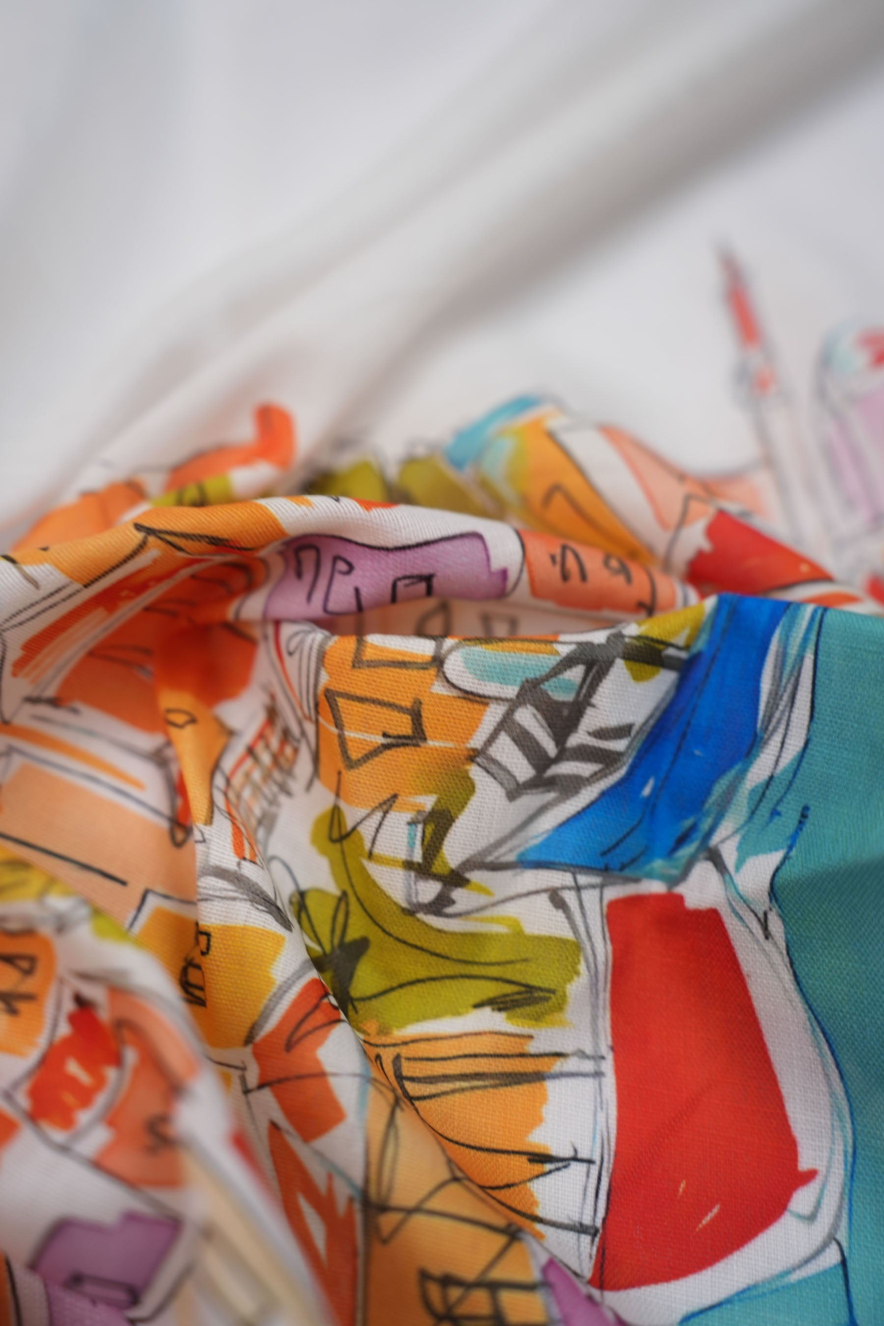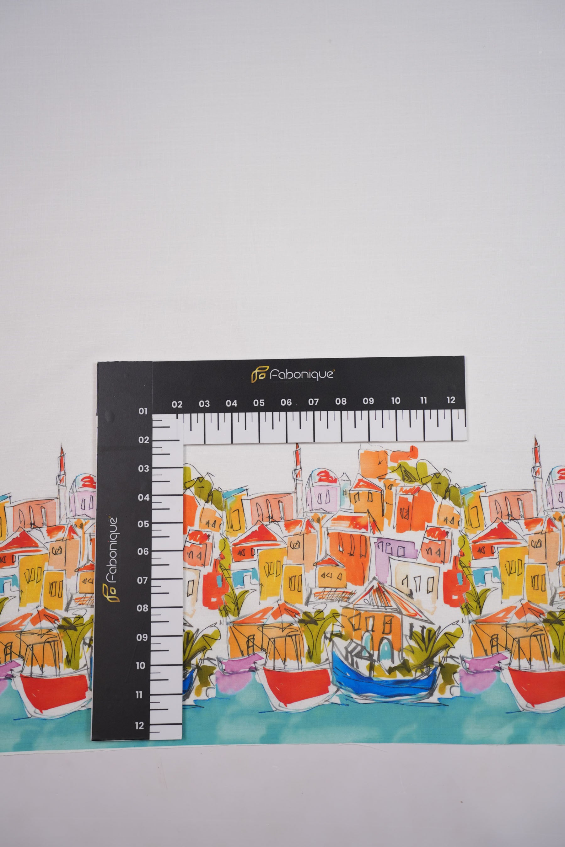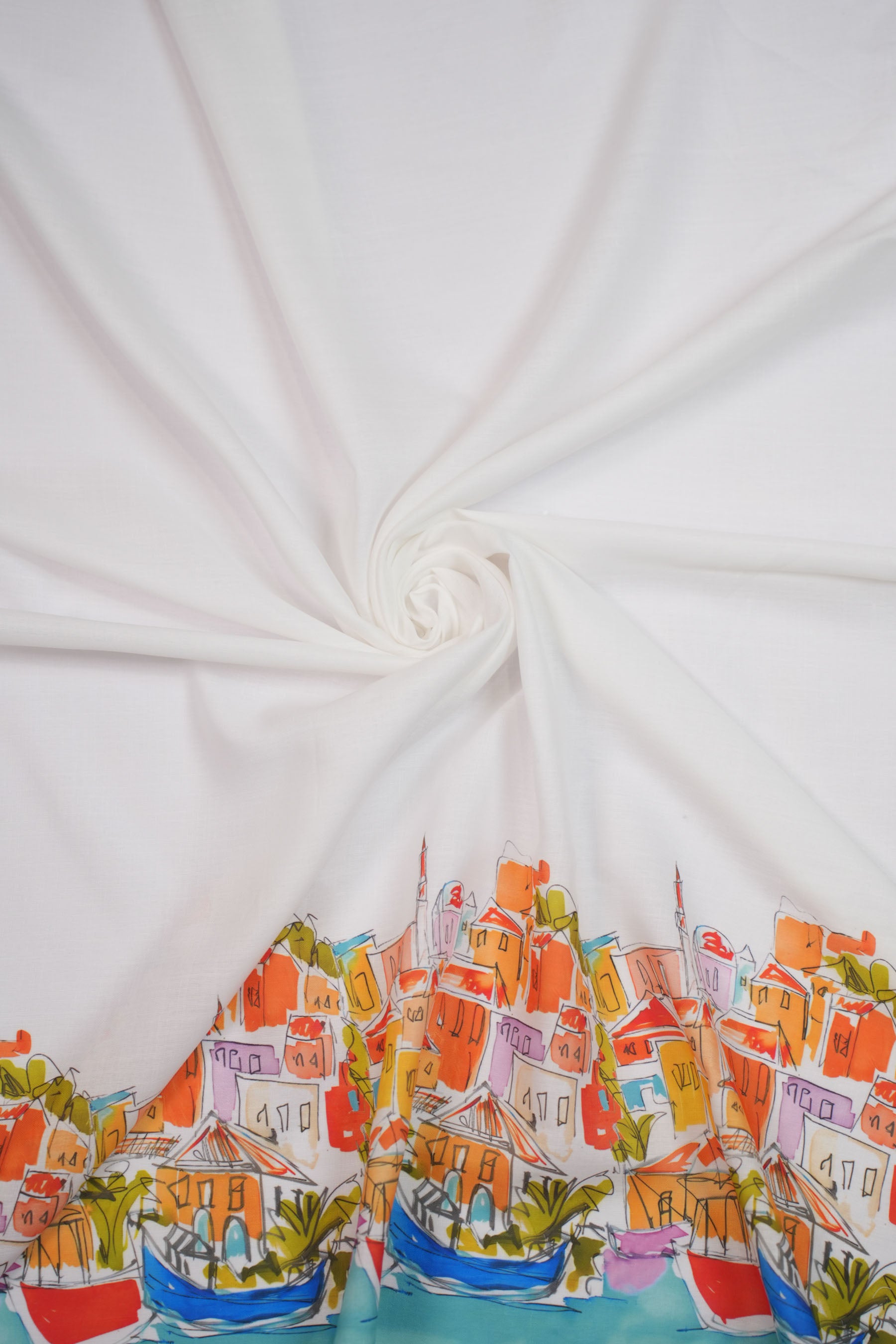 This linen fabric features a white base with a hand-painted style townscape print in bold and cheerful colors like orange, yellow, red, purple, and blue. The design shows clustered houses with boats and greenery, evoking the feel of a Mediterranean harbor or coastal town.