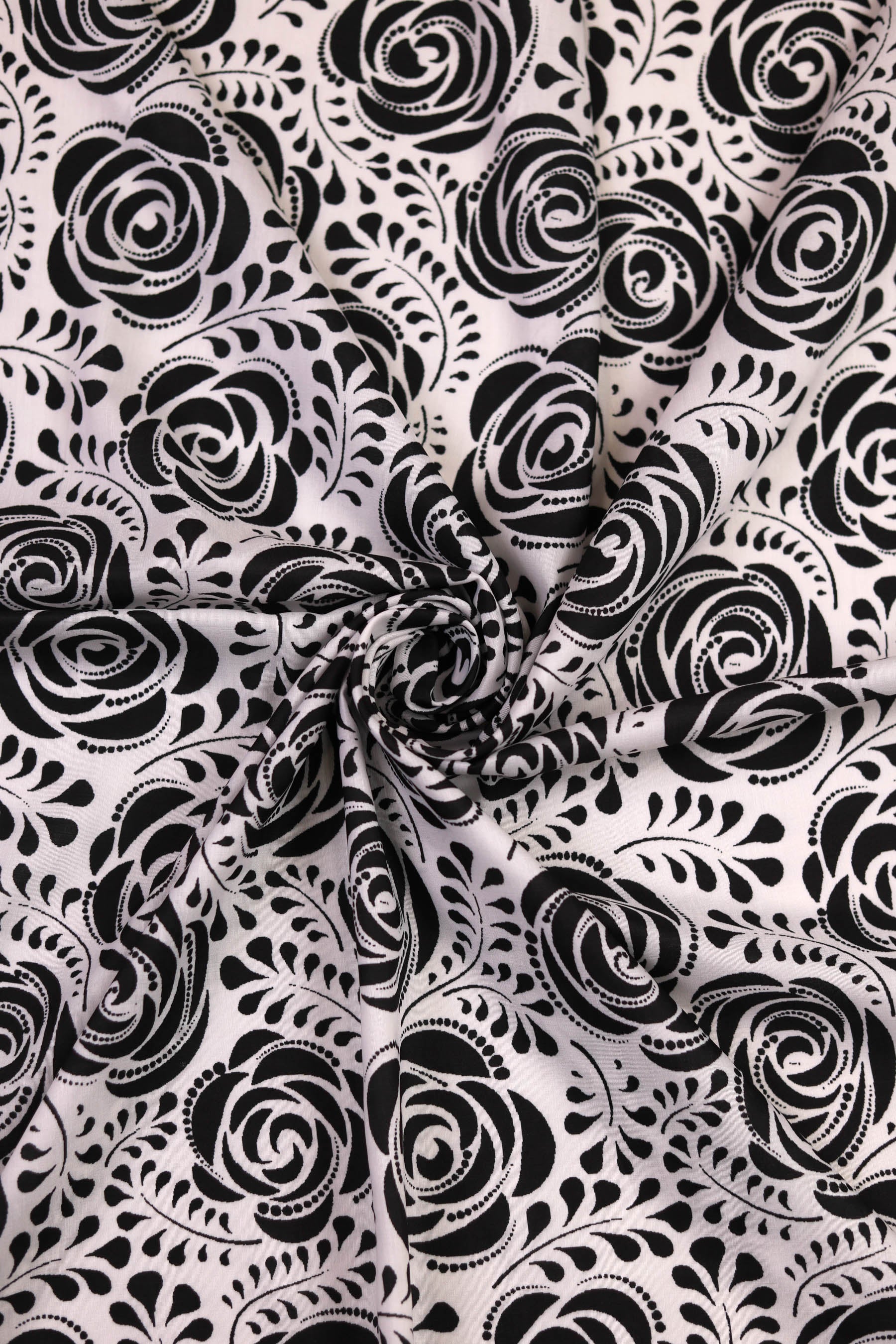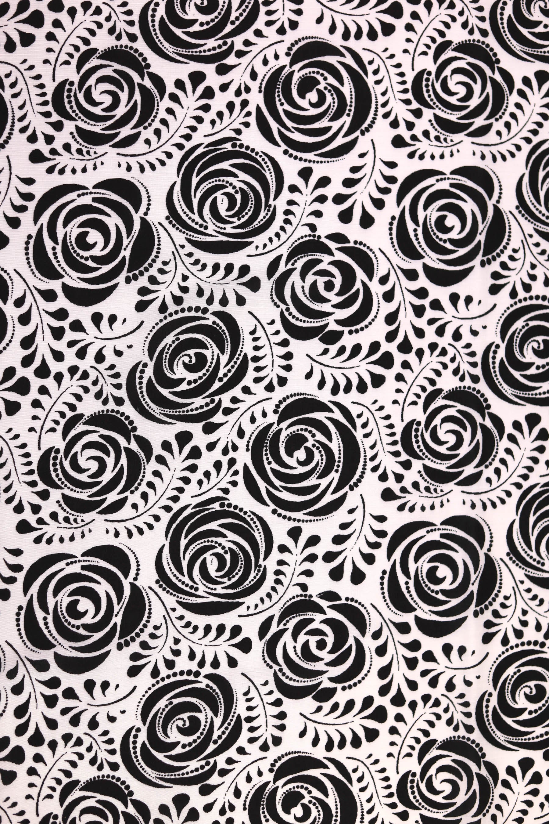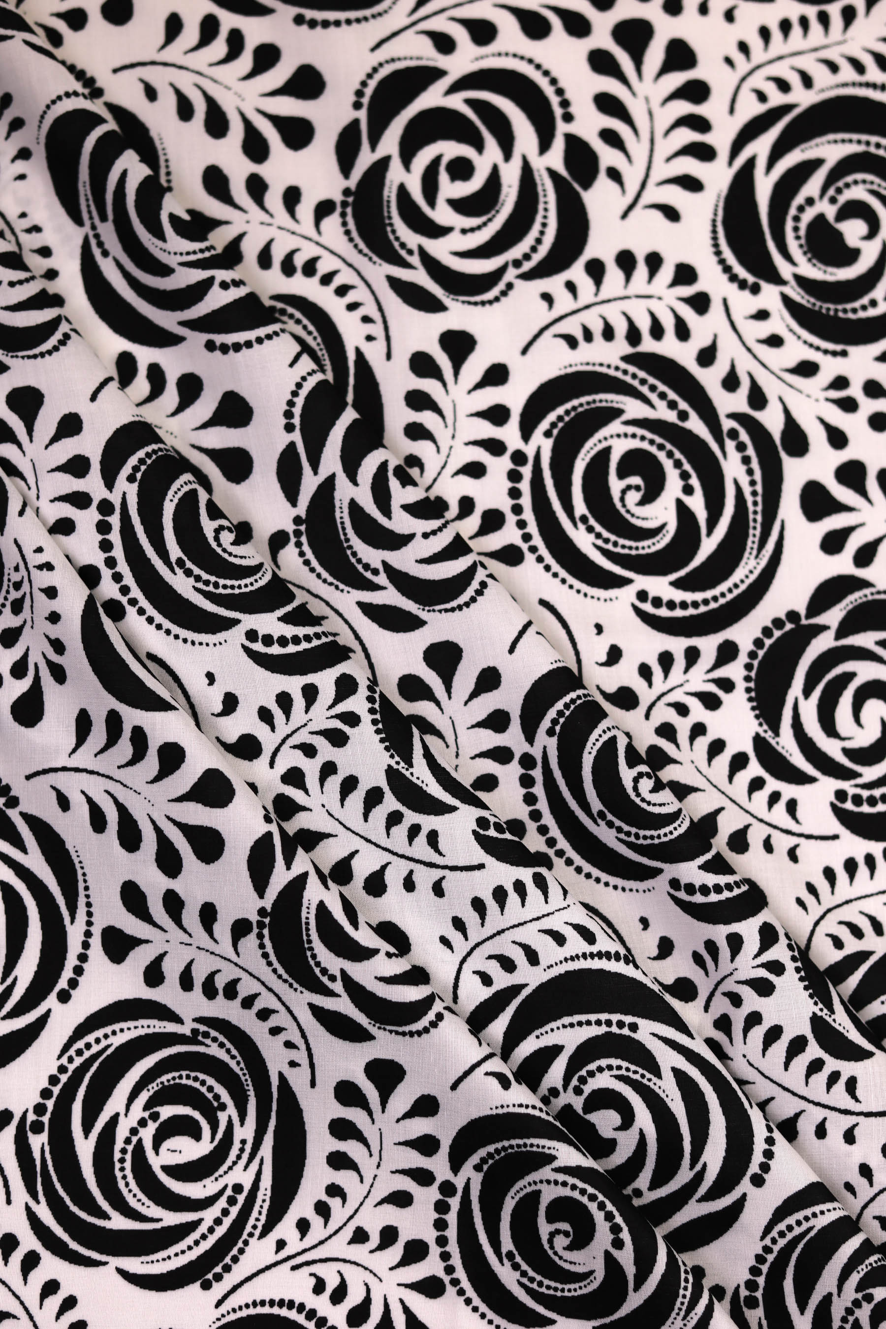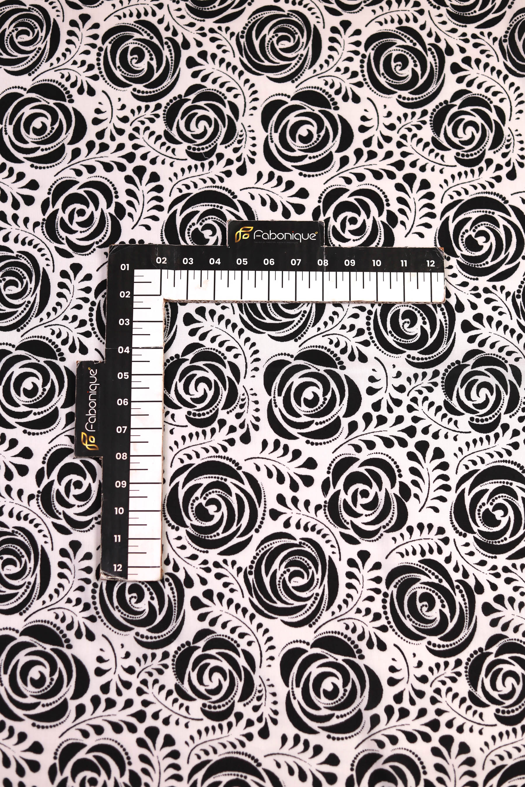 This muslin fabric features a white base highlighted with bold black rose motifs surrounded by dotted and leafy accents. The stylized roses are arranged in a rhythmic pattern, giving the fabric a dramatic yet graceful charm.