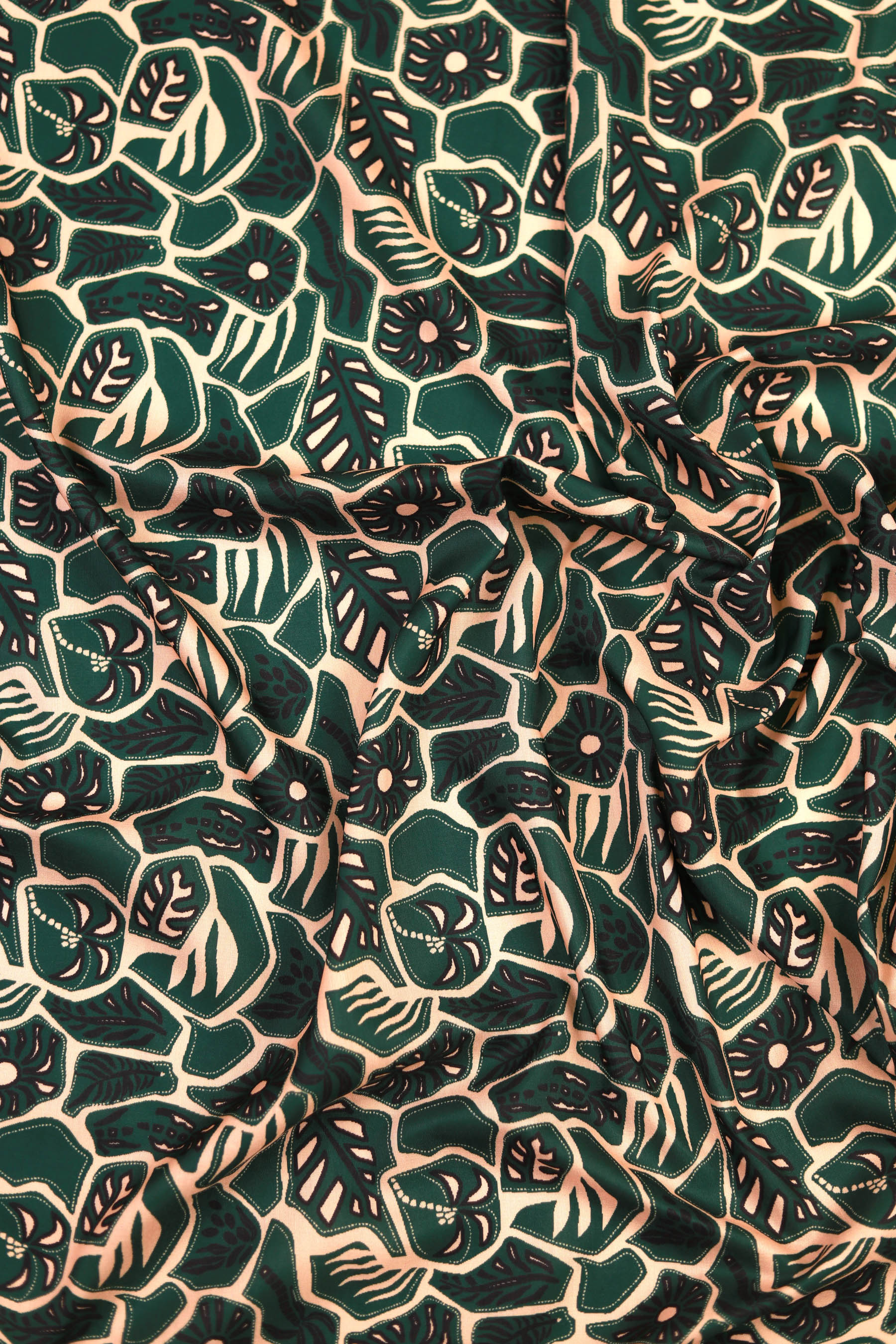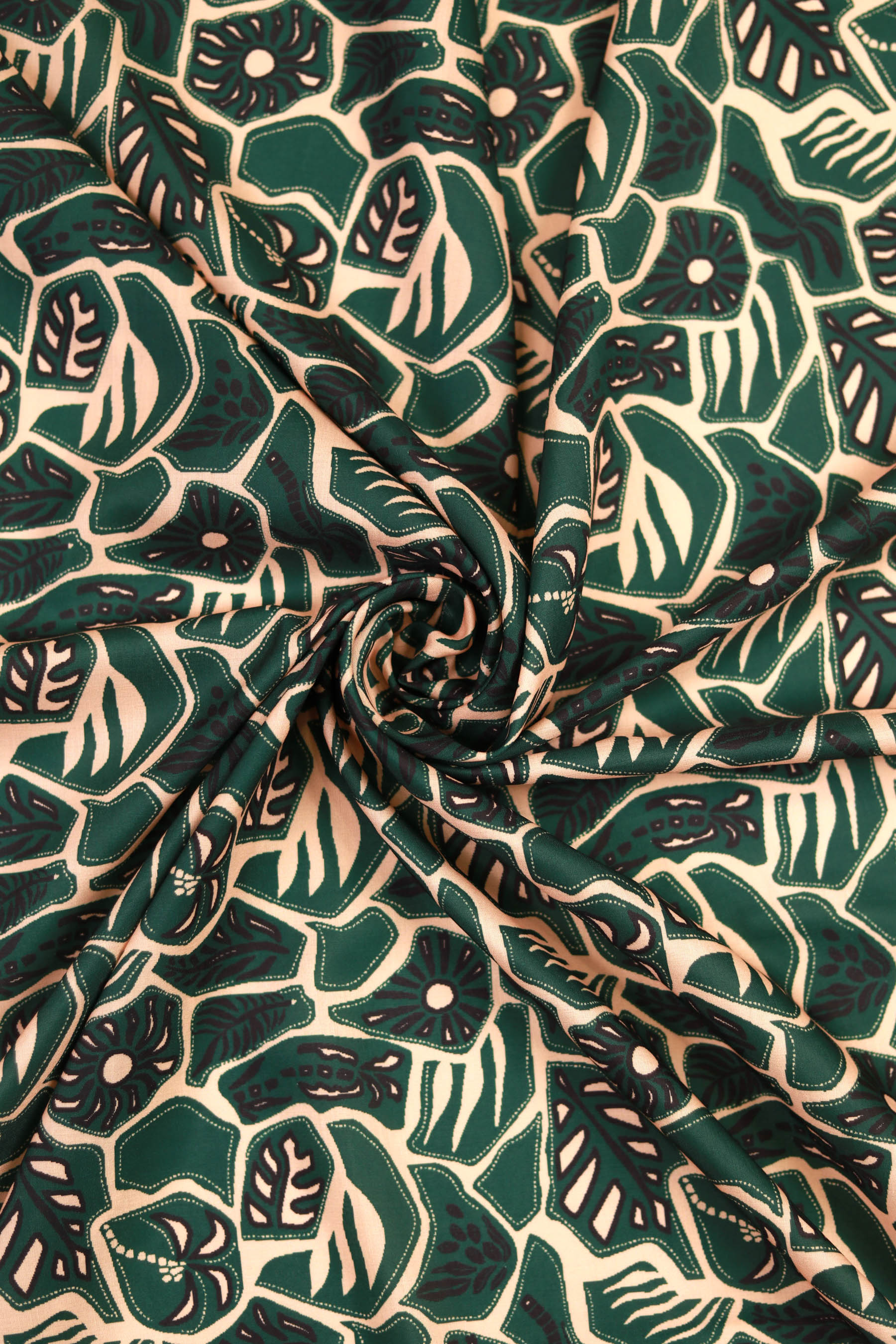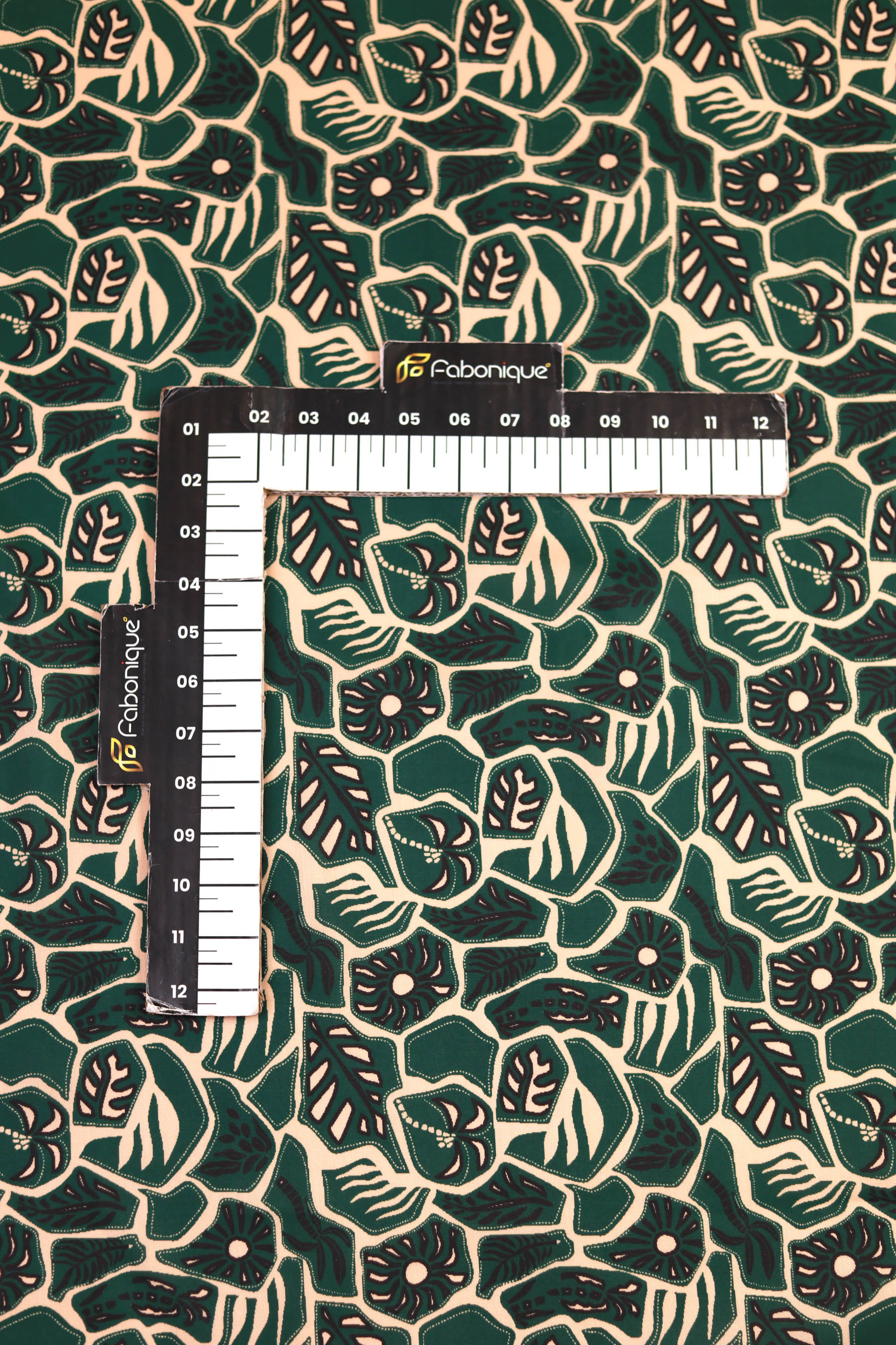 This muslin fabric showcases a botanical-inspired design with bold green leaves and abstract floral motifs arranged in block-style patterns. The motifs are outlined in white, giving a hand-printed, almost batik-like appeal. The contrasting green on beige base creates a striking yet earthy balance, giving the fabric both a rustic and contemporary look.