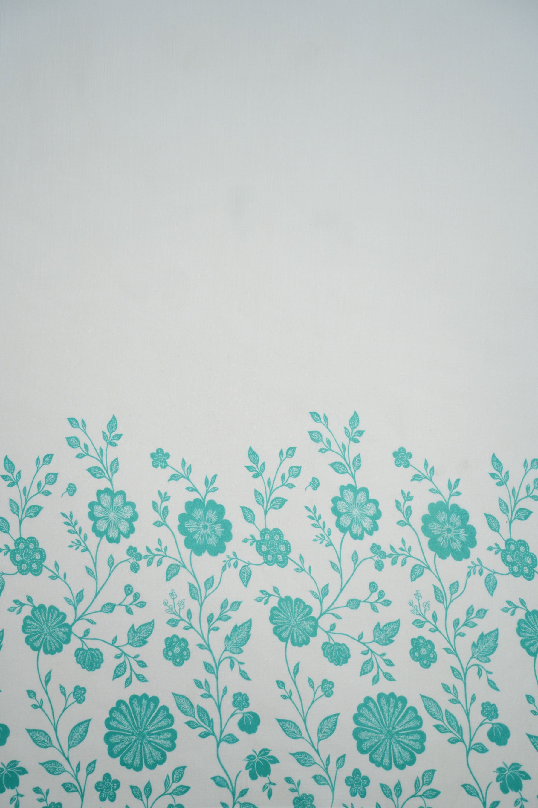 This is a lightweight muslin fabric with a soft ivory/white base, adorned with teal green floral motifs and vine creepers. The print style is block-print inspired, giving it a hand-printed, artisanal appeal. The floral patterns vary in size, creating balance and flow across the fabric.