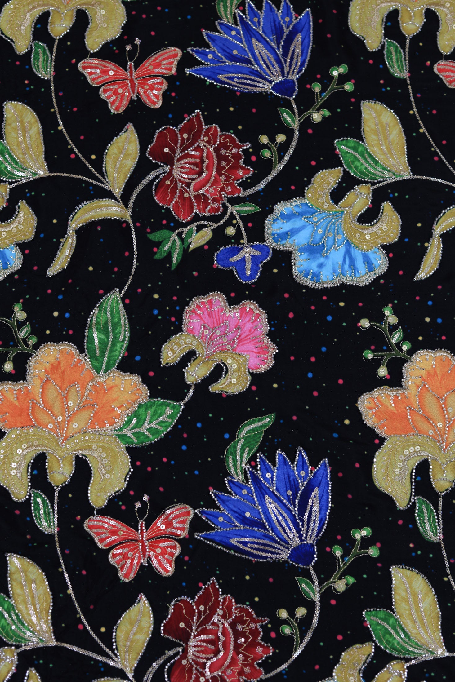 This fabric is crafted on a premium black crepe base, known for its soft drape, subtle texture, and graceful fall. It features vibrant floral and butterfly motifs in shades of pink, orange, maroon, yellow, blue, and green. Each motif is delicately hand-embroidered with zari threads, beads, and sequins, adding a luxurious shimmer to the fabric. The background is enhanced with scattered multicolored polka dots, giving it a modern and festive appeal.