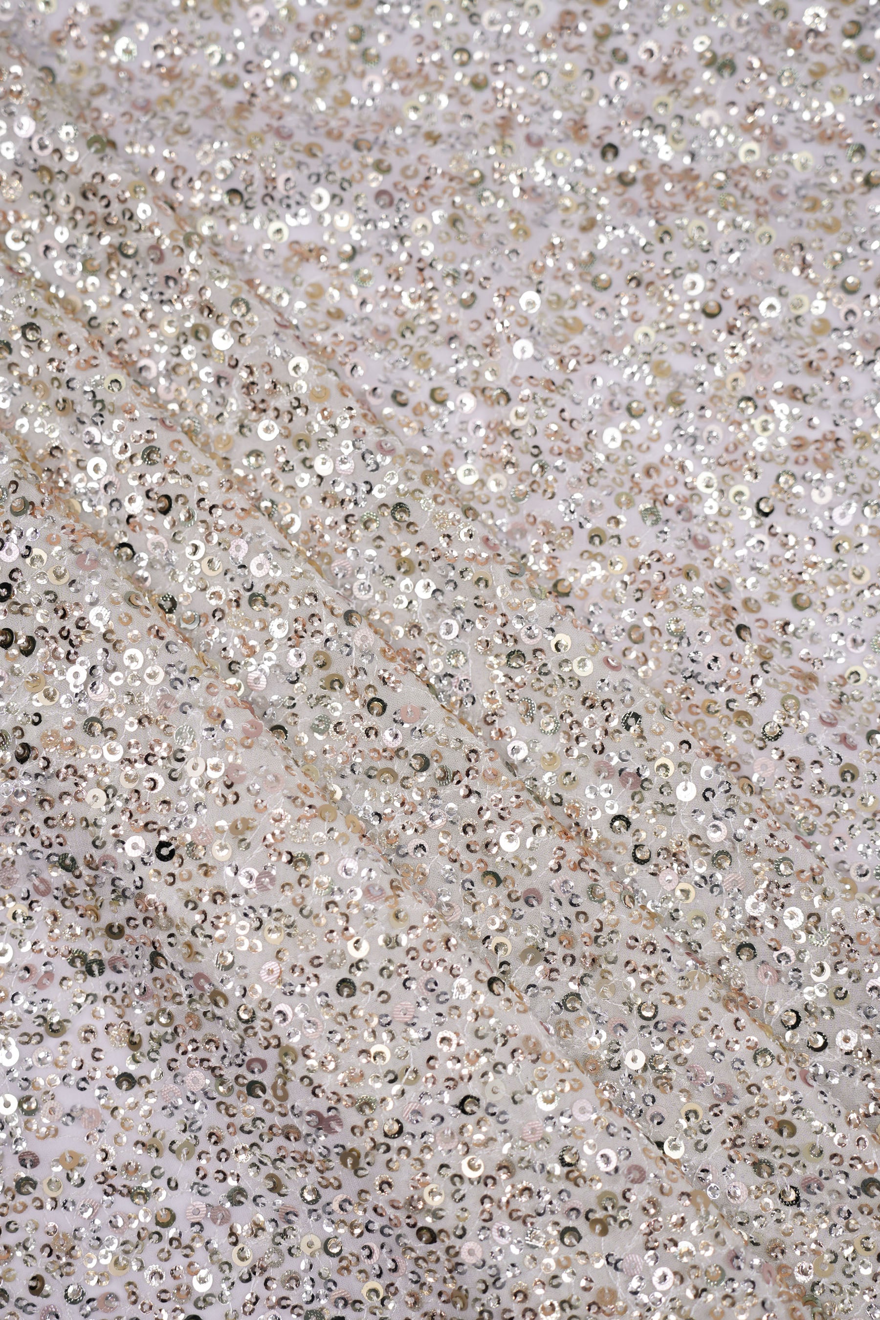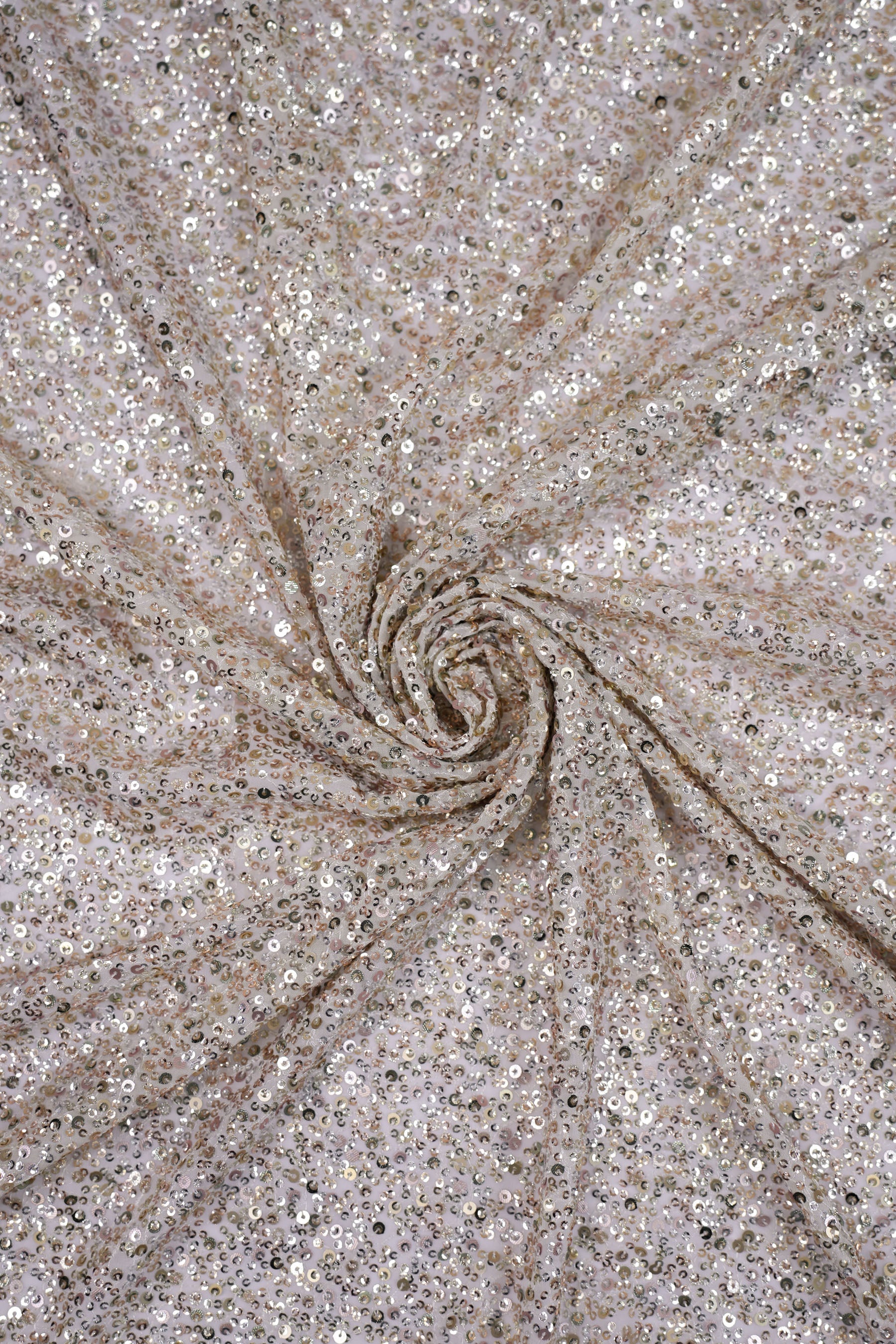 This fabric is a fully sequined base with dense, overlapping sequins in silvery-beige tones with iridescent highlights. The sequins catch light from every angle, creating a high-shine, glamorous surface reminiscent of a starlit night sky or sparkling champagne bubbles.