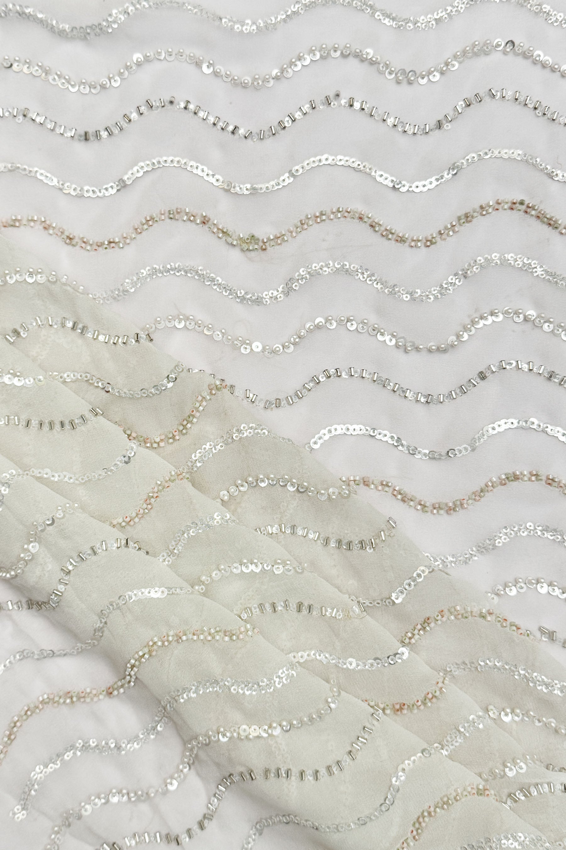 This delicate off-white or ivory sequin fabric features a graceful wave pattern embroidery made with alternating rows of silver, champagne, and pastel-toned sequins. The undulating design creates a soft, fluid shimmer reminiscent of moonlight dancing on rippling water.