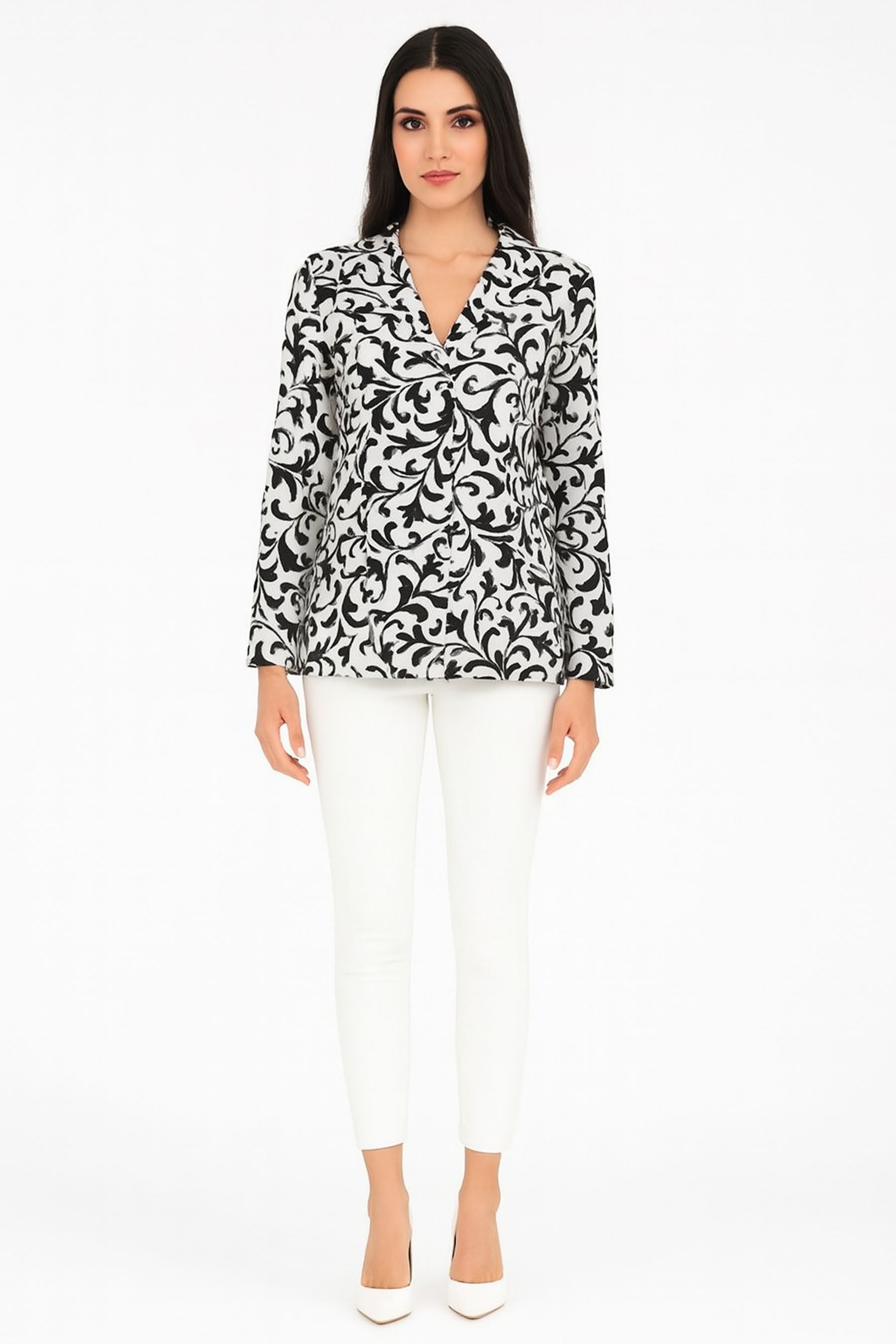 • Top Fabric: Premium muslin featuring an intricate black baroque floral pattern on a crisp white base. Perfect for crafting elegant blazers, statement kurtas, or contemporary tops.