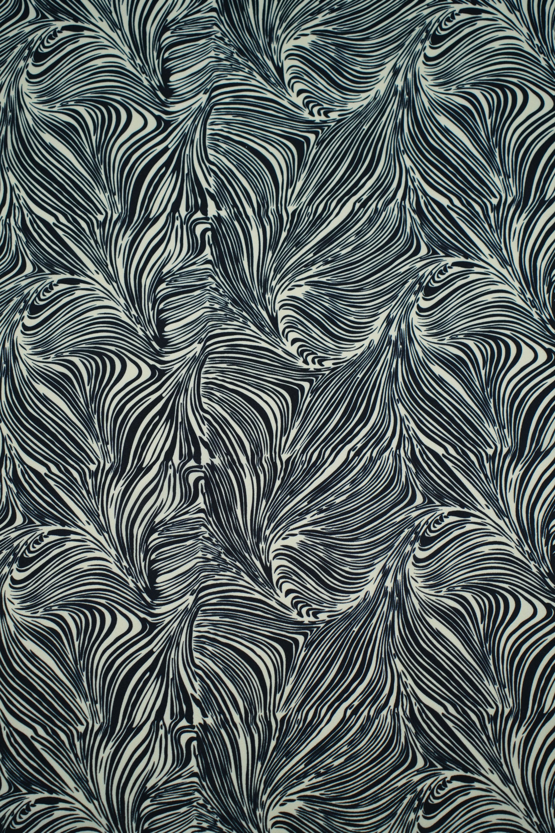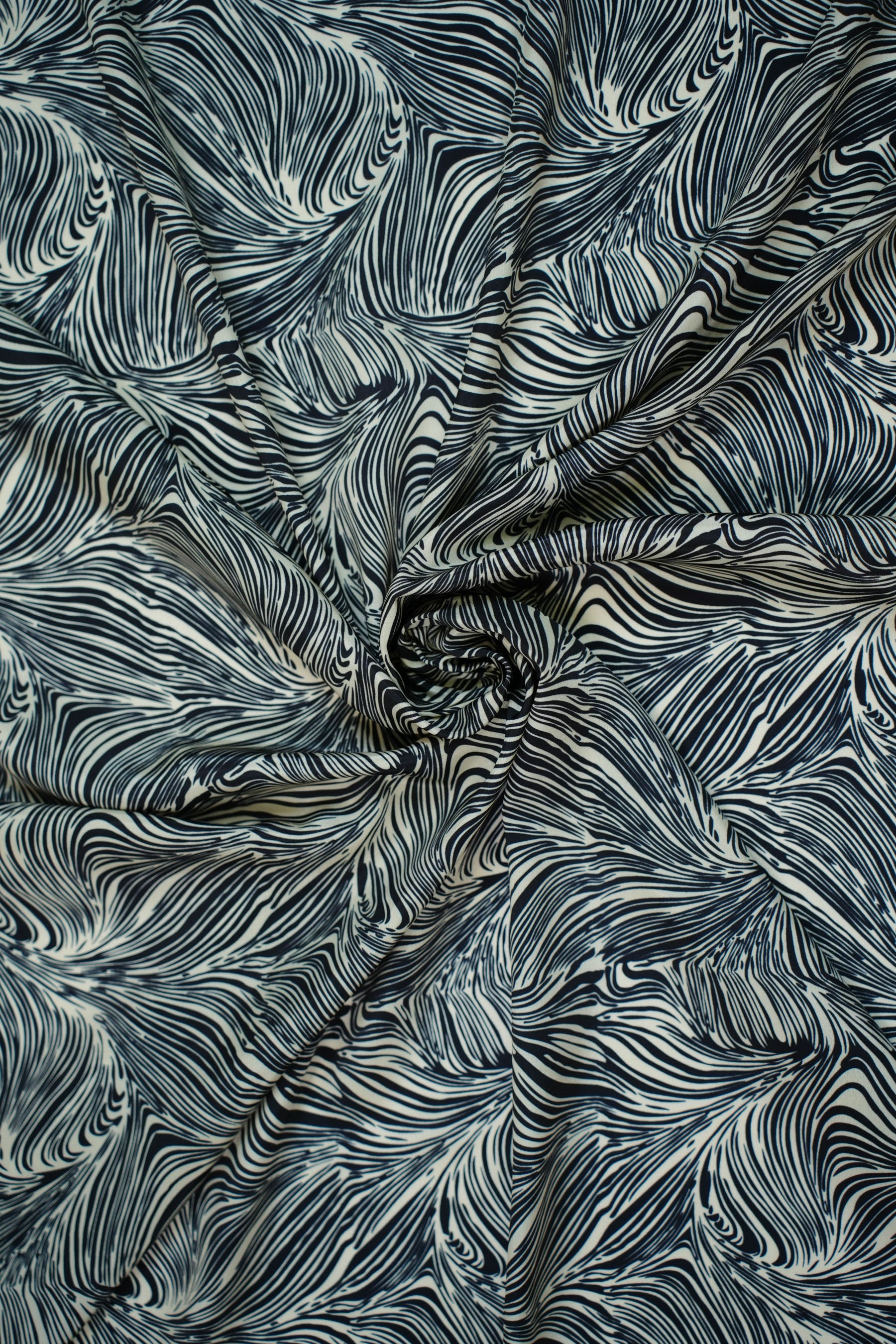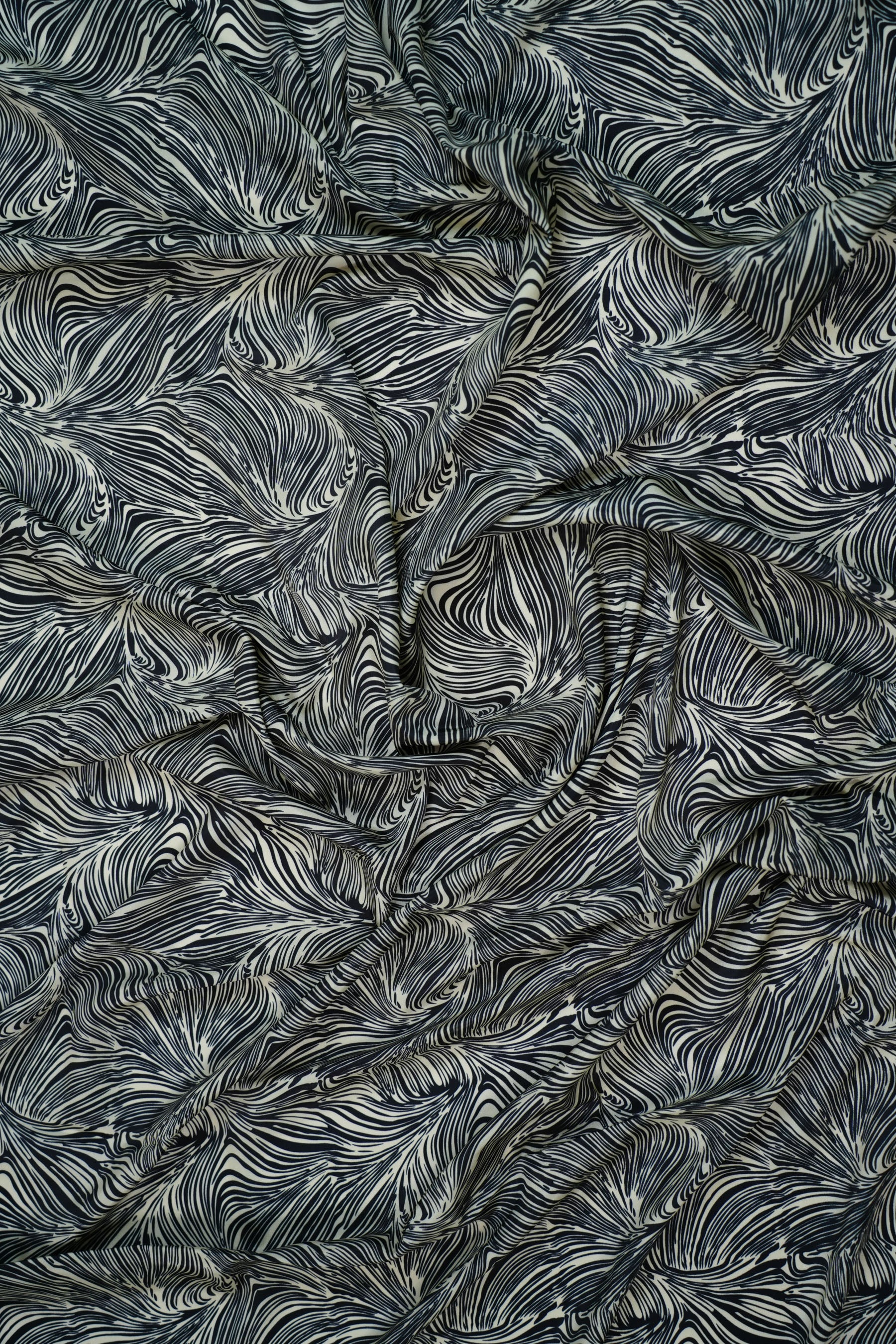 This French Crepe fabric features a cream base with bold black abstract swirl patterns resembling waves, marble veins, or zebra stripes. The high-contrast monochrome palette creates a modern, edgy, and sophisticated look.