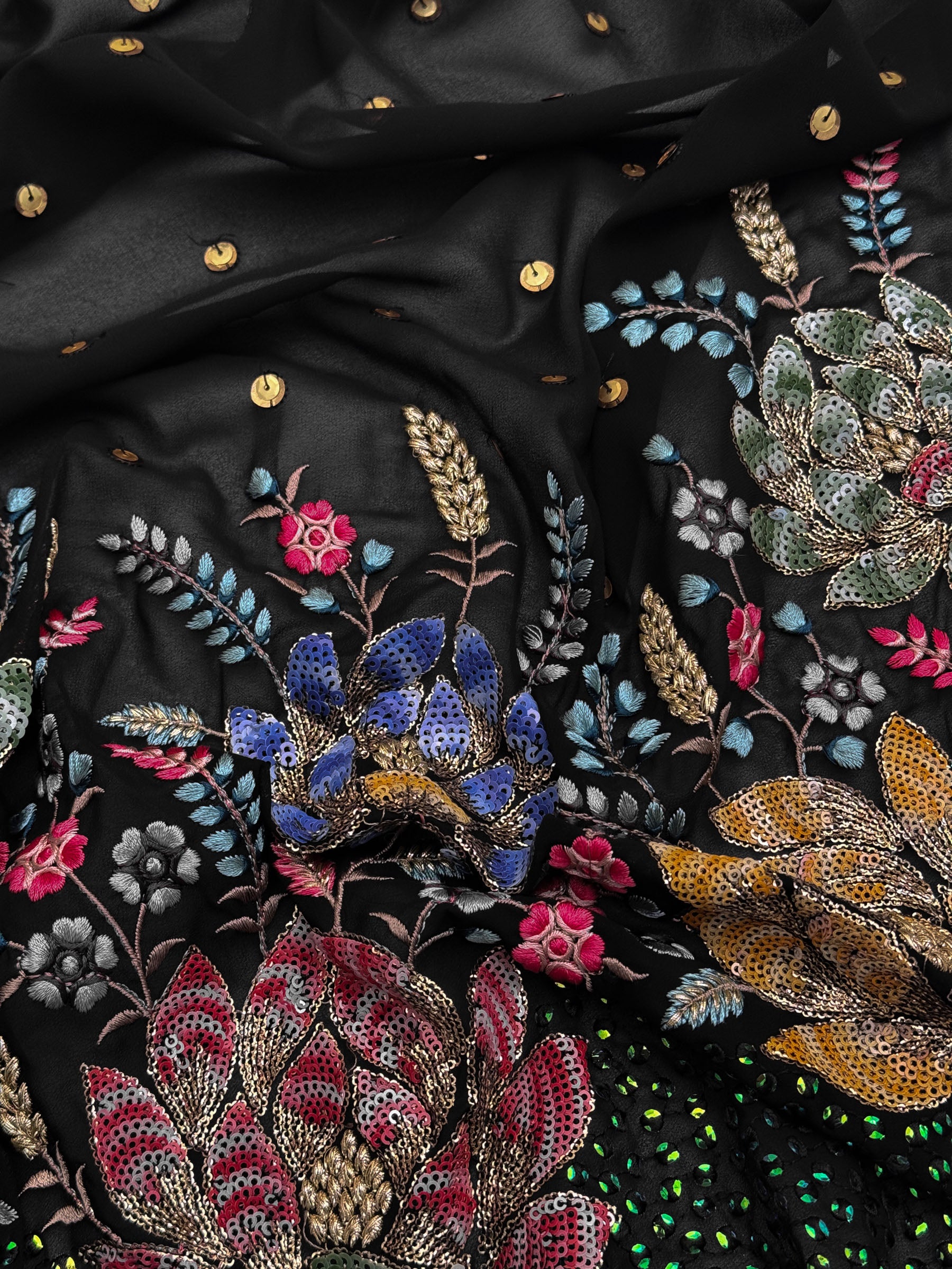 Noir Regal Bloom Sequin Embroidered Georgette Fabric non-dyeable
