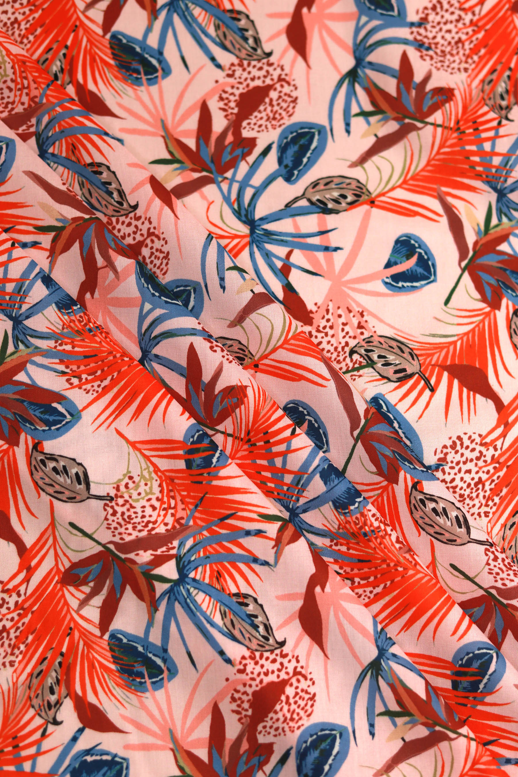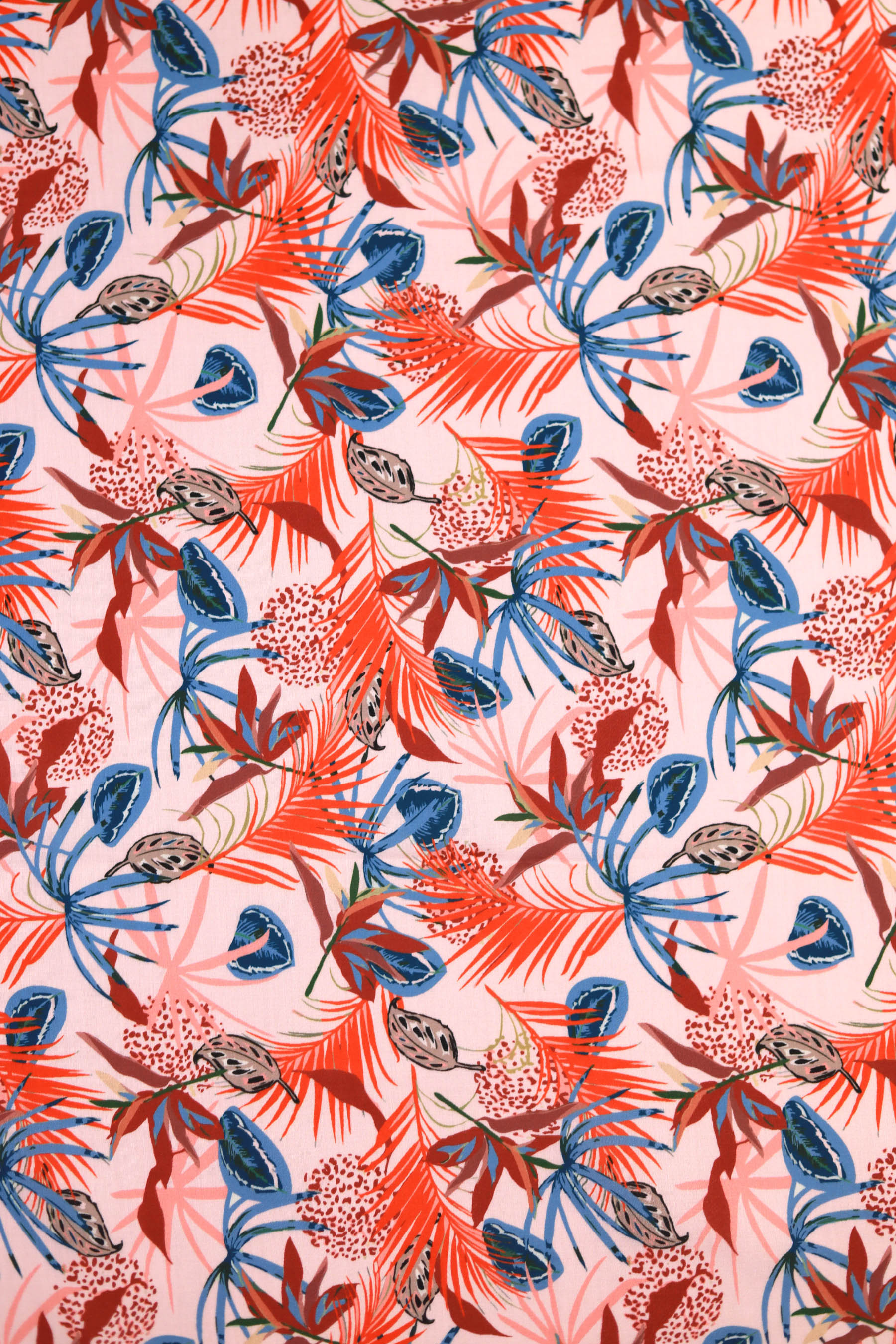 This muslin fabric showcases a vibrant tropical leaf and floral pattern in shades of coral orange, ocean blue, earthy brown, and soft green, set against a light base. The print blends palm fronds, abstract blooms, and leafy silhouettes, giving it an exotic and fresh look.