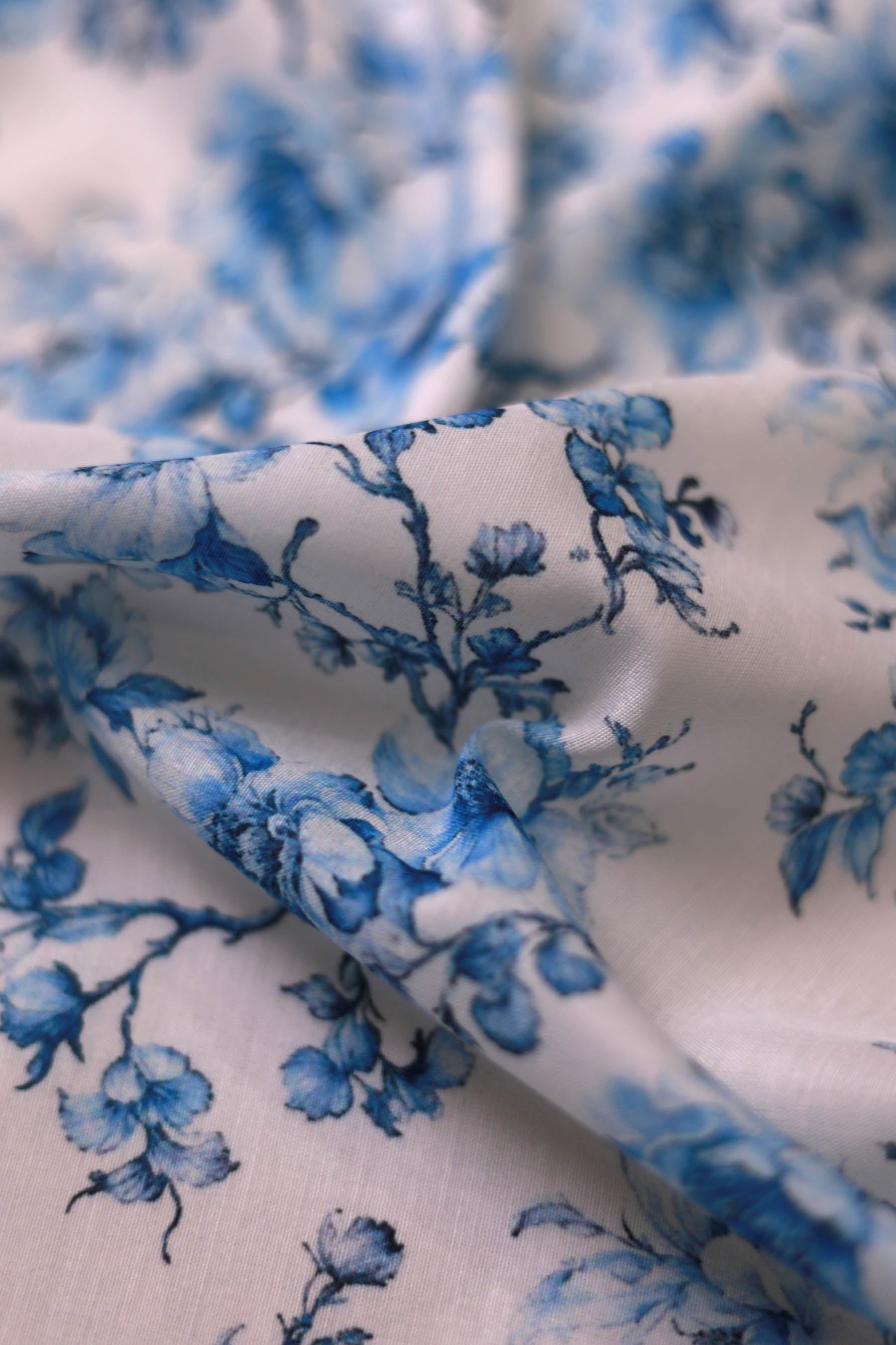This muslin fabric showcases a creamy white base adorned with delicate blue floral clusters and leafy vines, arranged in a painterly, almost watercolor-like style. The contrast of serene blue against the soft white background evokes a fresh, calm, and timeless elegance.