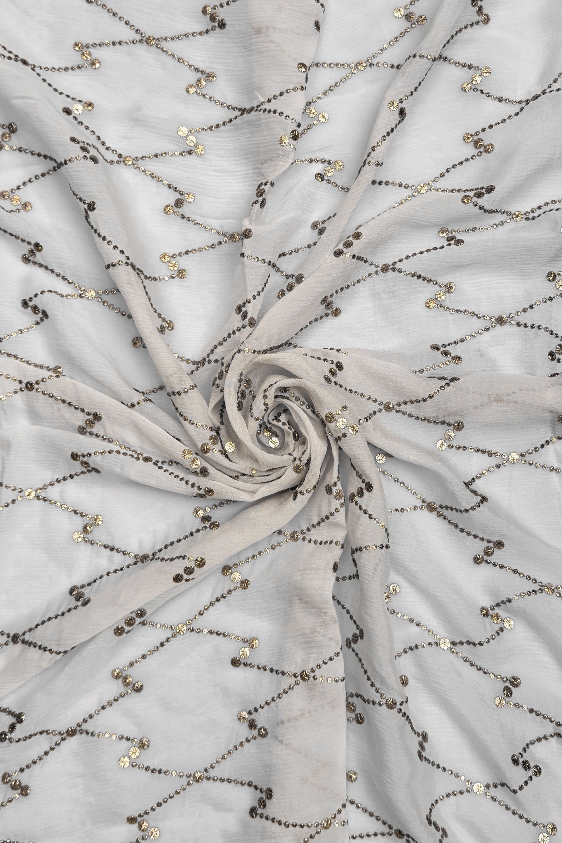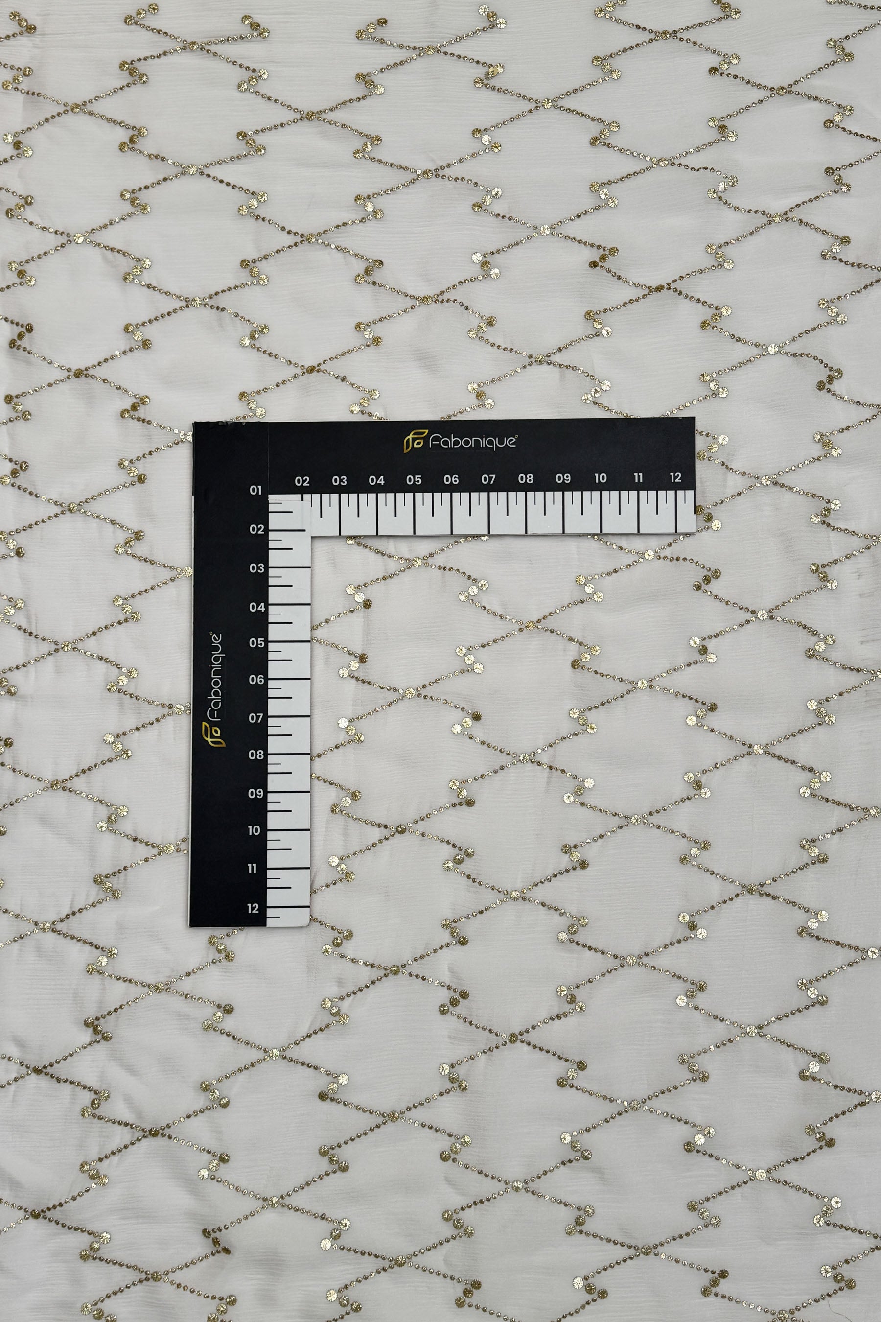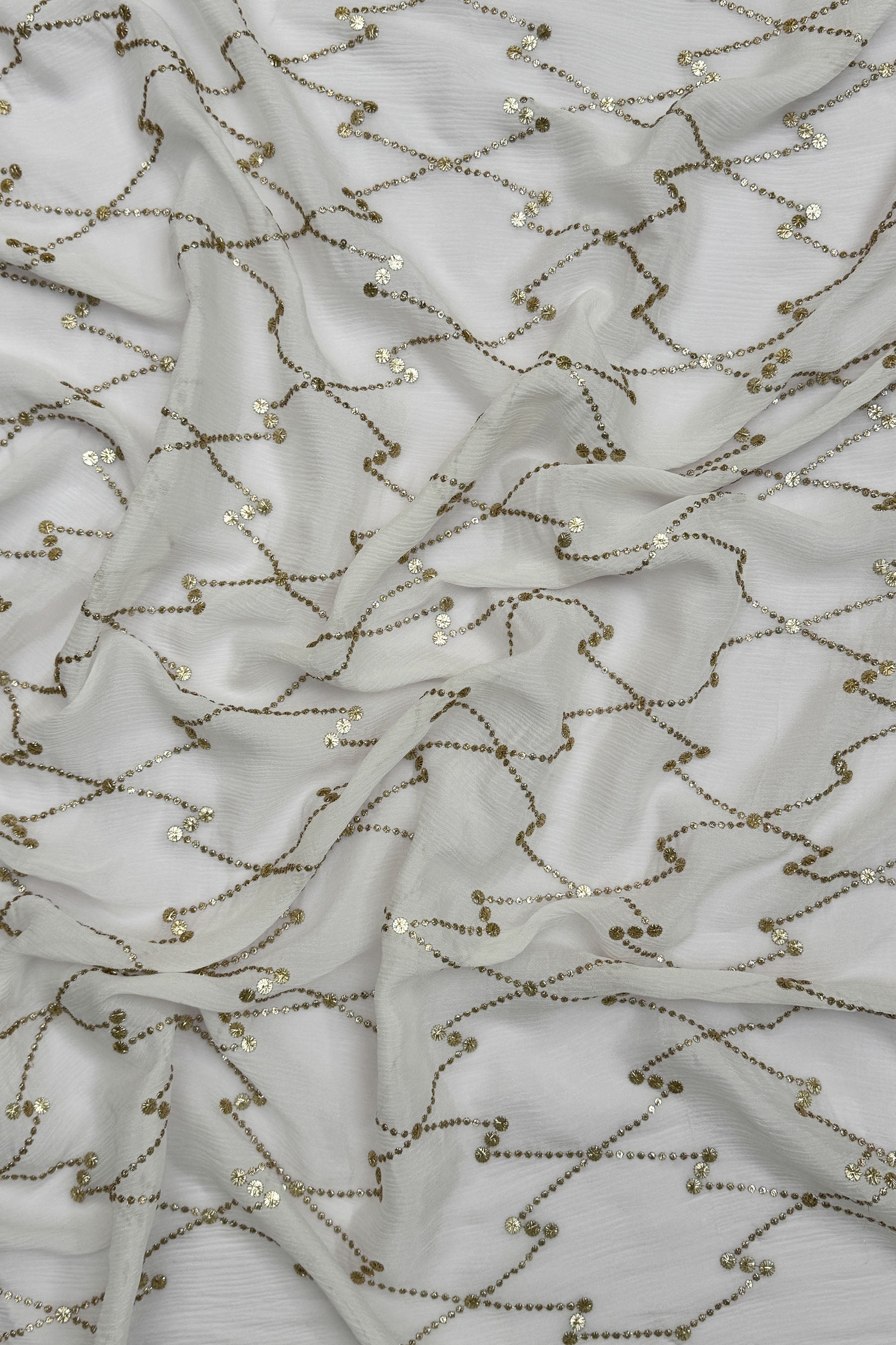 This fabric features a subtle ivory-white organza base intricately adorned with gold sequin embroidery forming diamond-shaped lattice patterns. The embroidery is done in a neat, symmetrical layout, creating a refined and graceful geometric look. The sequins shimmer gently under light, adding a luxurious yet understated glow. The fabric’s sheer texture and soft stiffness make it perfect for structured drapes and elegant overlays.