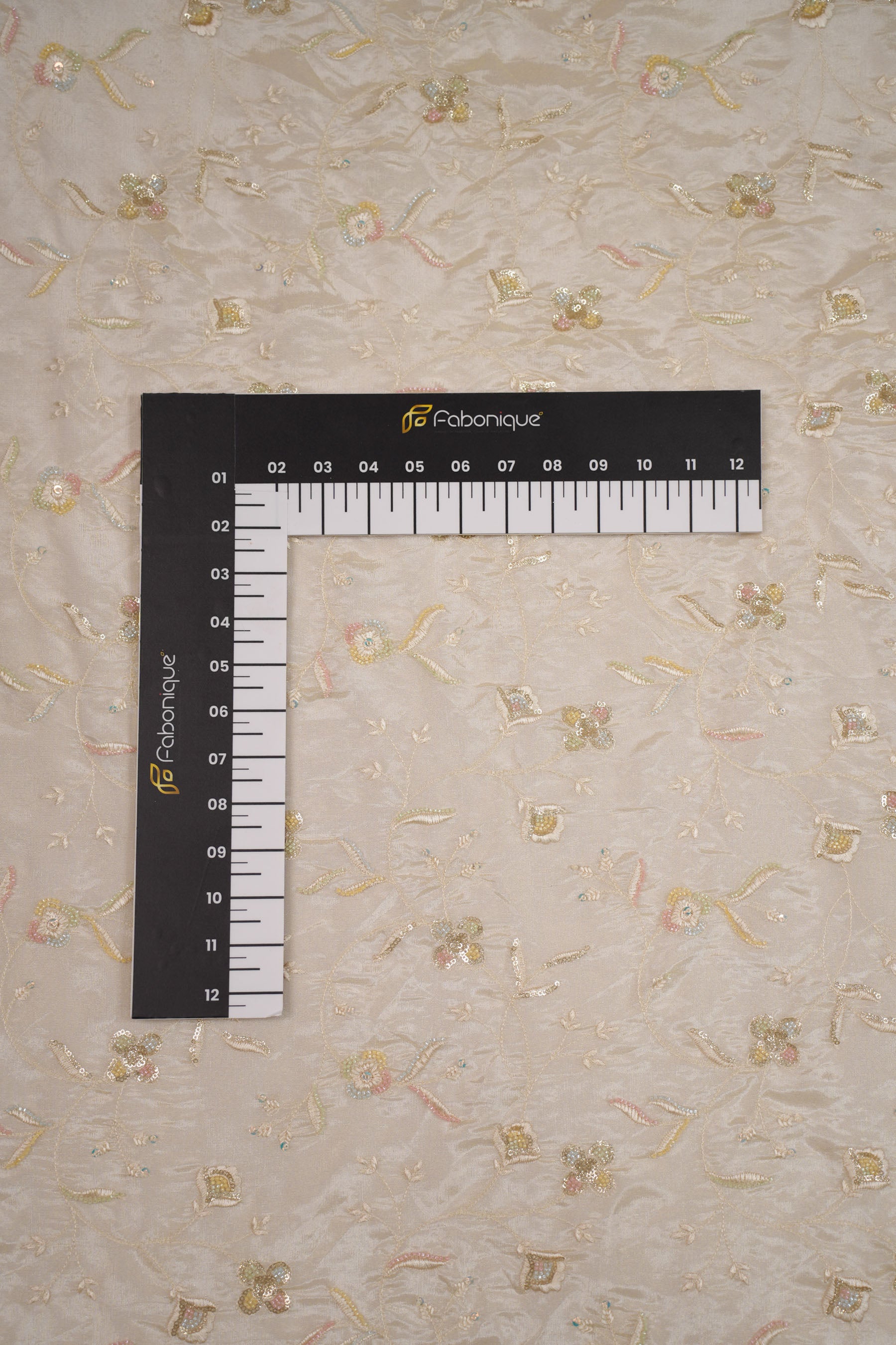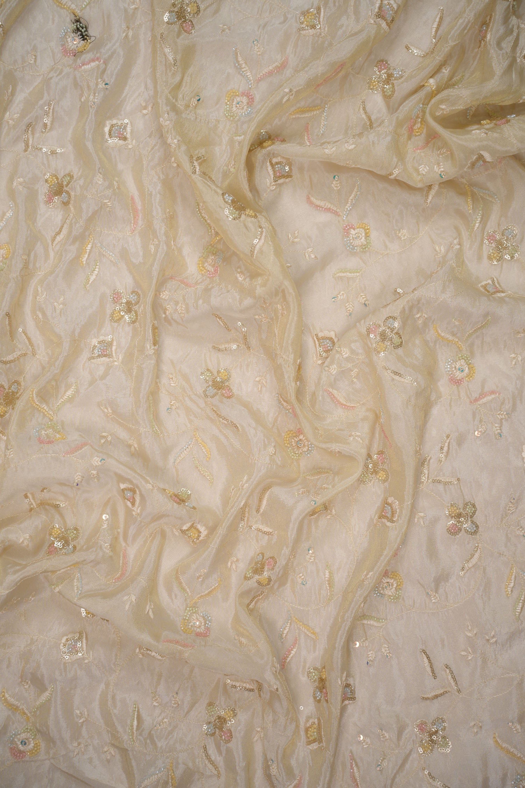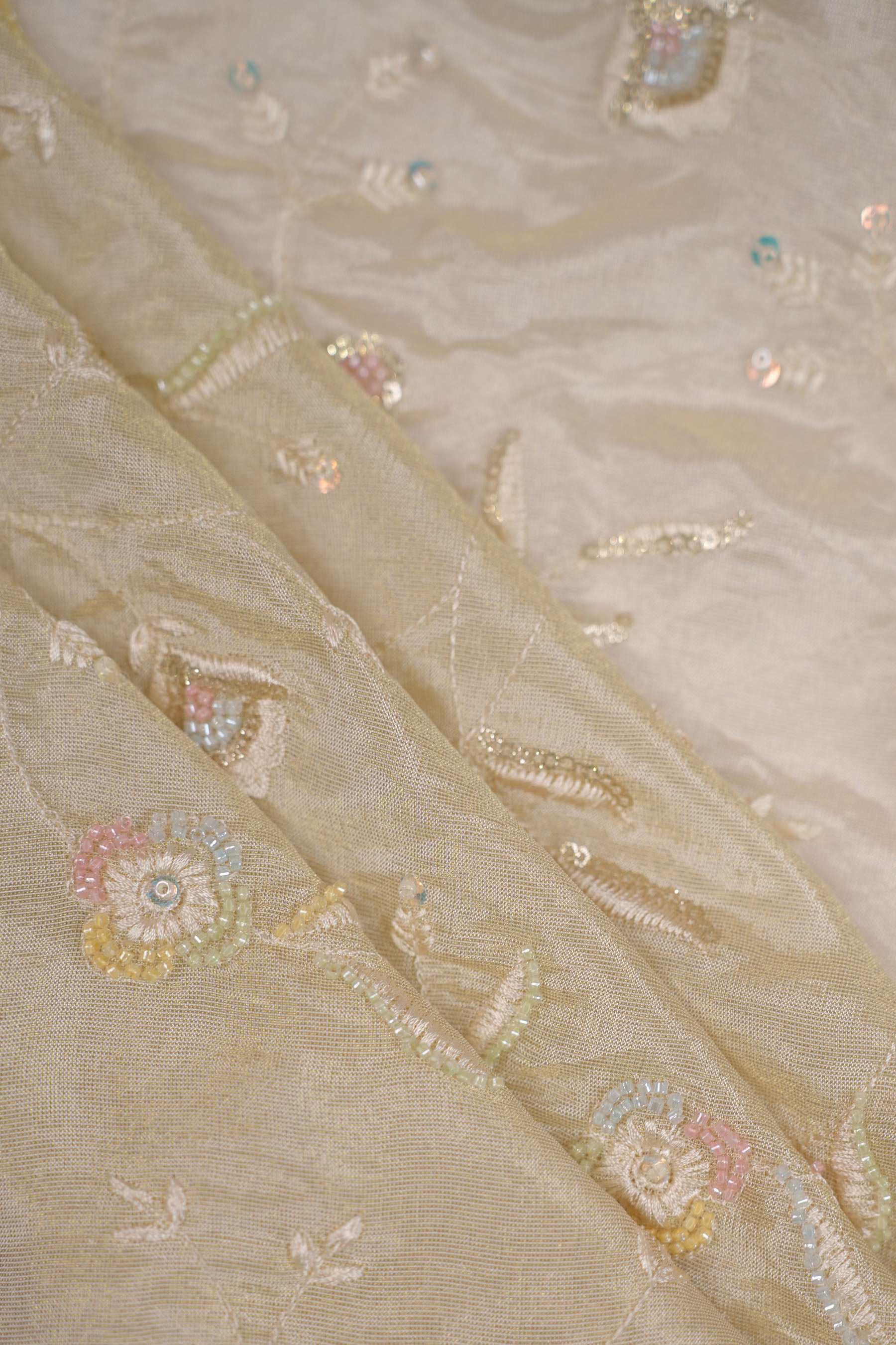 This fabric features a soft beige-golden base delicately adorned with pastel floral embroidery in muted shades of pink, blue, green, and yellow. The design combines tiny floral clusters, vines, and leaf motifs enhanced with sequins and threadwork, creating a balanced blend of subtle shimmer and handcrafted artistry.