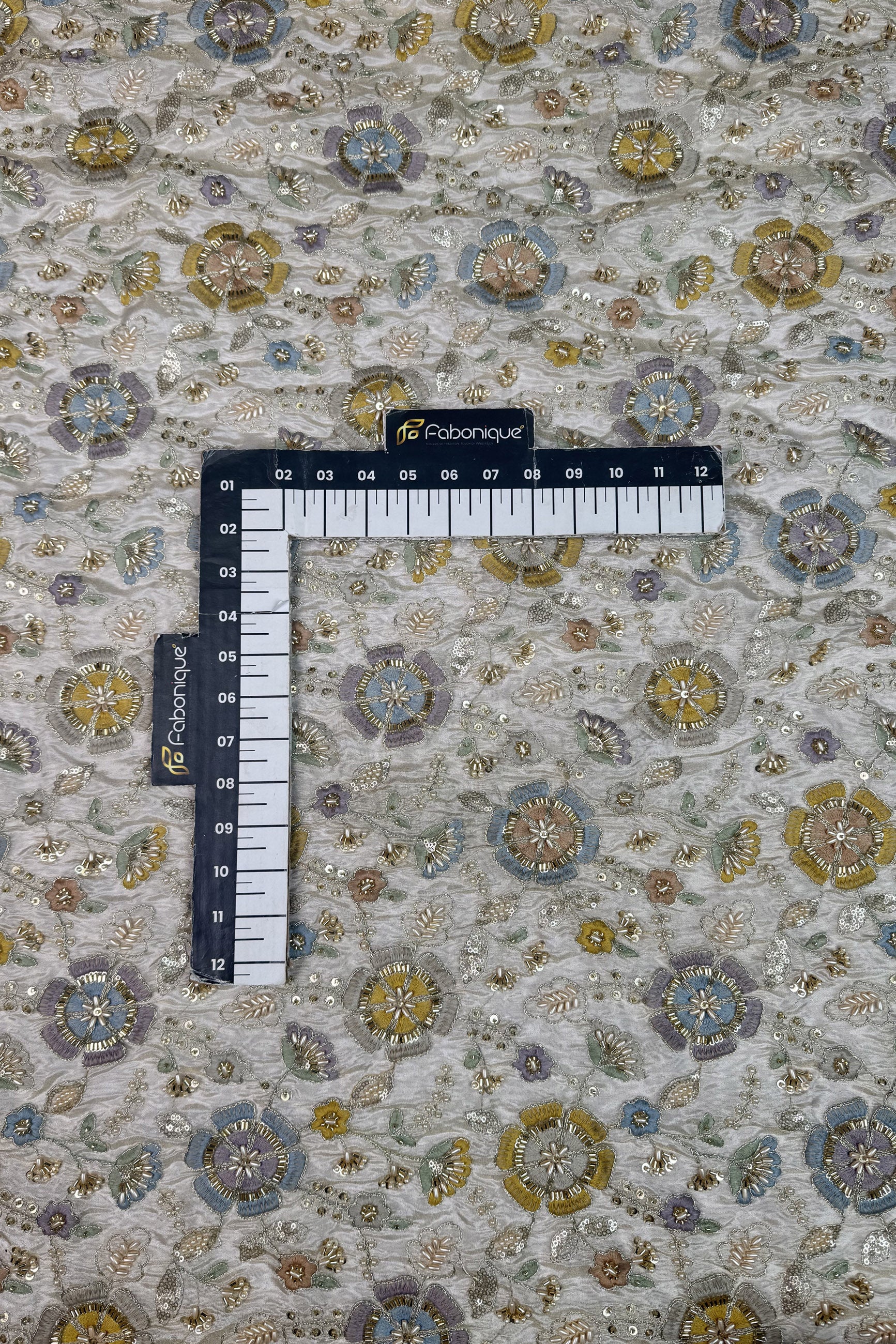 This luxurious fabric is crafted on a shimmery champagne gold tissue base, known for its crisp texture and subtle sheen that exudes elegance. It features intricate multicolored floral embroidery in pastel shades of mustard yellow, powder blue, soft lavender, and blush pink. The embroidery is further highlighted with sequins, zari threadwork, and delicate pearl bead accents, giving it a rich and regal appeal.