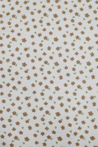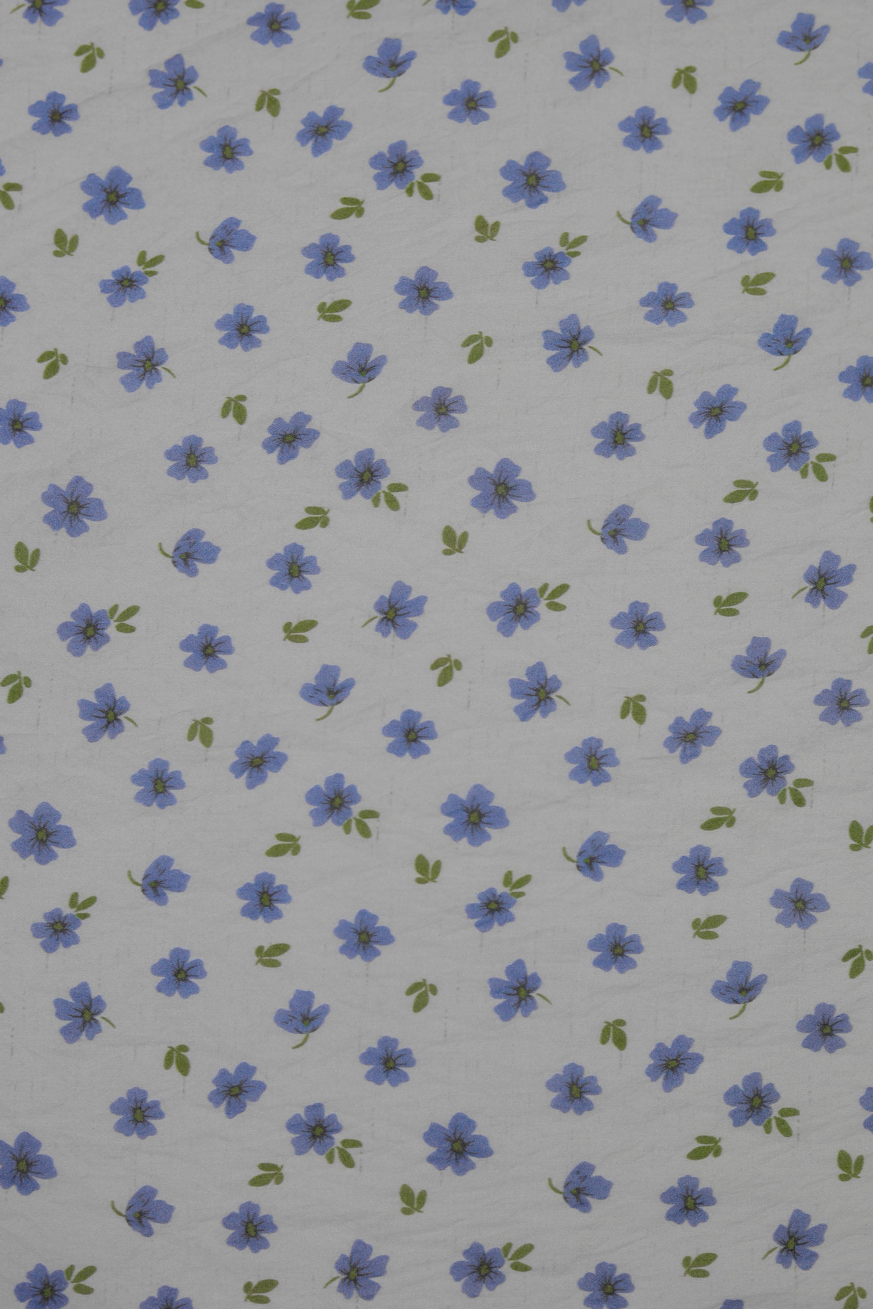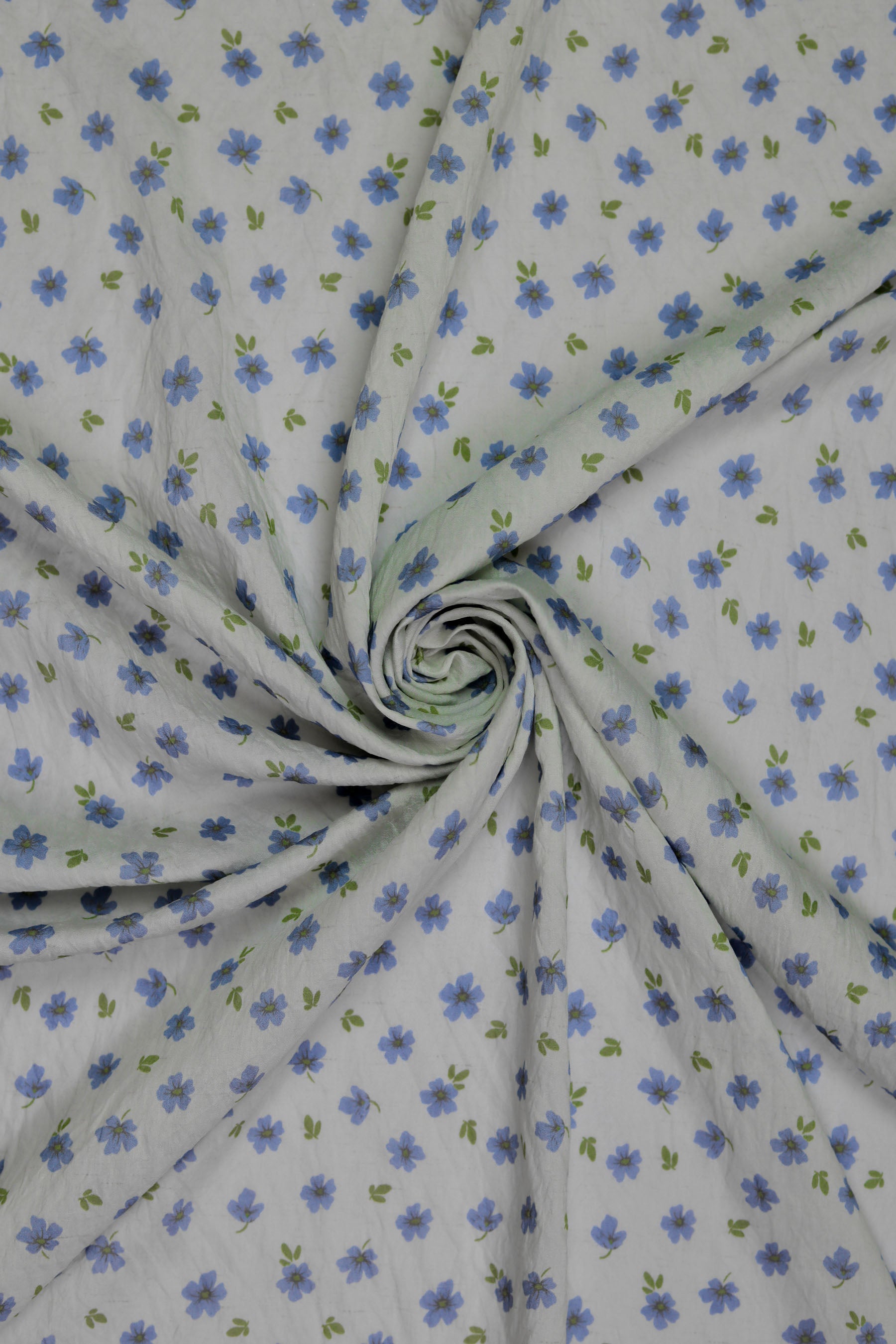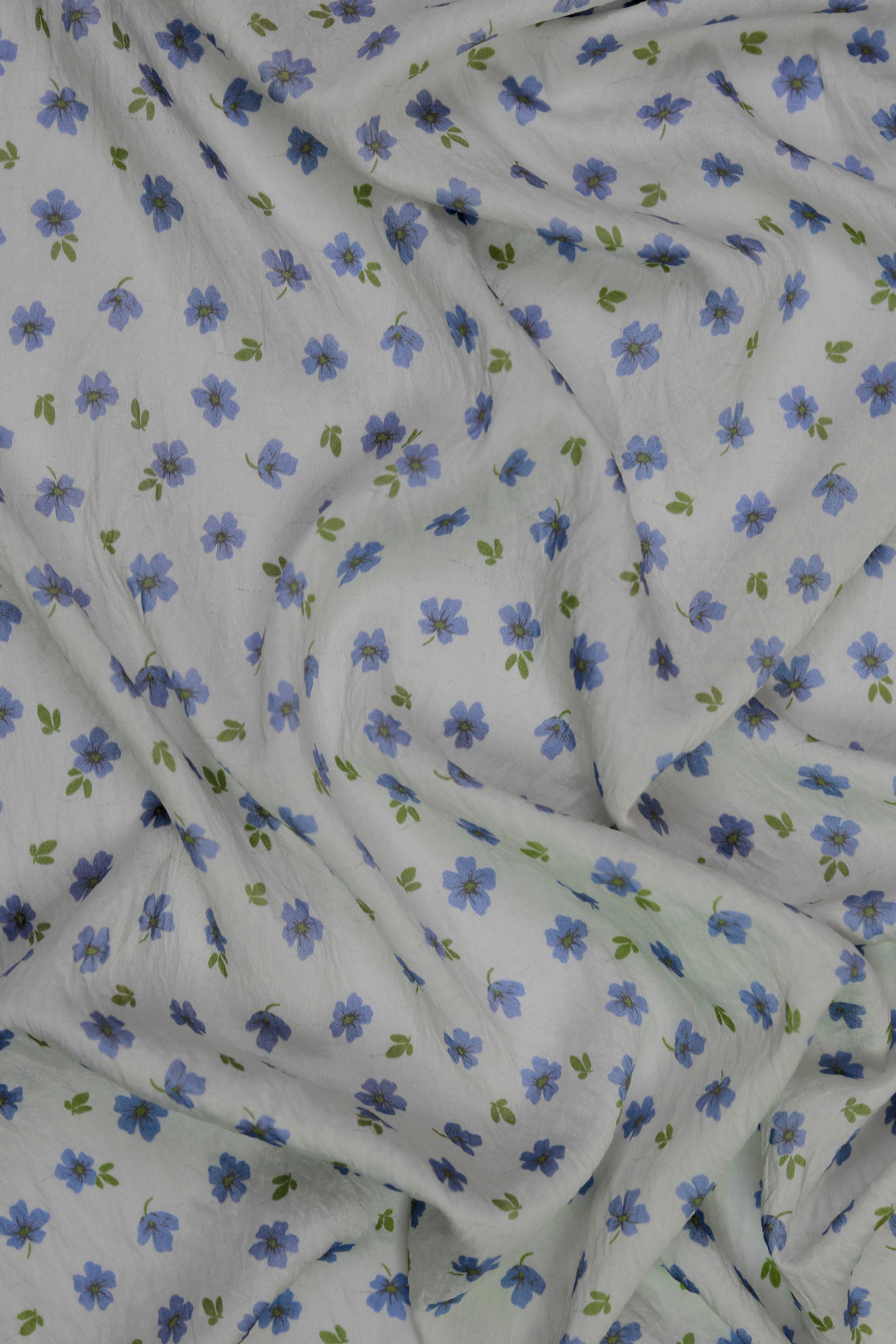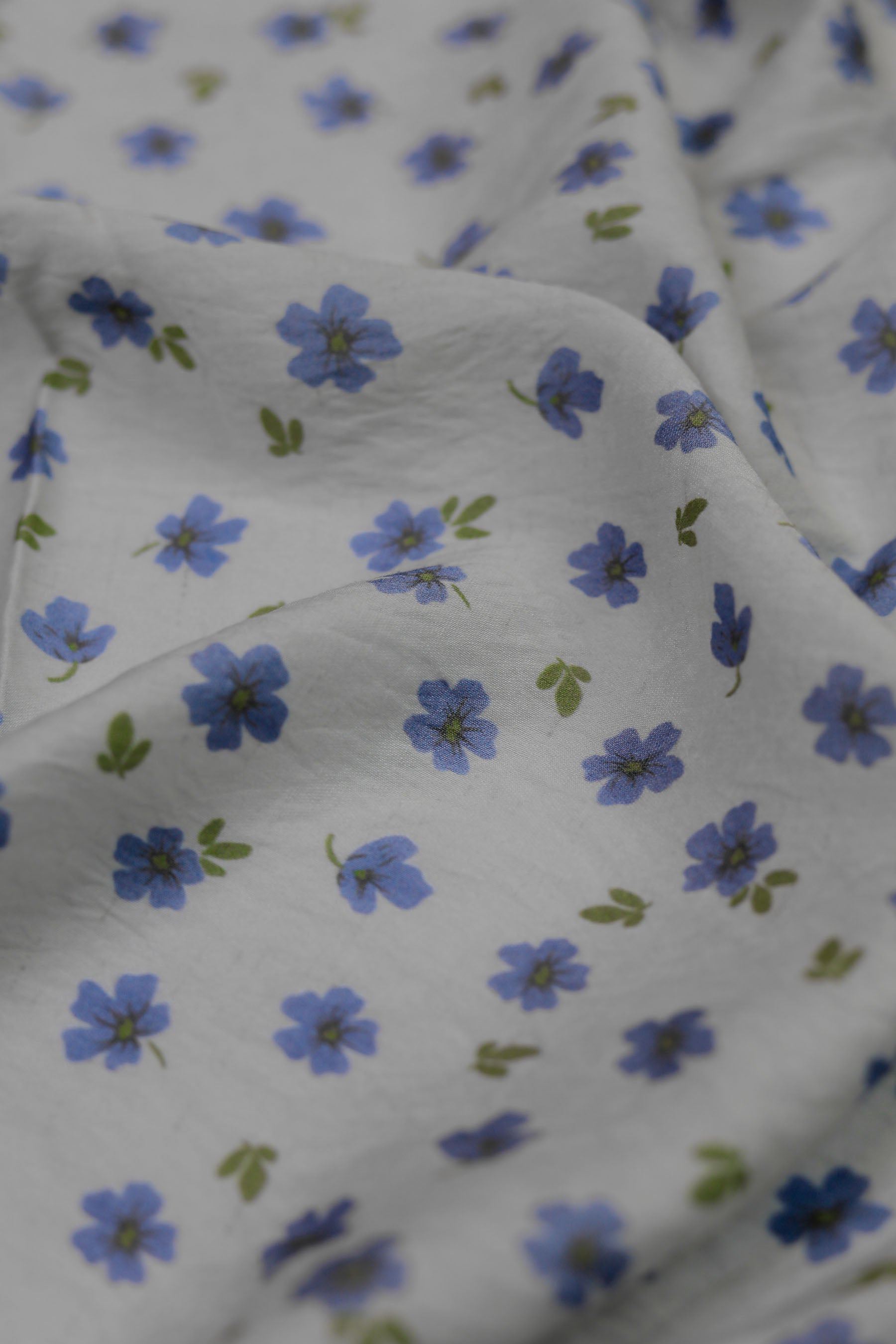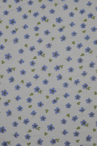 This fabric features a soft ivory base scattered with dainty sky-blue flowers and subtle olive-green leaves. The delicate print evokes a sense of calm, grace, and timeless elegance, perfect for creating light and flowy garments. With a luxurious blend of 85% pure viscose and 15% nylon, the fabric feels incredibly soft against the skin, drapes effortlessly, and has a natural sheen that adds to its refined look.