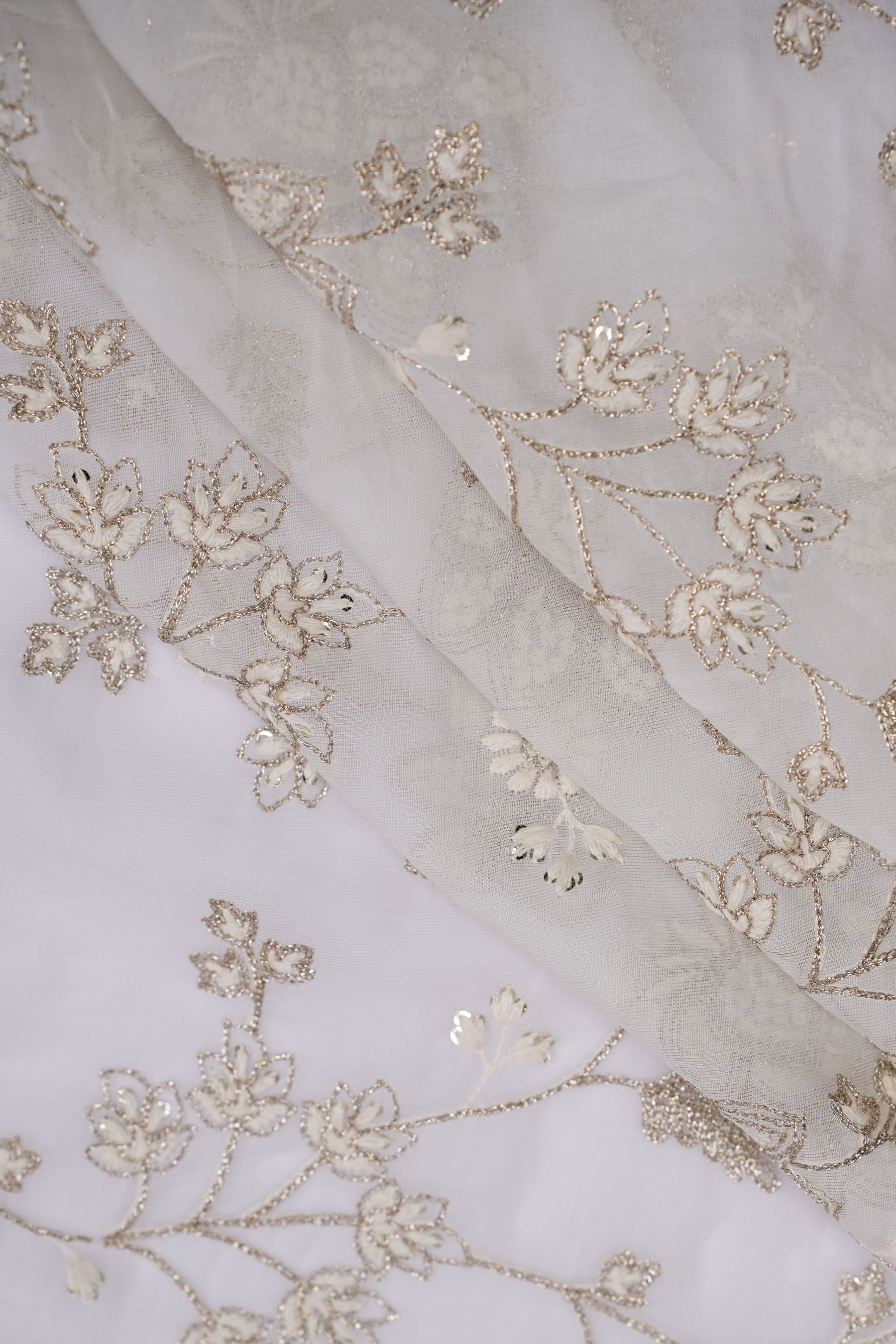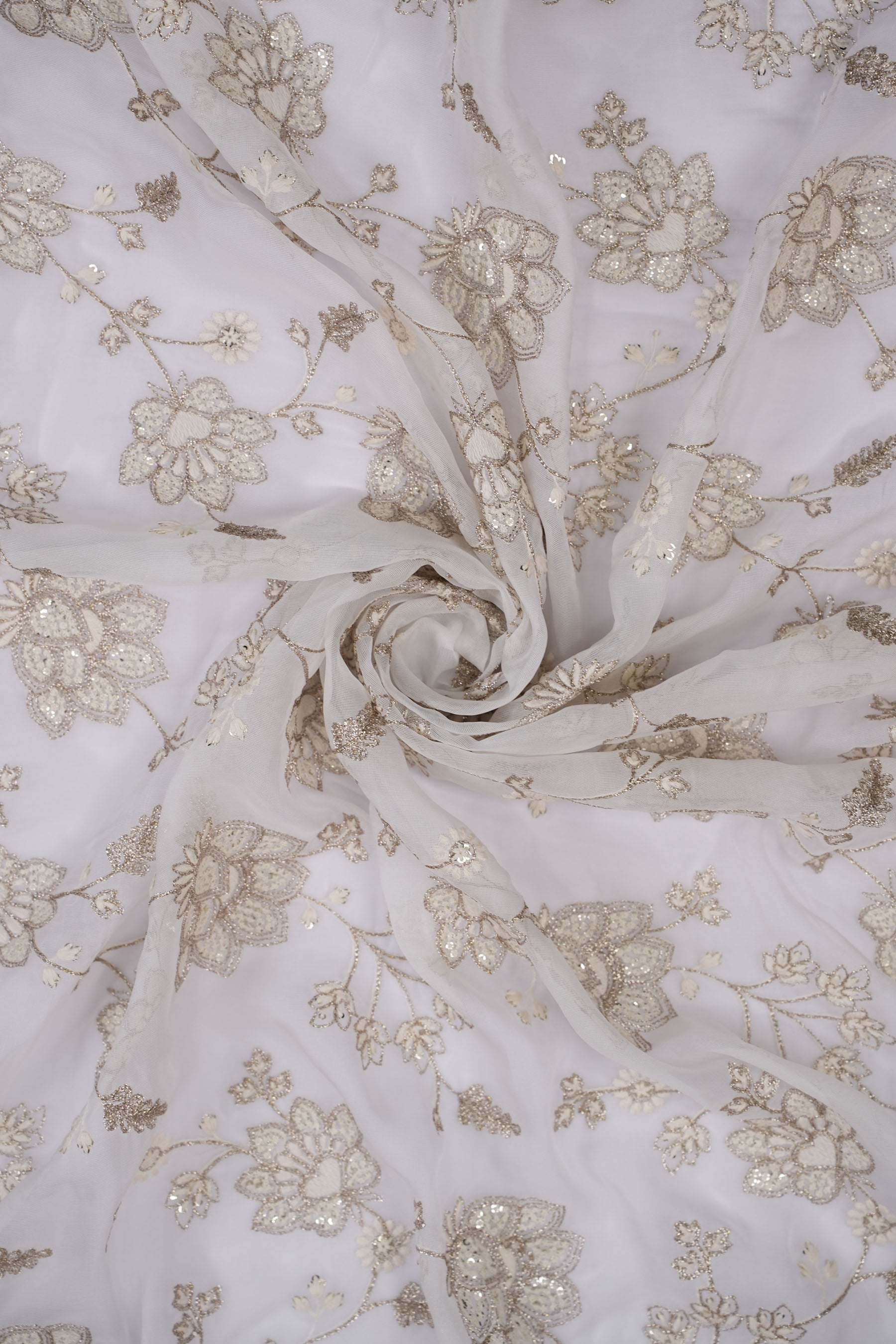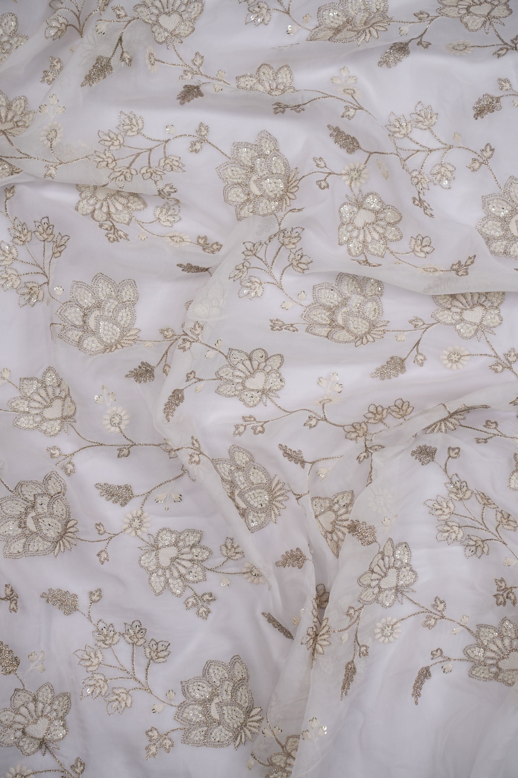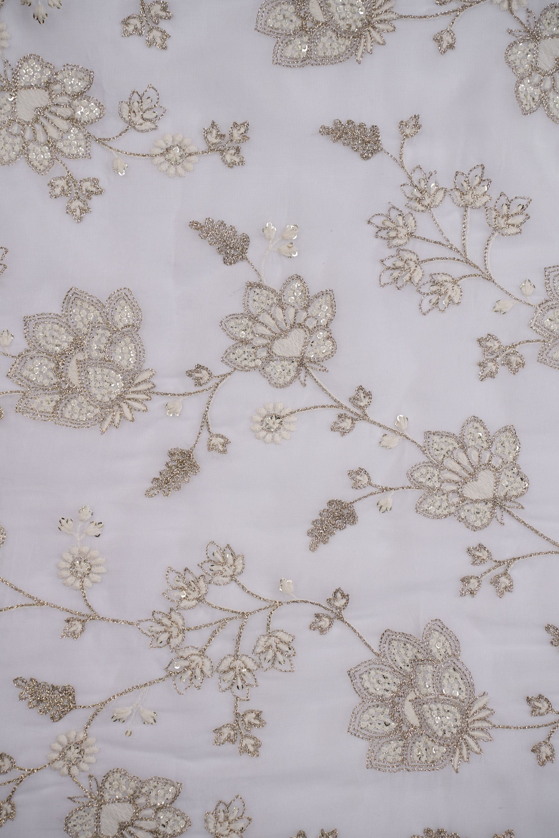 The floral motifs are connected with trailing vines and fine leaves, creating a garden-inspired aesthetic. The sequins are strategically placed to catch the light, giving the fabric a luxurious yet understated sparkle. Its texture is lightweight and airy, making it ideal for elegant drapes and flowy outfits.