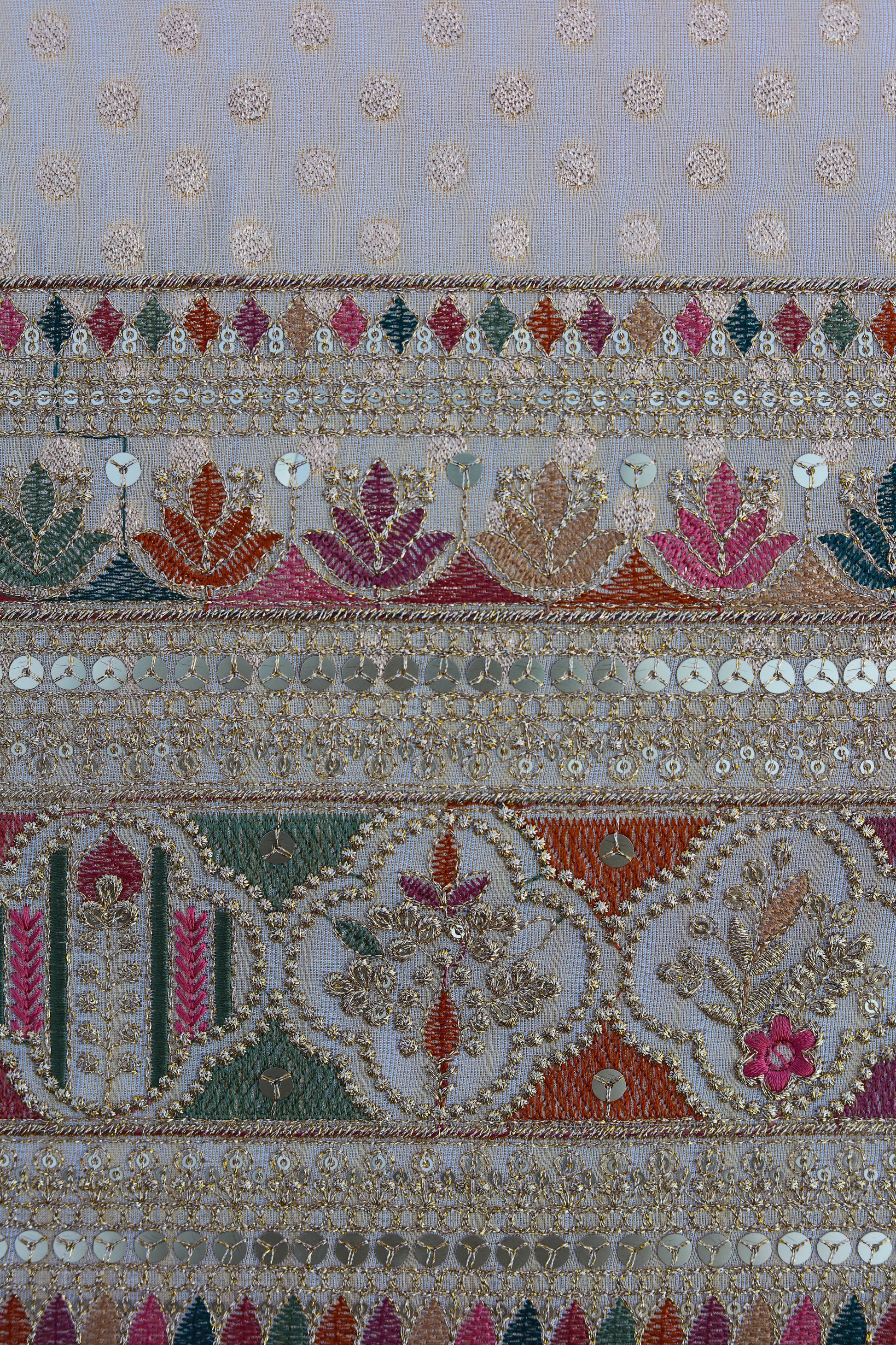 A stunning fabric featuring a classic polka dot pattern on a creamy white base, paired with a richly embroidered multicolor border. The border showcases intricate floral designs, sequins, and vibrant threadwork, making this fabric perfect for festive occasions or statement apparel. The shimmering sequins add an extra sparkle, elevating the elegance of this piece.
