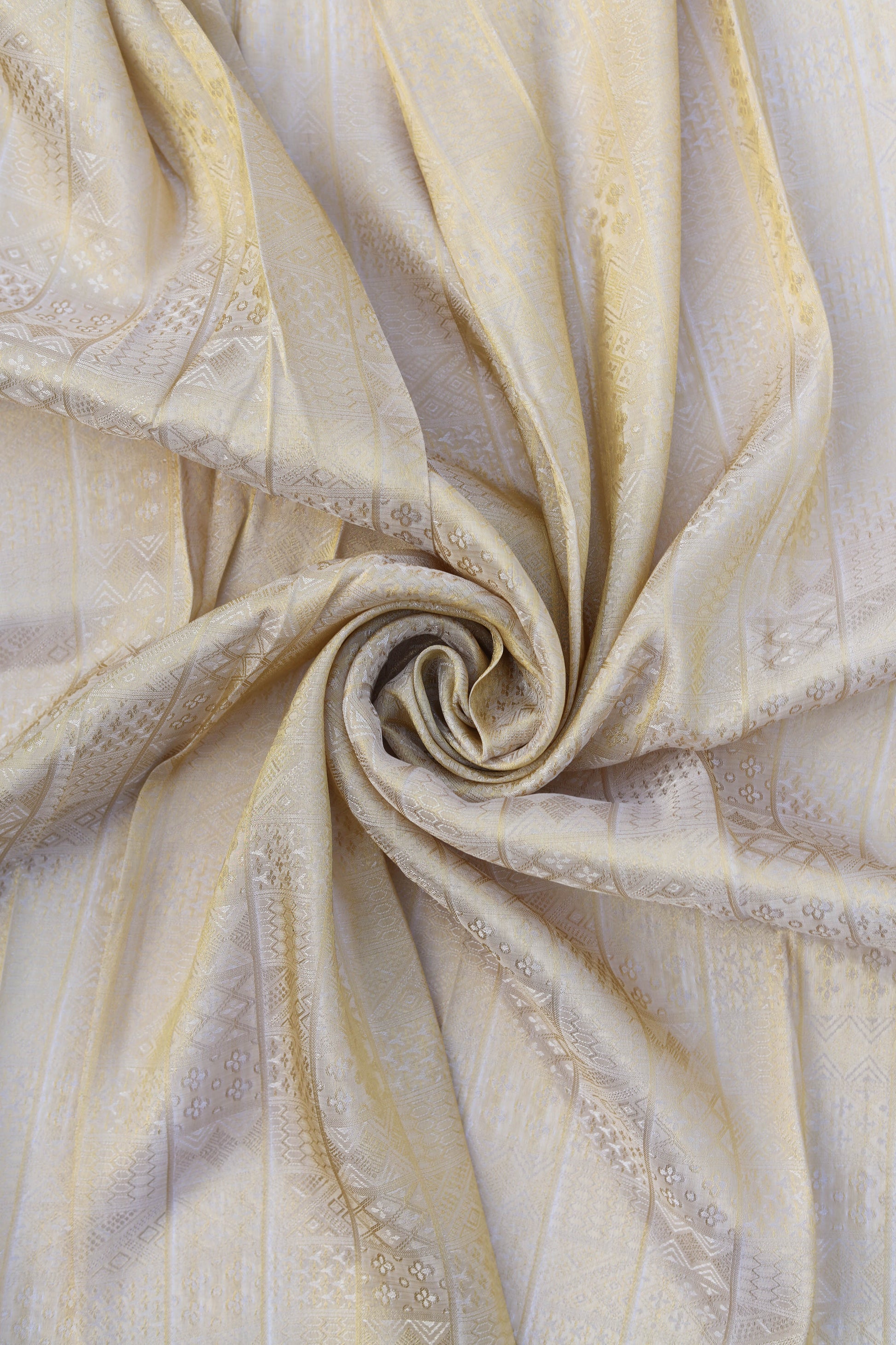 This fabric showcases a harmonious blend of intricate ethnic and geometric motifs in a luxurious woven design. The shimmering texture and detailed patterns add an element of opulence, making it ideal for crafting regal ensembles and statement décor pieces.