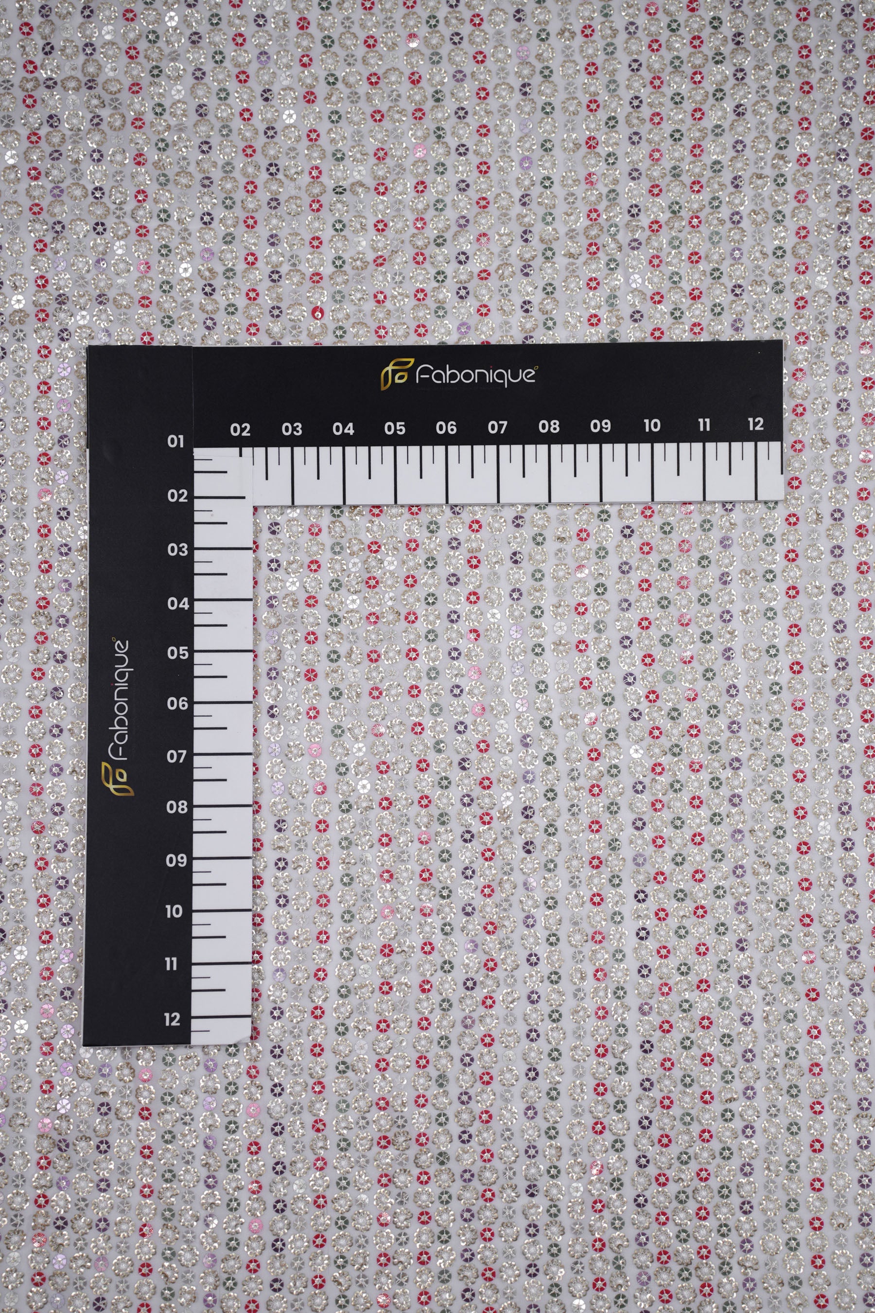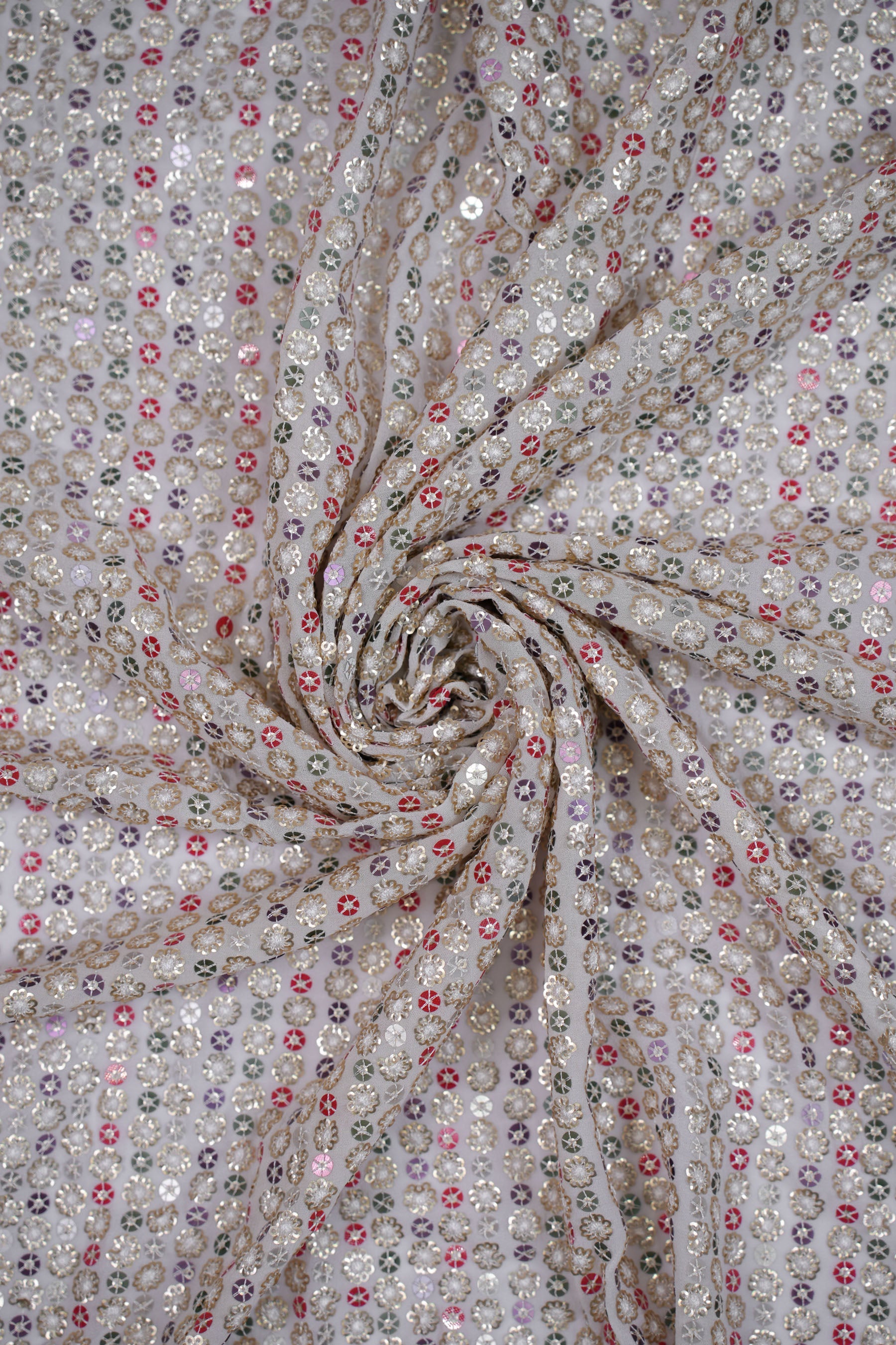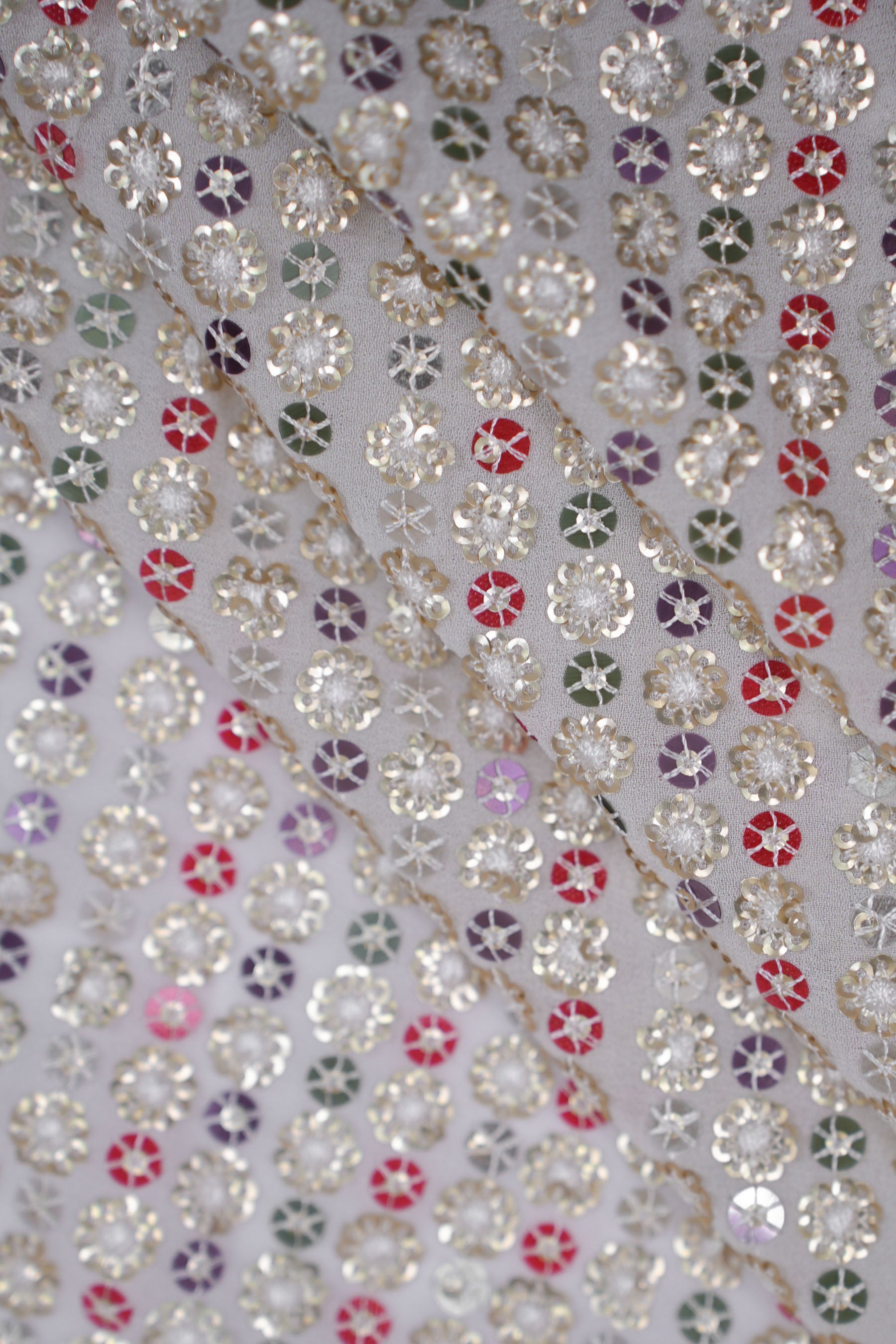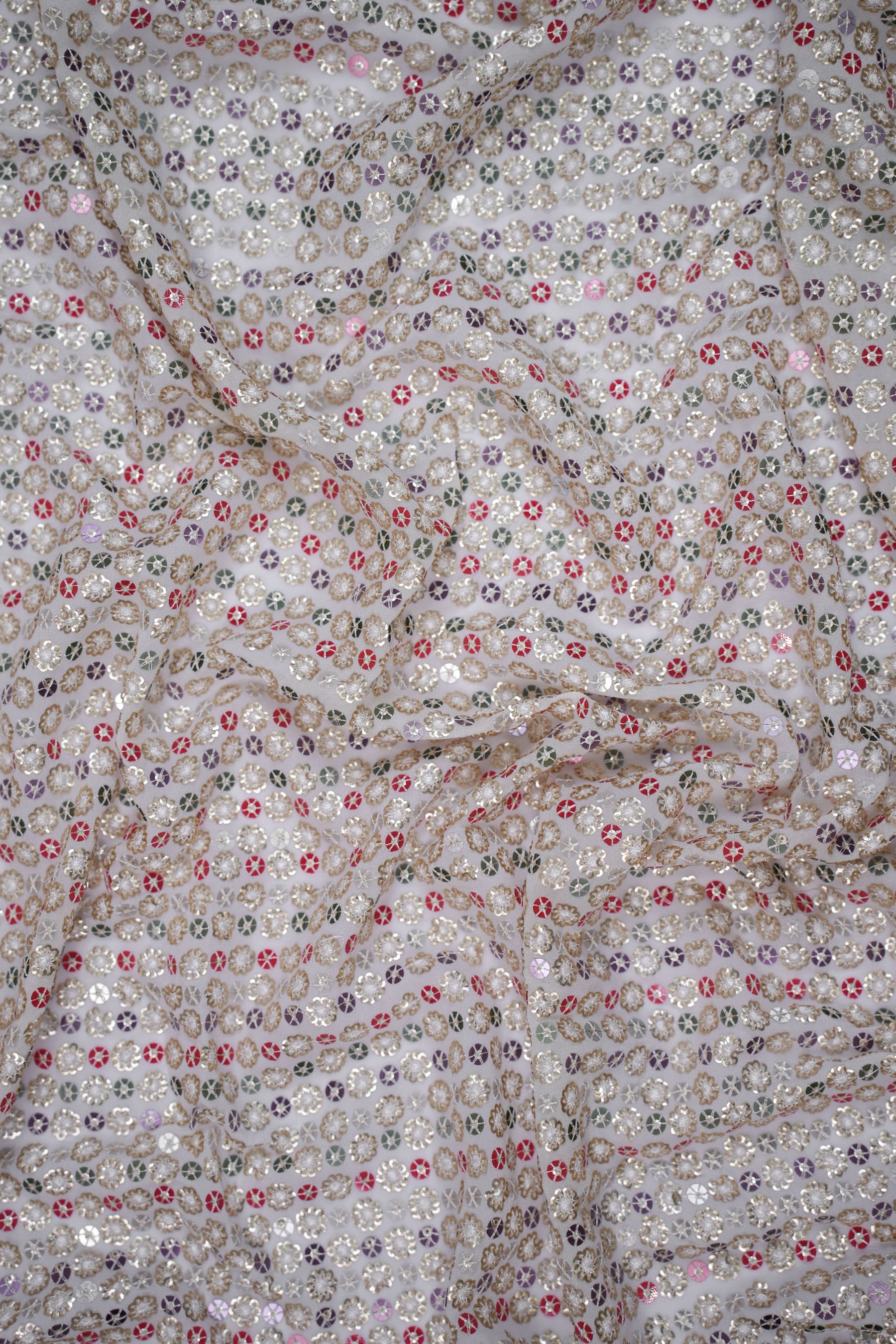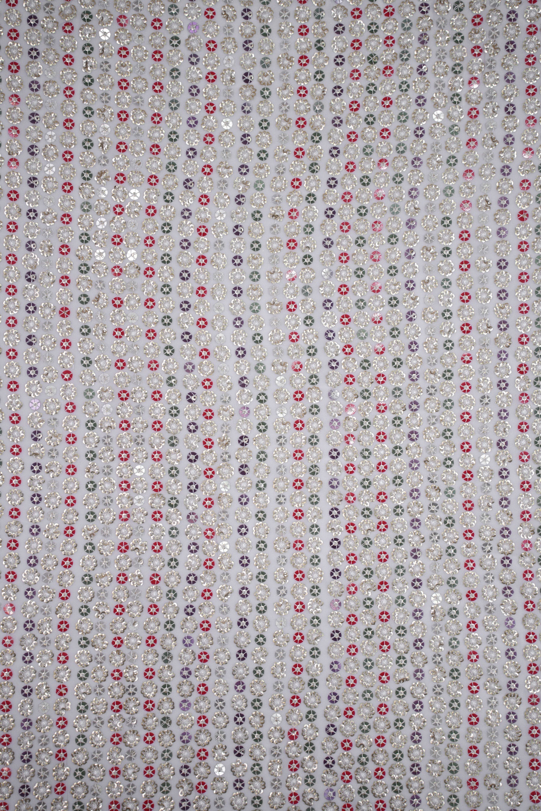 Each floral sequin cluster is bordered with fine threadwork, giving it a 3D jeweled look. The alignment in vertical rows lends the fabric a structured elegance while the mix of colors ensures a rich, festive aura.