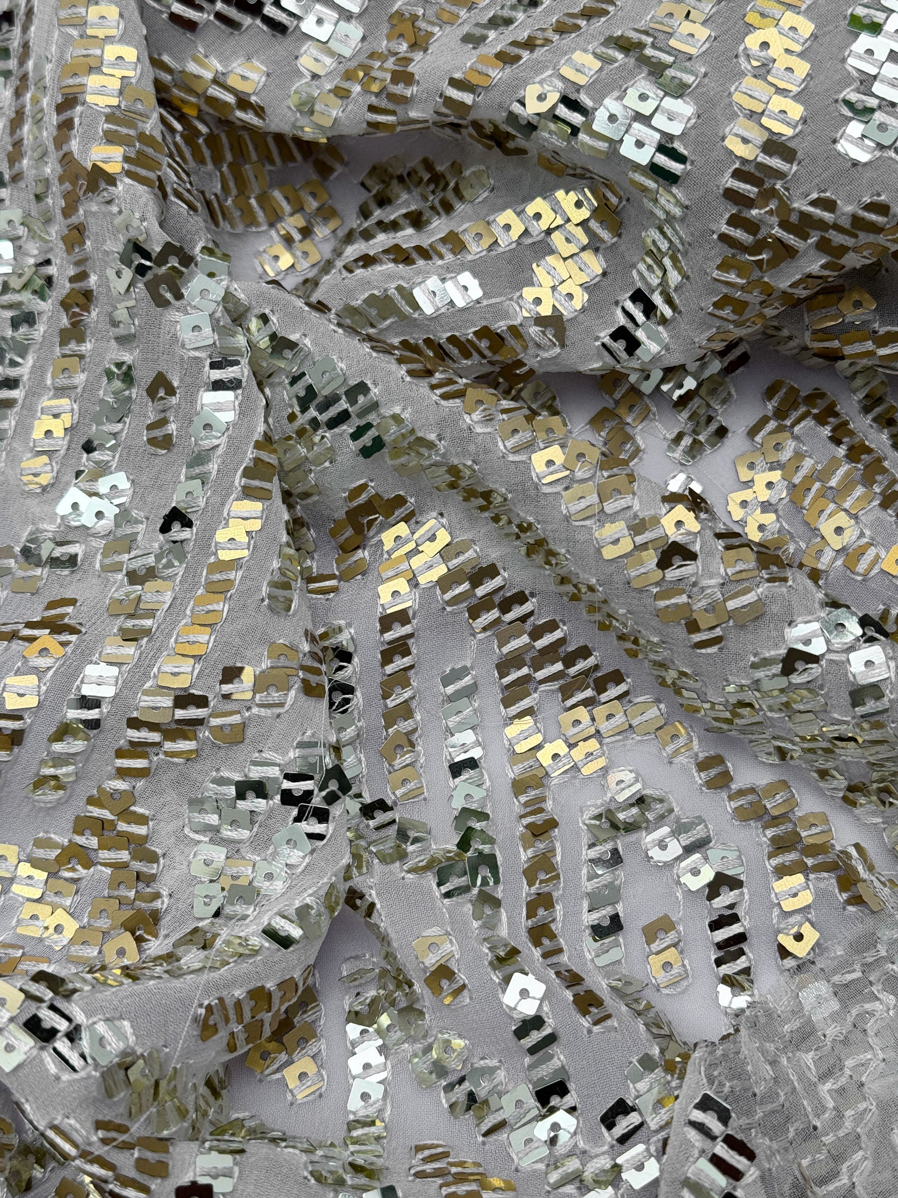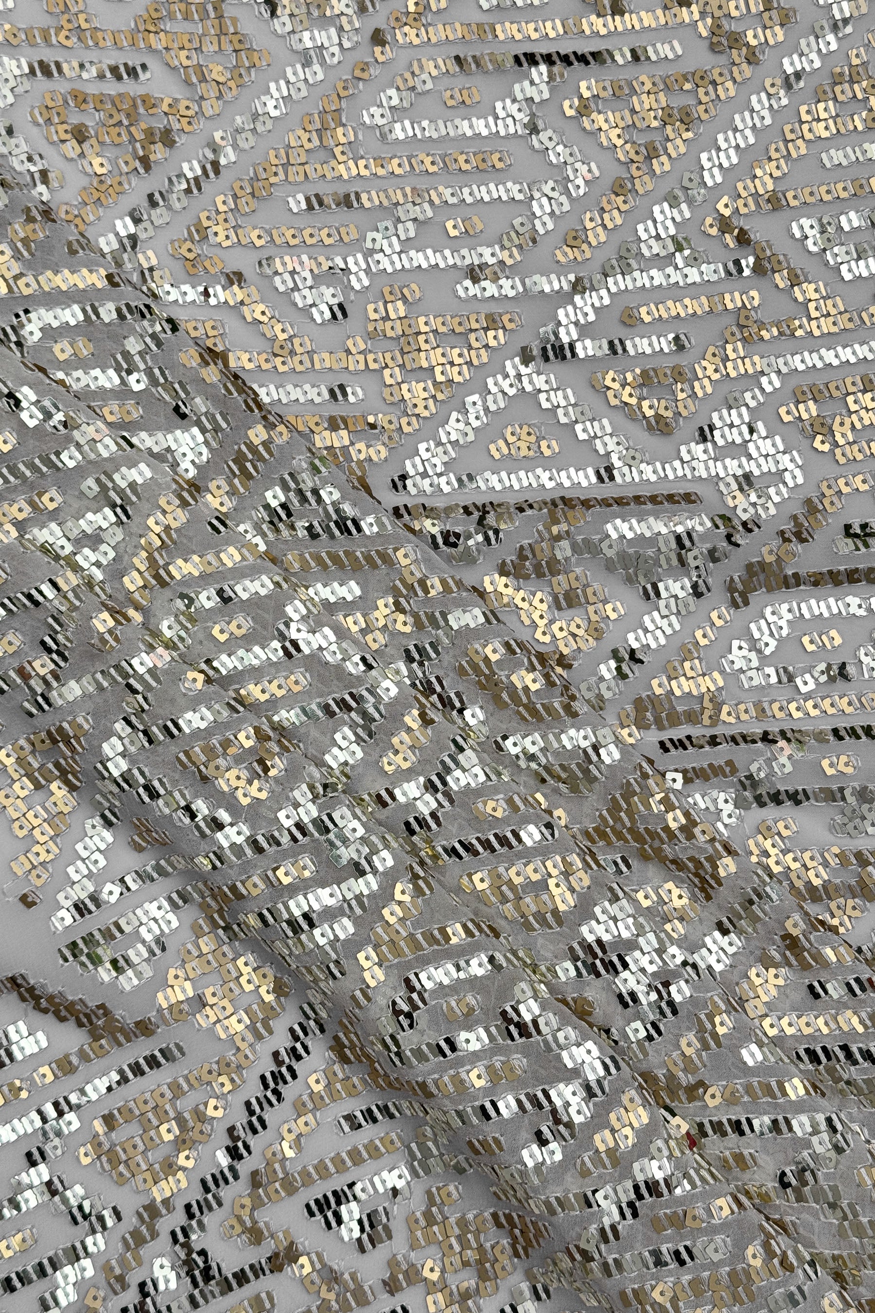 This stunning fabric features a soft net or organza base beautifully adorned with dense geometric embroidery and silver–rose gold sequins. The intricate pattern combines angular motifs and diamond outlines, creating a rich mosaic effect that shimmers gracefully under light. Its reflective surface gives a three-dimensional sheen, while the slightly translucent base maintains elegance and sophistication. The overall look is modern yet festive, blending glamour with timeless detailing.