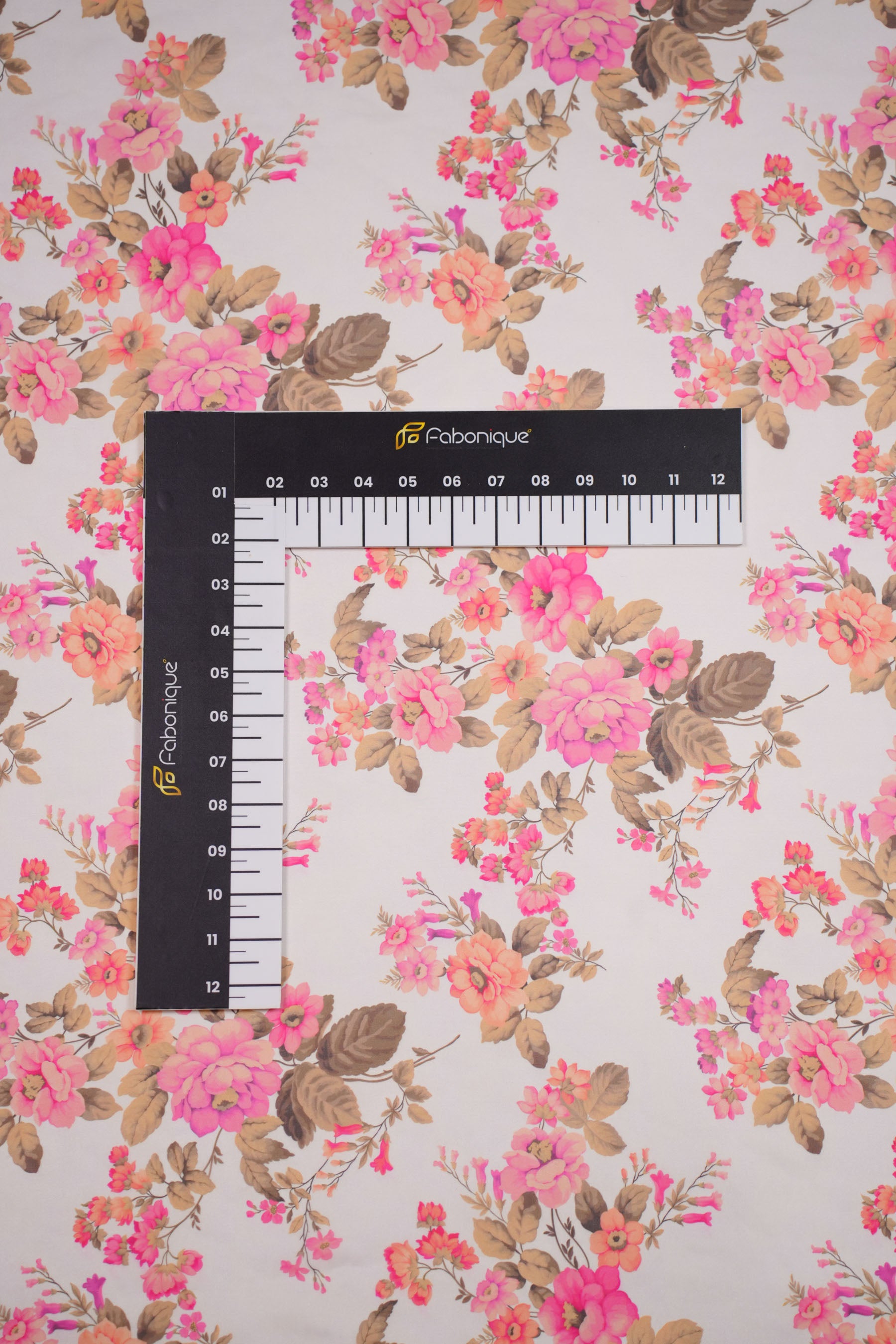 This is a lightweight, semi-sheer georgette fabric with a soft white base adorned with clusters of pink and coral florals accented by muted green and brown leaves. The watercolor-style floral print creates a romantic, vintage garden effect.